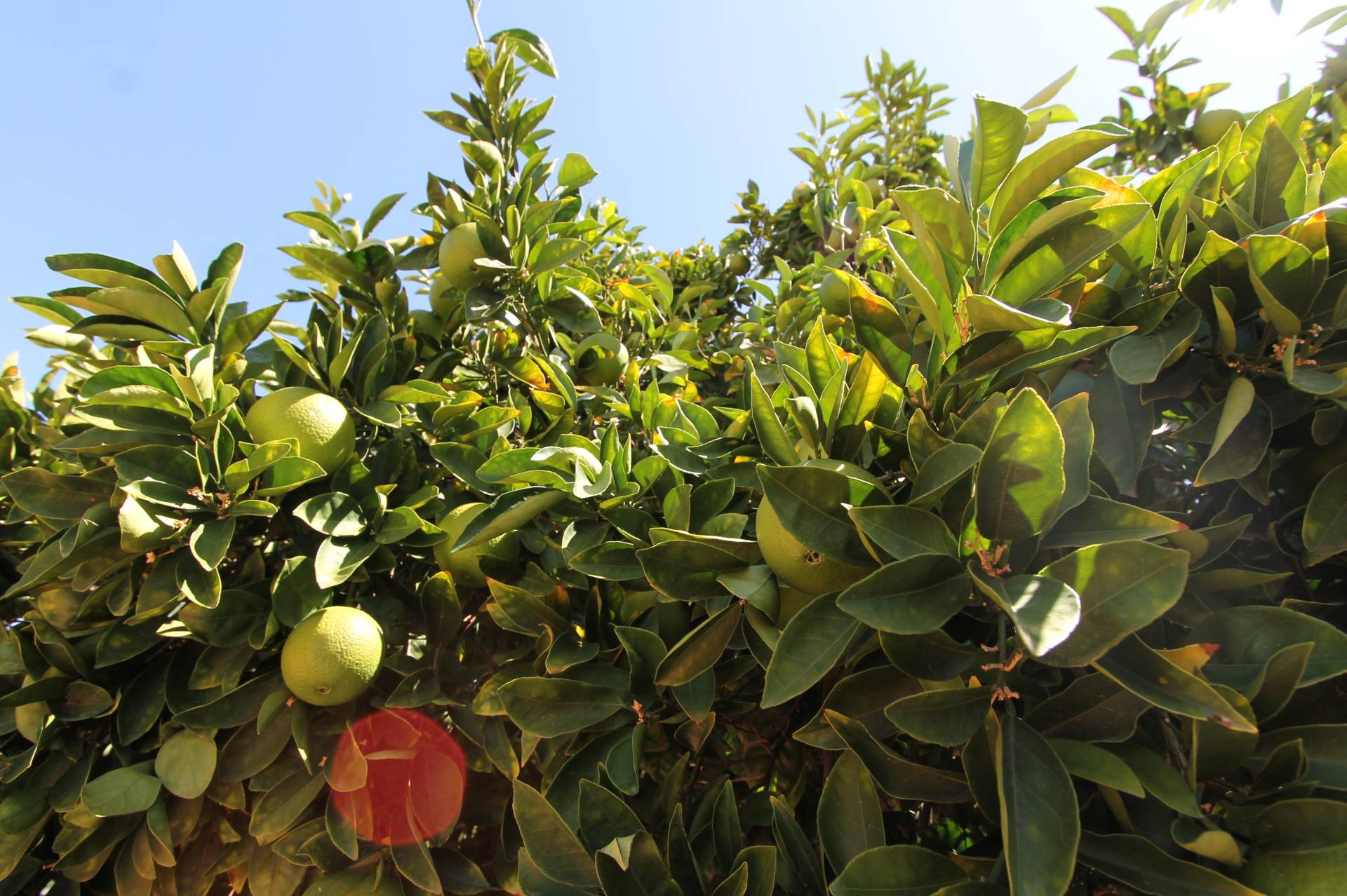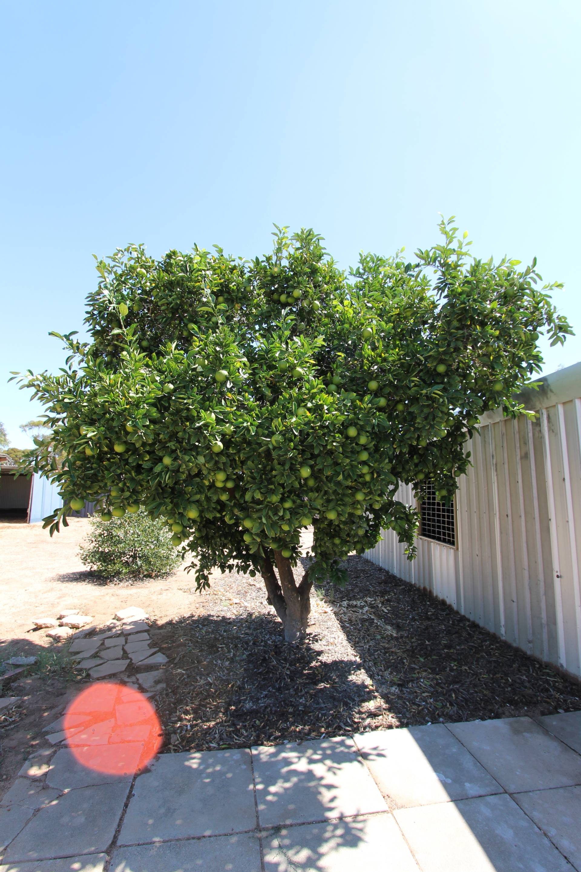The gardens are native and easy care, including a large, fruiting orange tree.