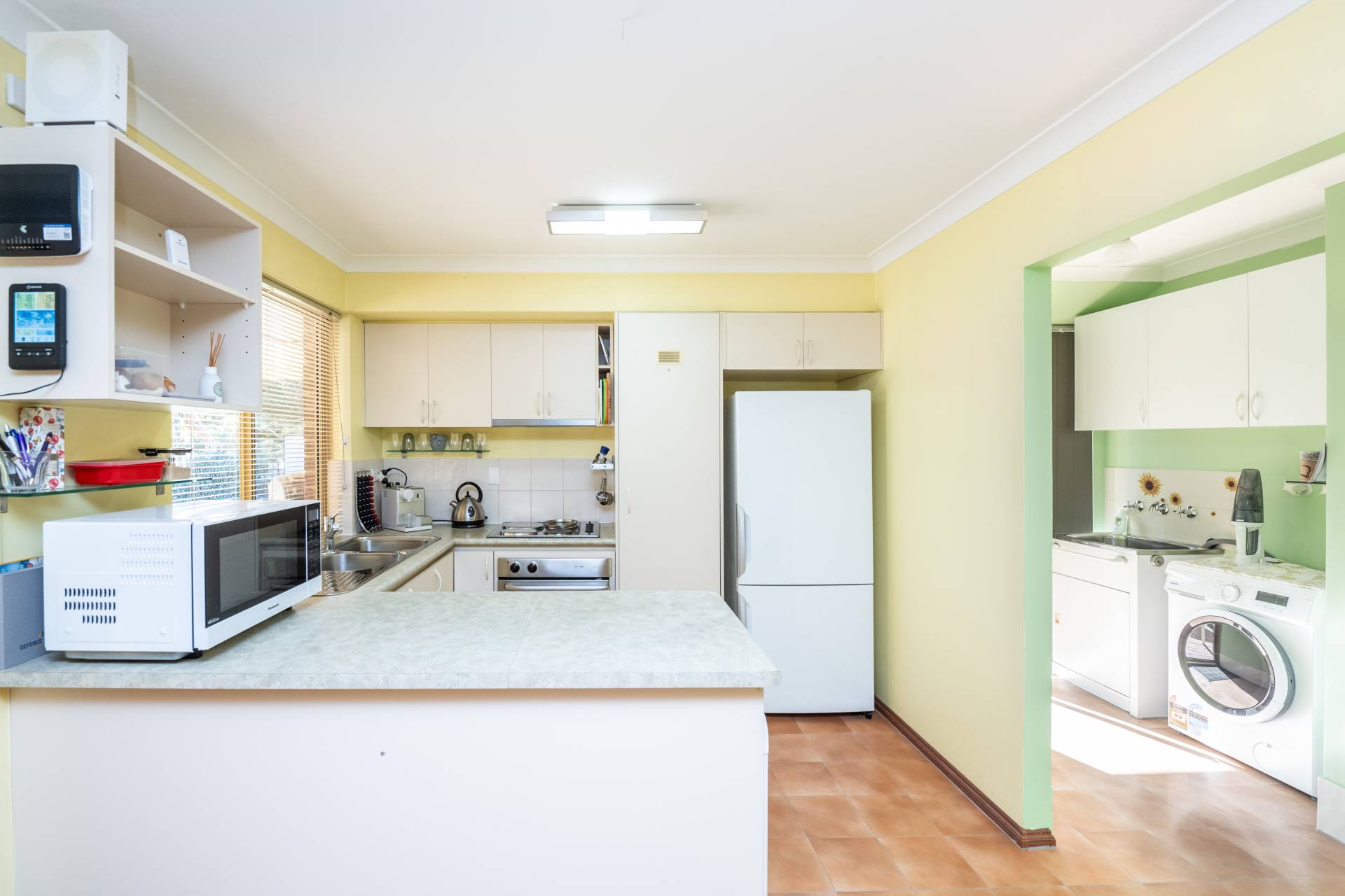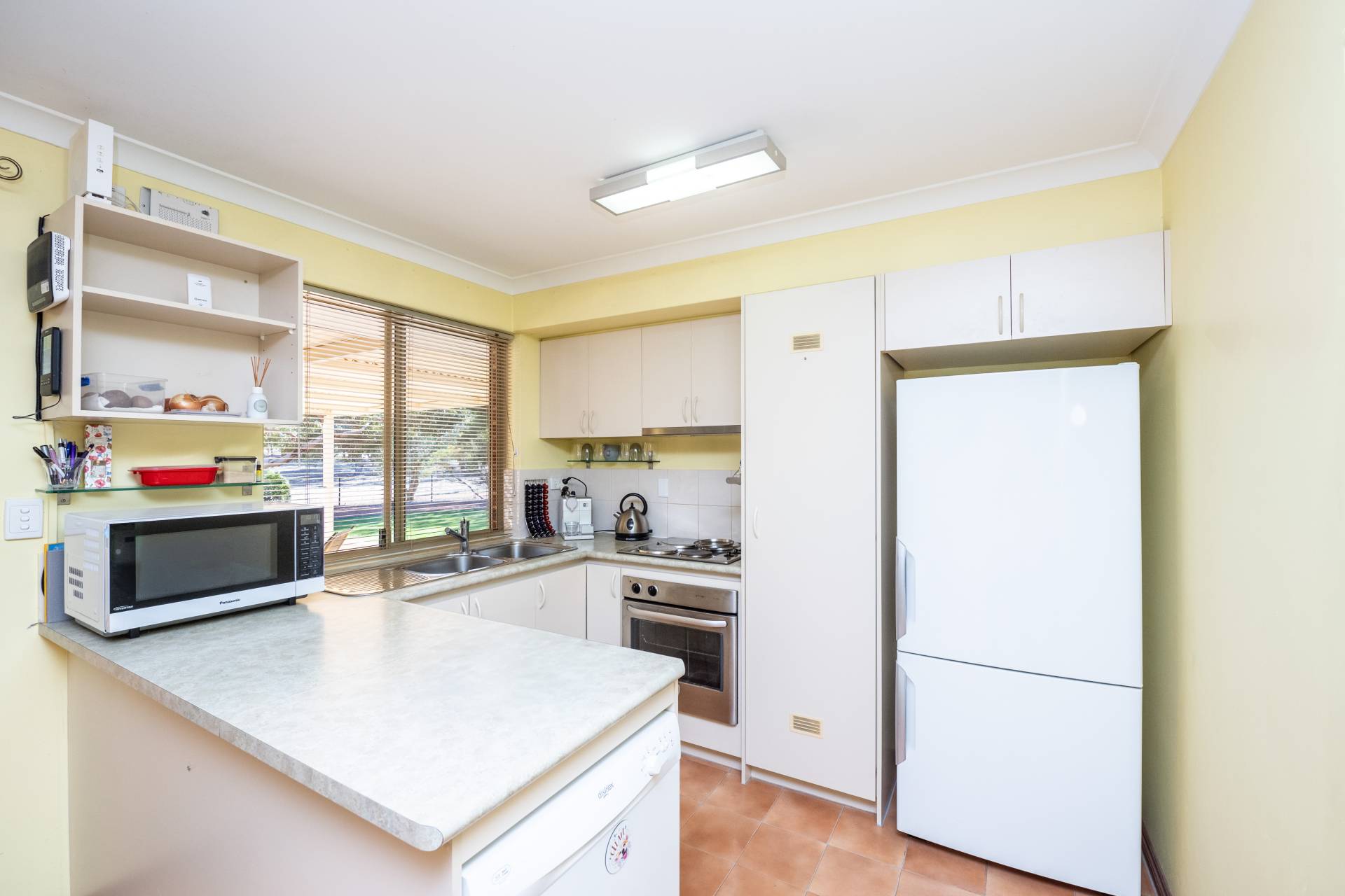 The home features ducted reverse cycle air conditioning to all rooms, ensuring year-round comfort. The well-equipped kitchen includes electric hotplates, an oven, and a dishwasher, making meal preparation a breeze.