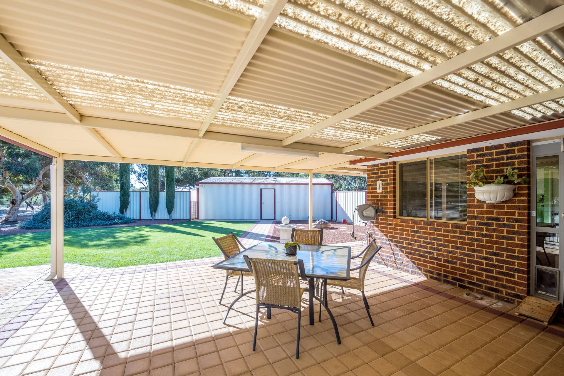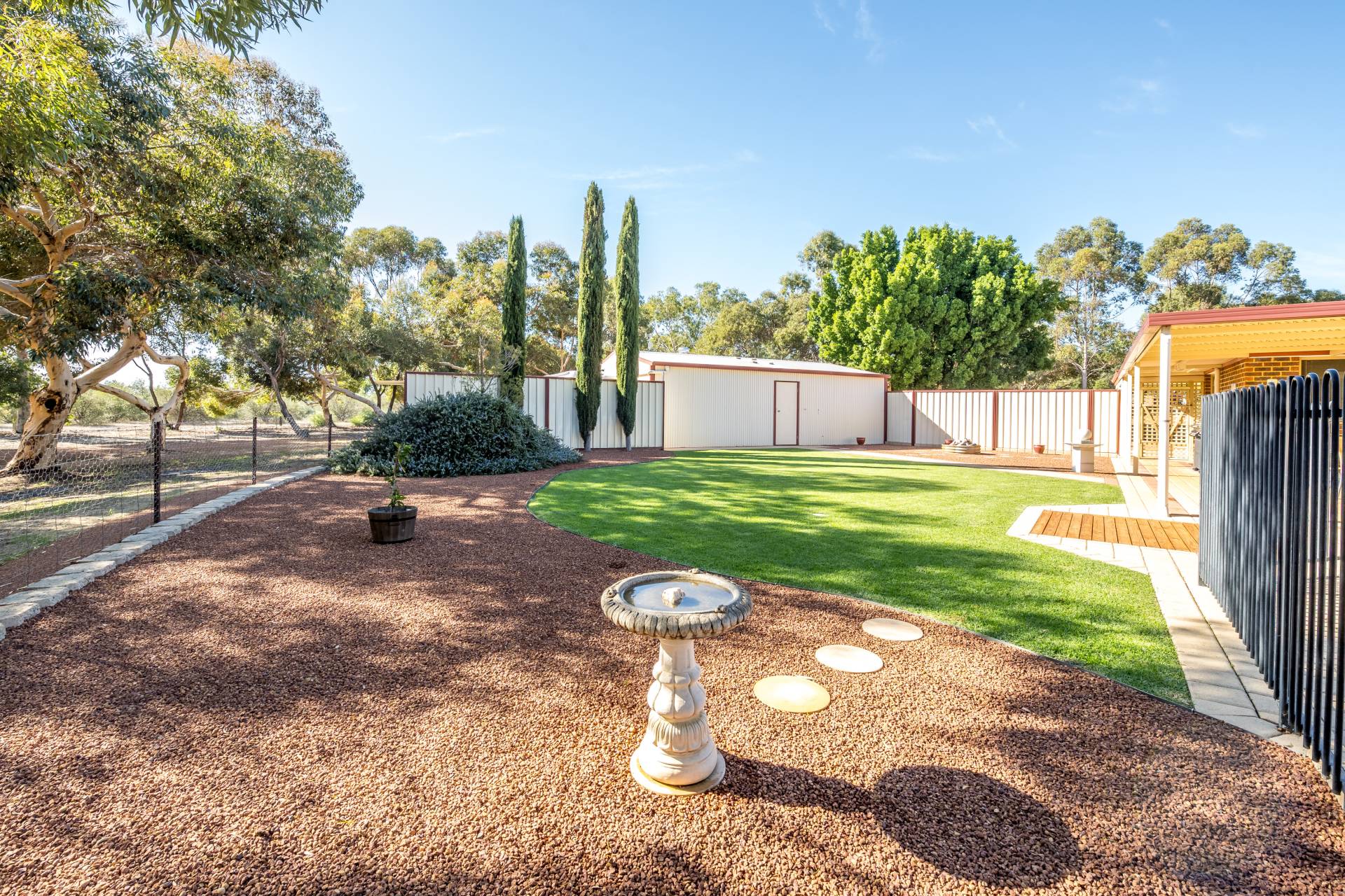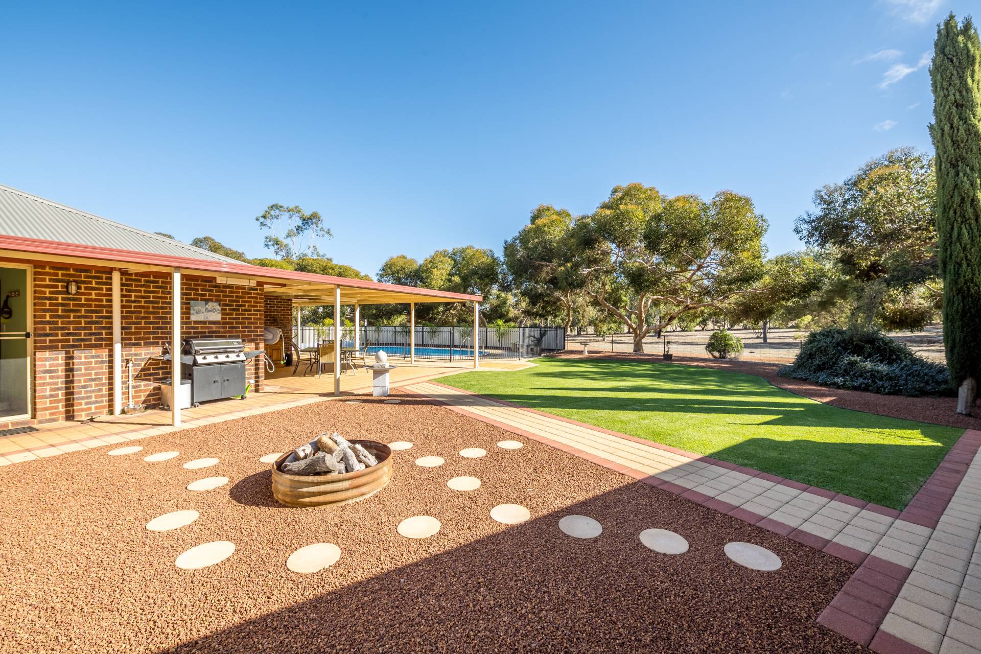 Step outside and be greeted by a stunning backyard oasis. A large veranda/patio area overlooks lush Kikuyu lawn and a 9 x 4.5m fully fenced and gated below-ground swimming pool, with solar blanket on roller, all surrounded by gravel mulched garden beds for low maintenance. A gravel fire pit area with a rustic fire pit creates the perfect setting for cozy evenings under the stars.