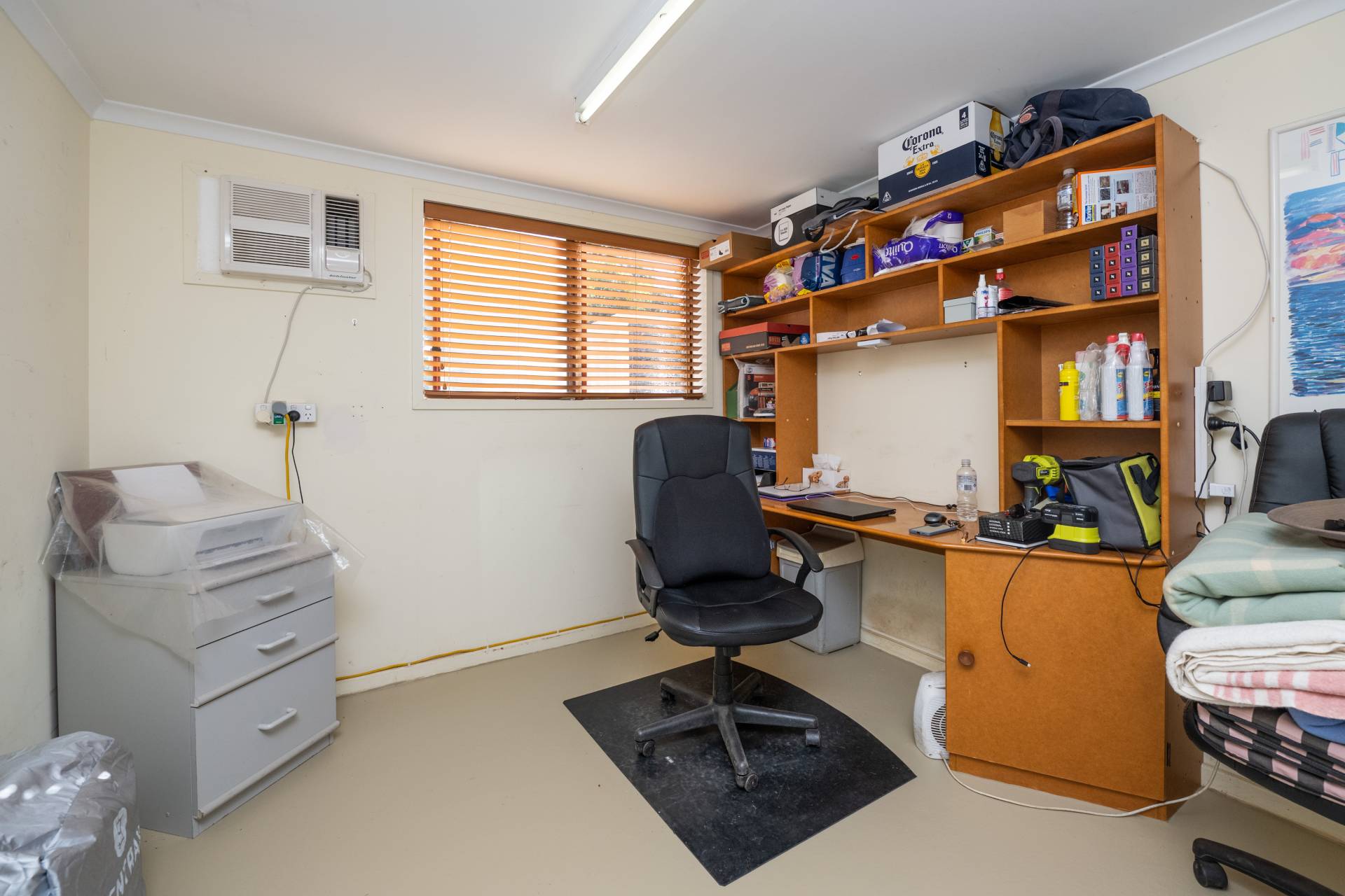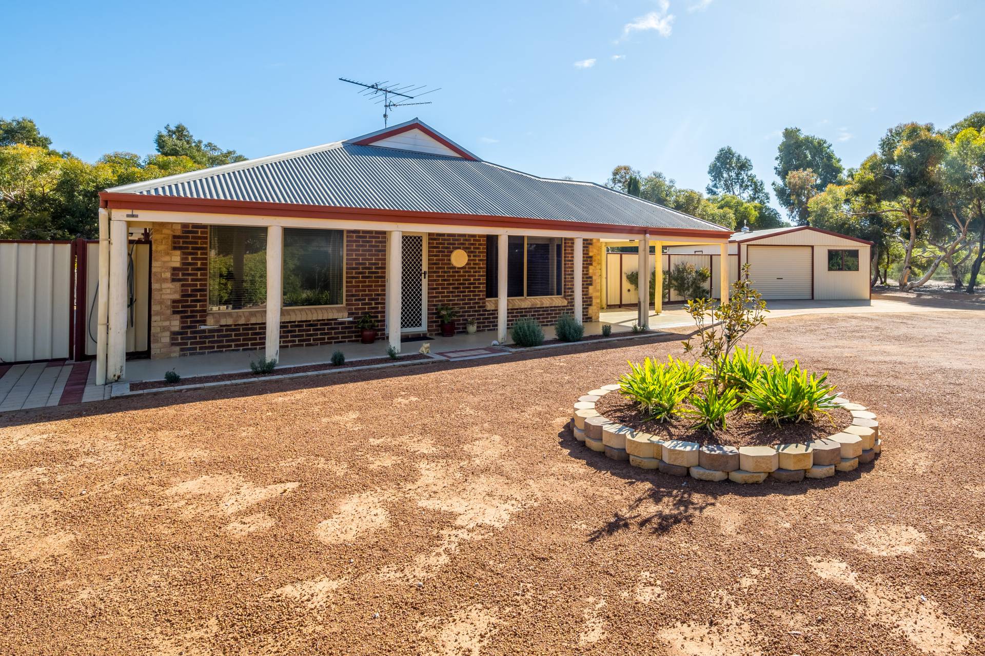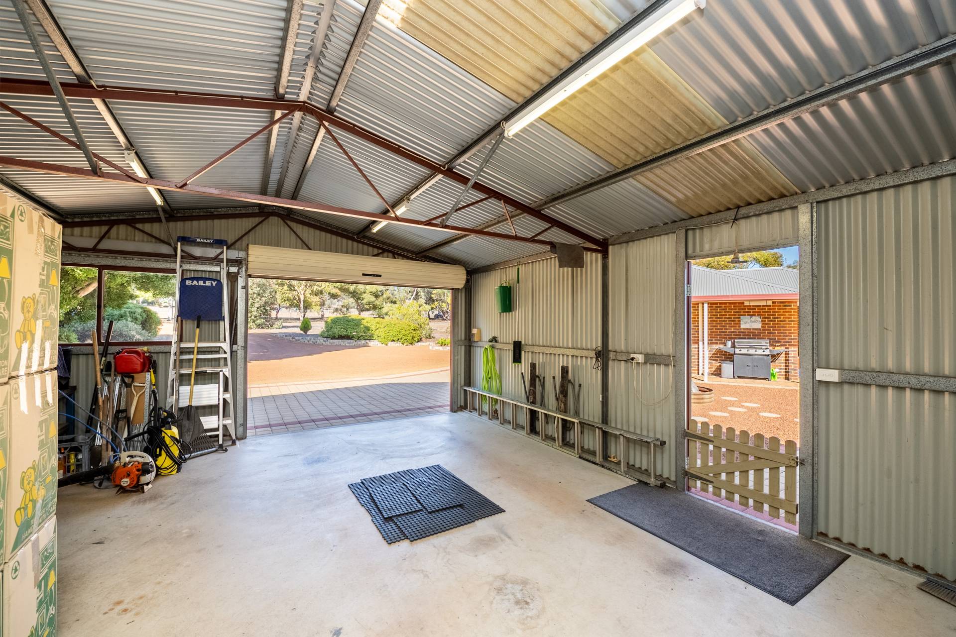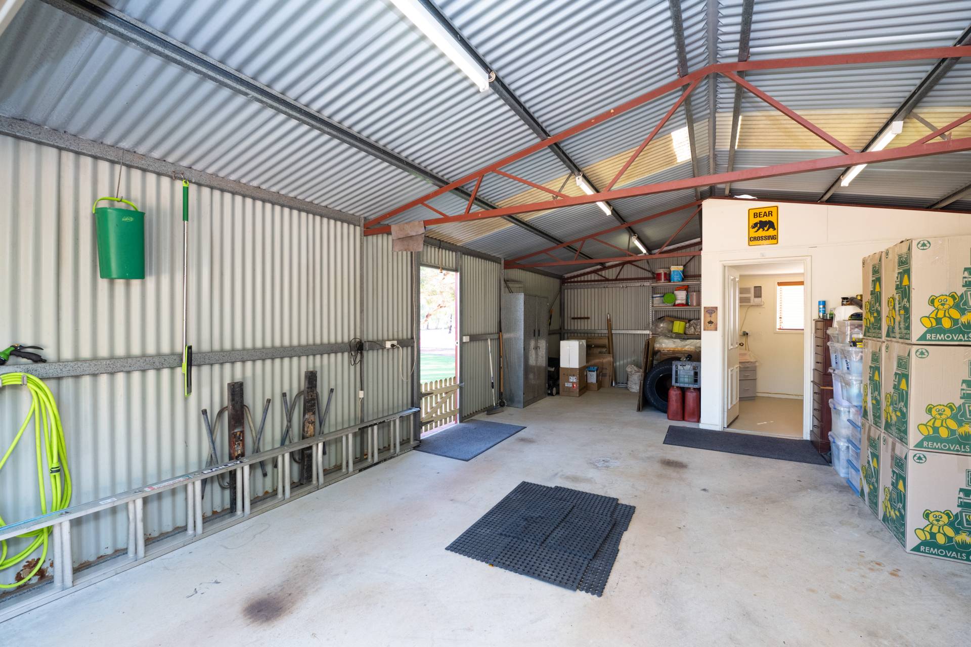• A 9 x 6m Colourbond garage with single roller door, concrete floor, 240 V power and lighting and a 3 x 3m insulated and air-conditioned office/store.