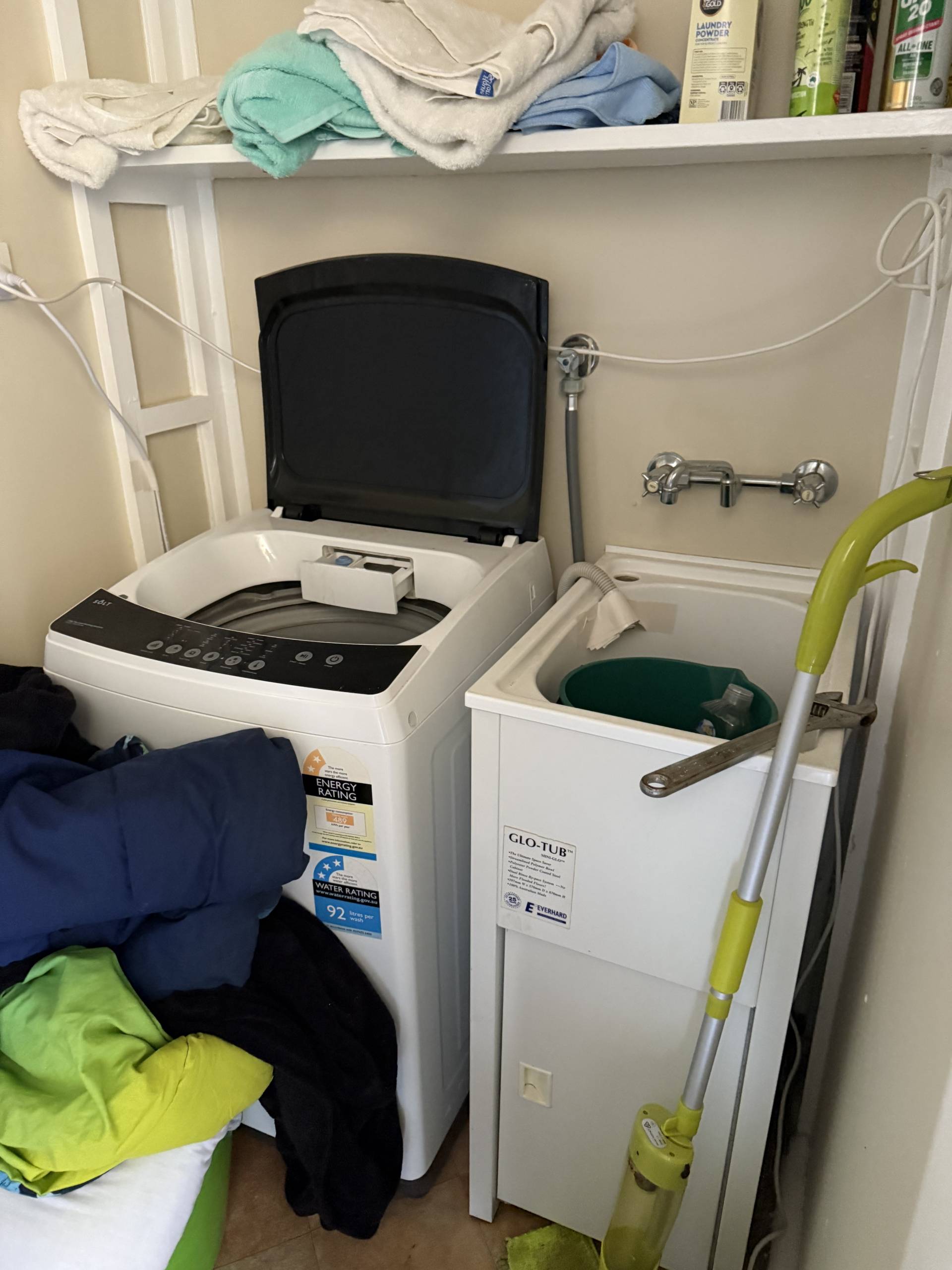 Your bathroom and laundry are located off of this room. The laundry has space for your washing machine with a trough next to it. The bathroom features a shower over the bath, vanity for storage and a toilet.