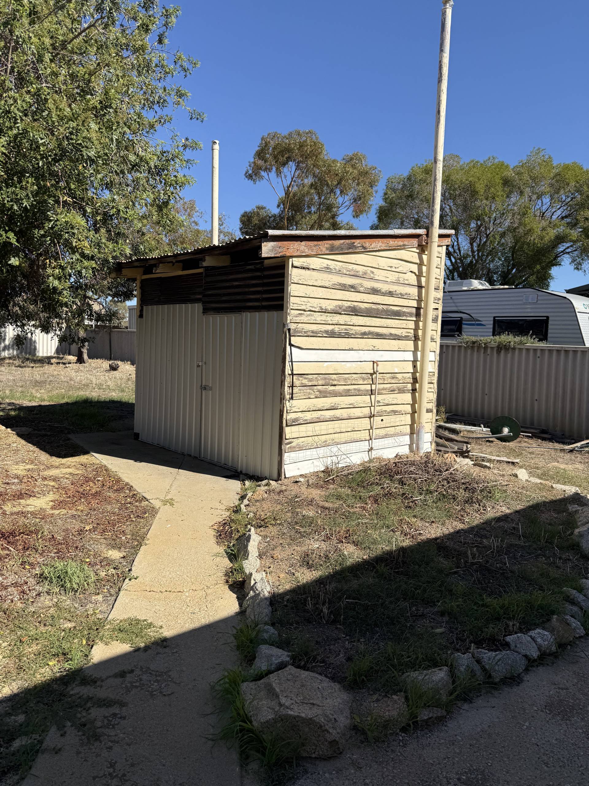 The rear yard is low maintenance with an additional outbuilding, a handy space to store items. An additional toilet is located next to this building.