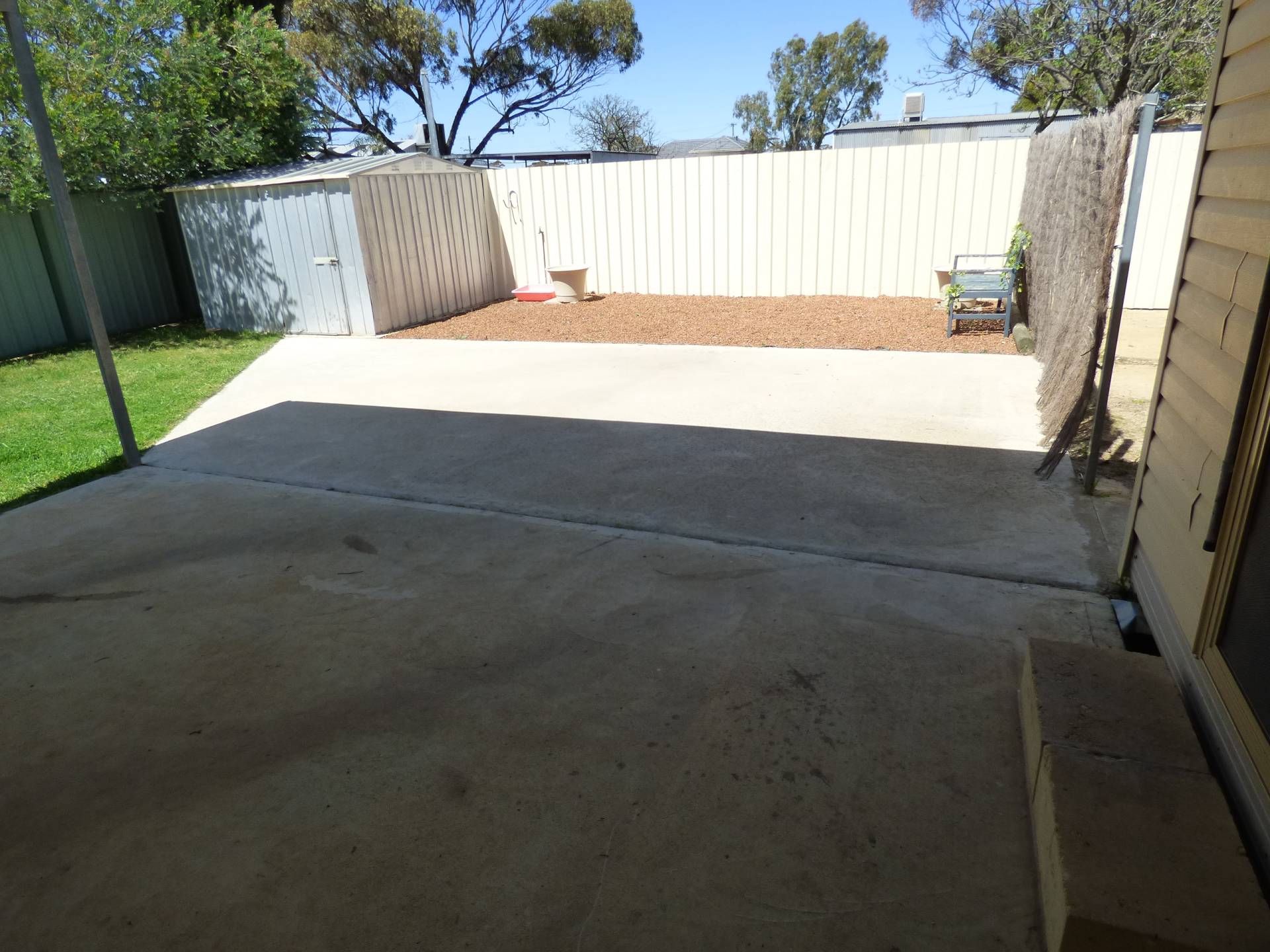 The rear yard has a garden shed, patio and grassed area.