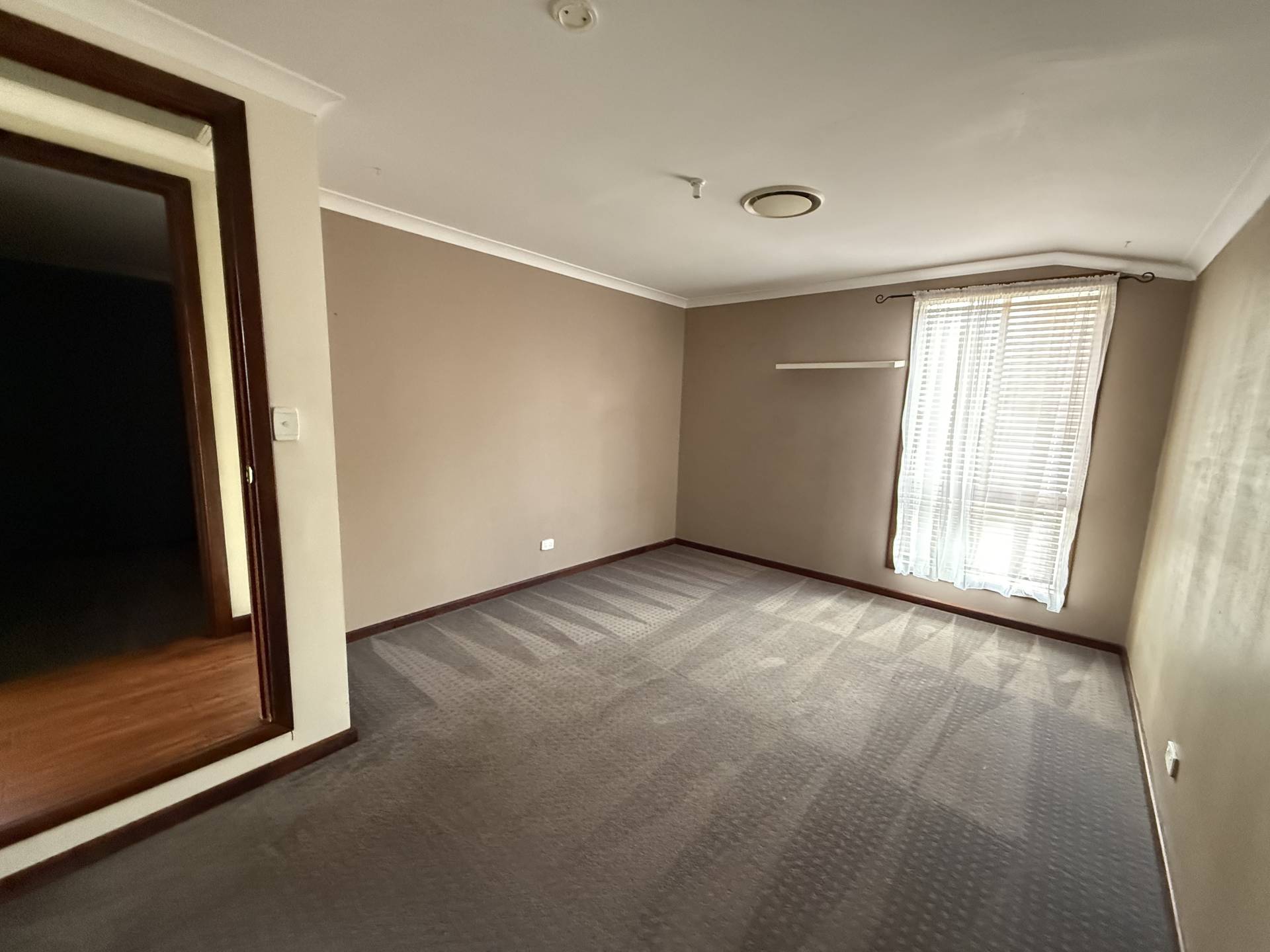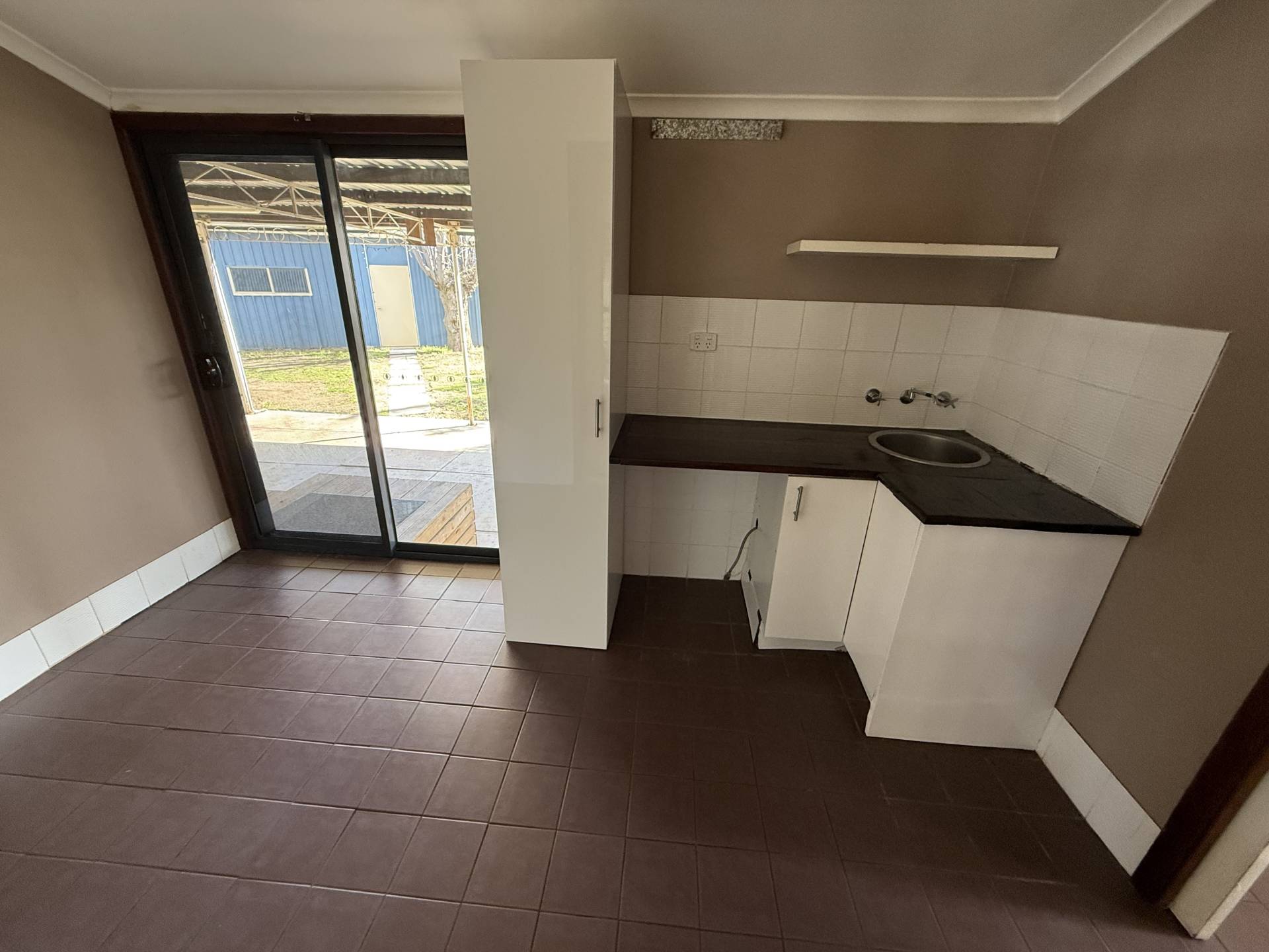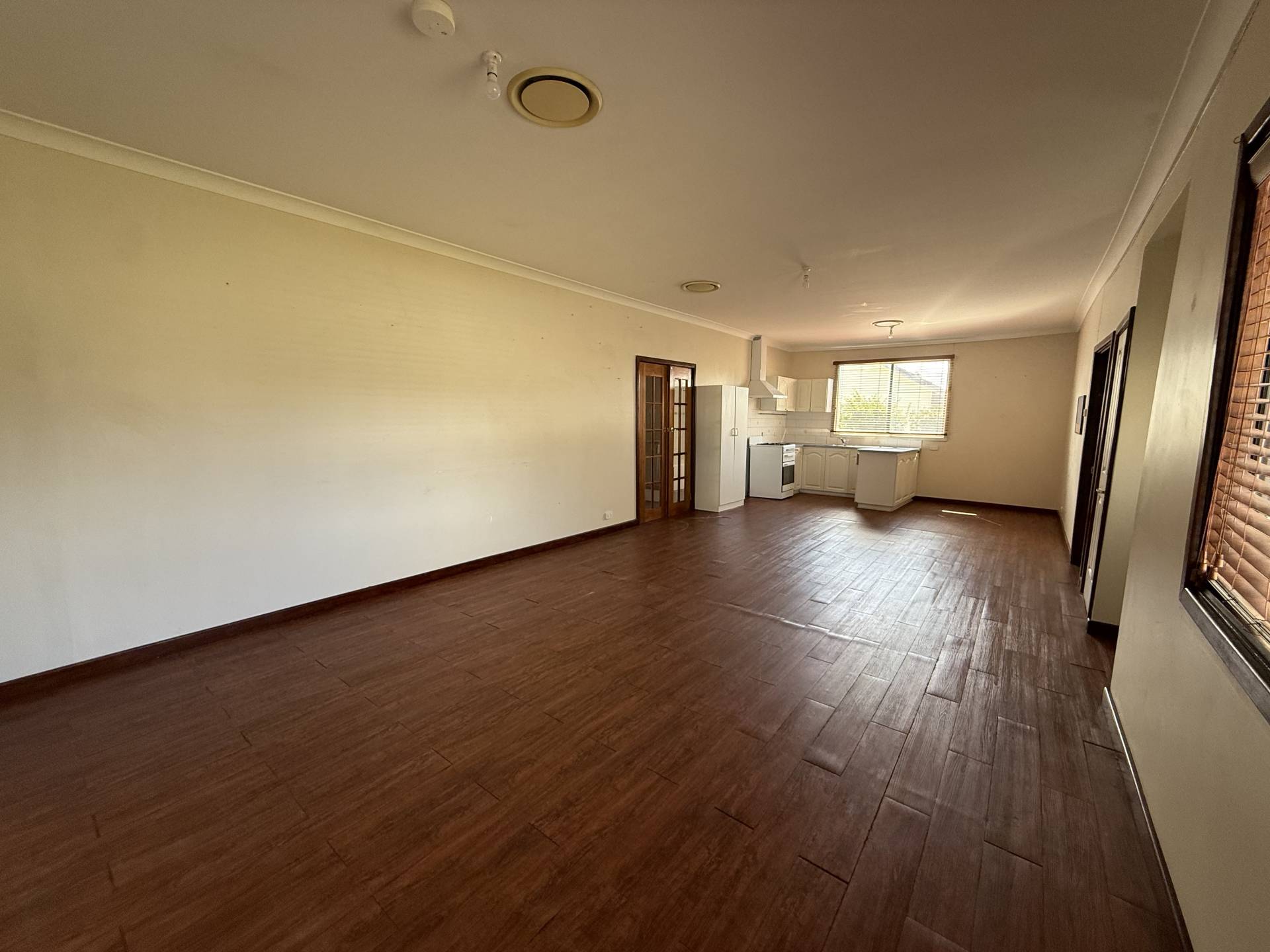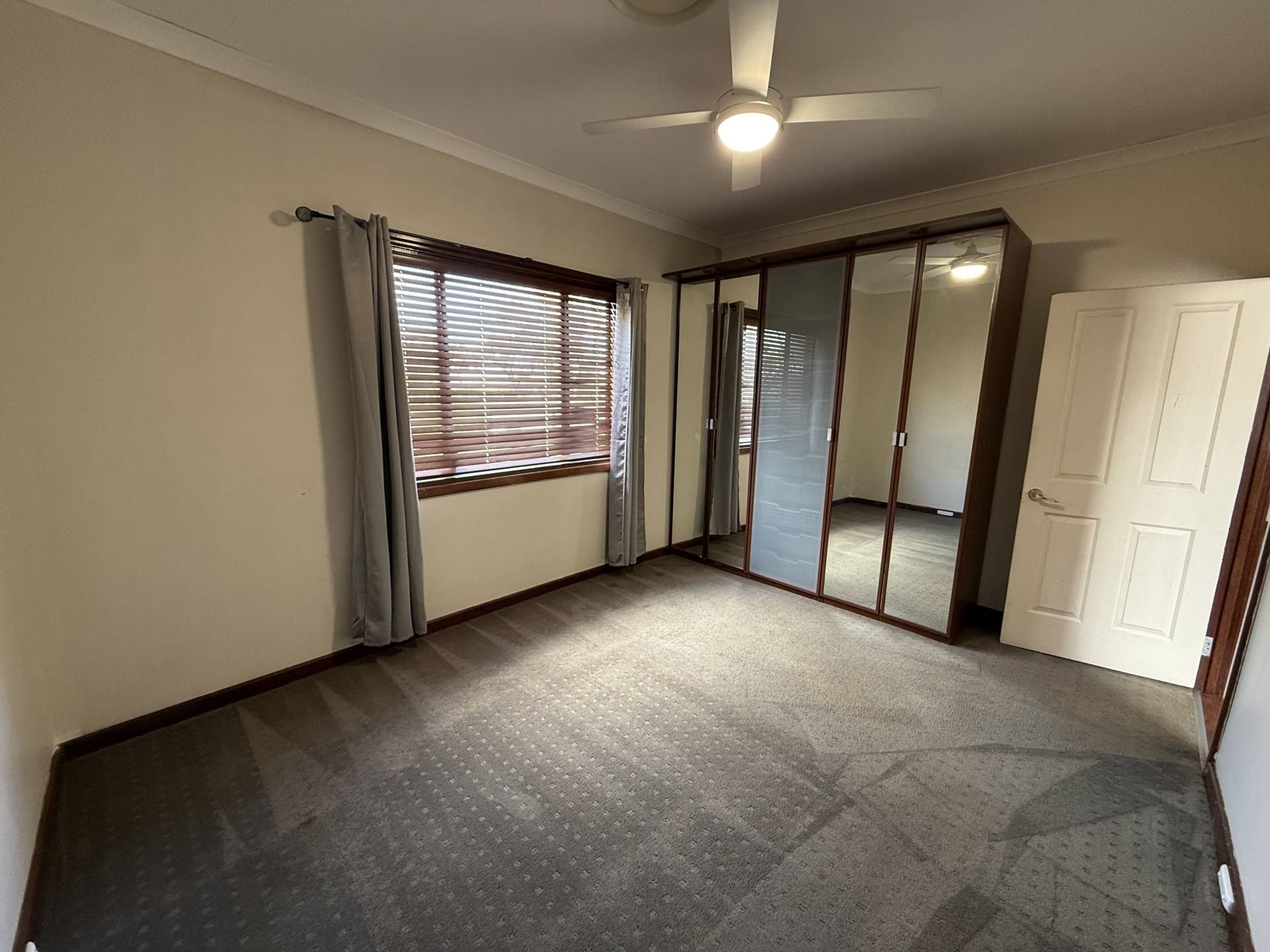 Off the kitchen, you have the master bedroom with timber robes and a ceiling fan.