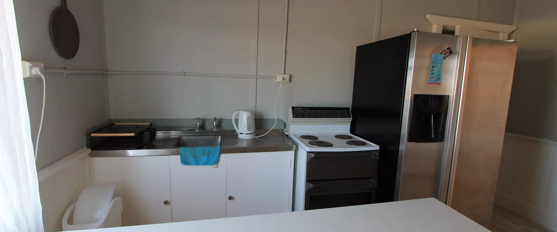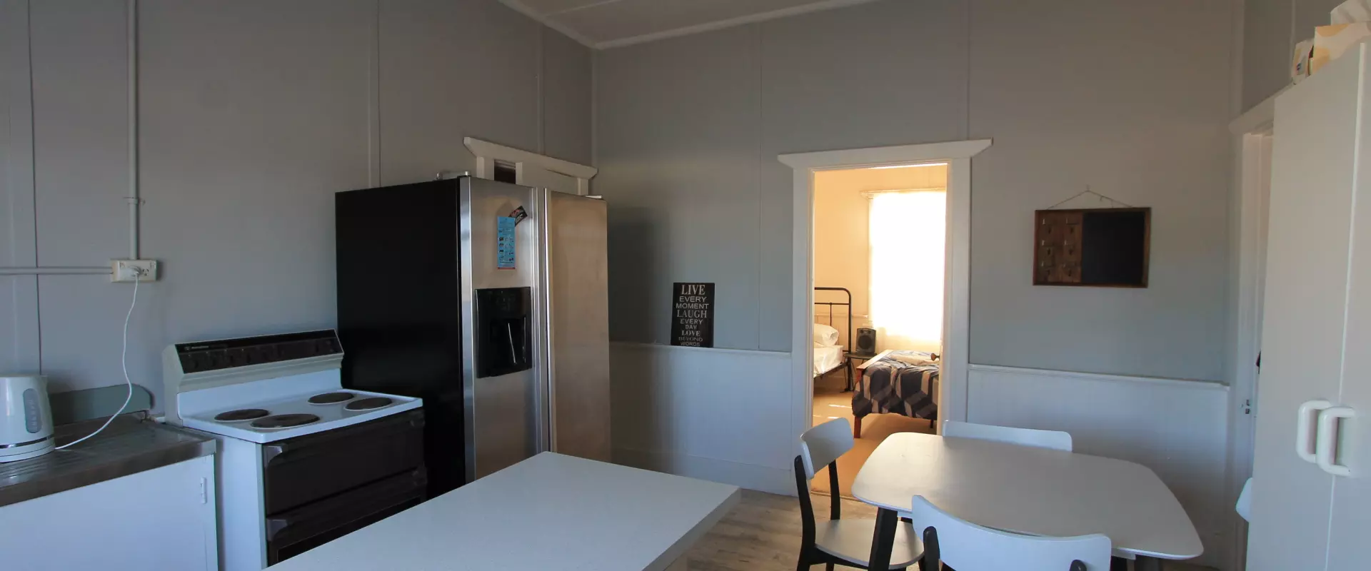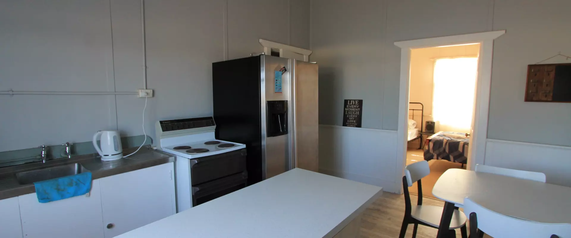 To the middle of the home is your kitchen / dining area. The kitchen includes an island bench with breakfast bar, electric cooking and sink. The second bedroom is off the kitchen area.