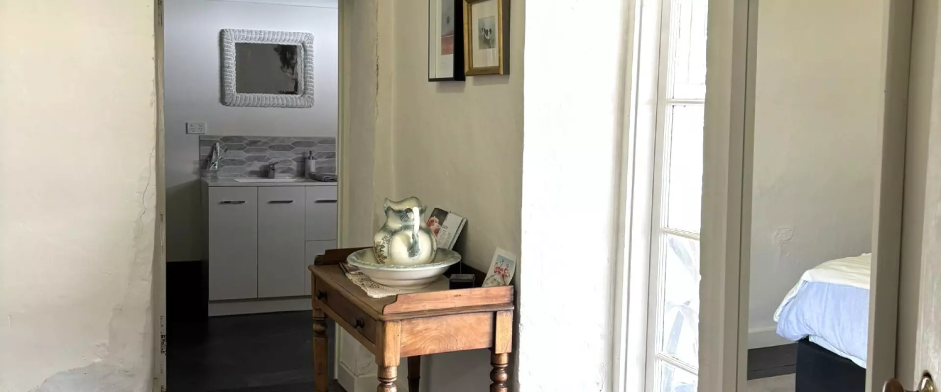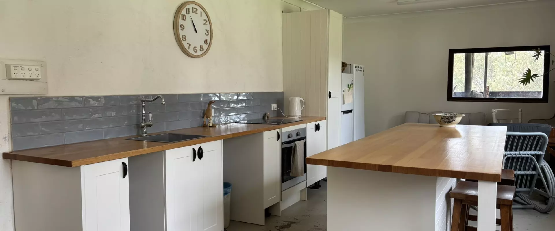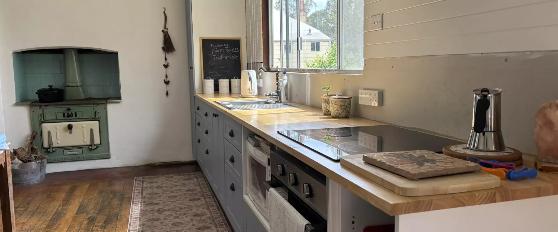 Out the back, you’ll find the original workshop, now thoughtfully converted into extra accommodation. Complete with its own kitchen, dining area, and bedroom, it exudes rustic warmth — from the original windows to the charming rustic concrete floors.