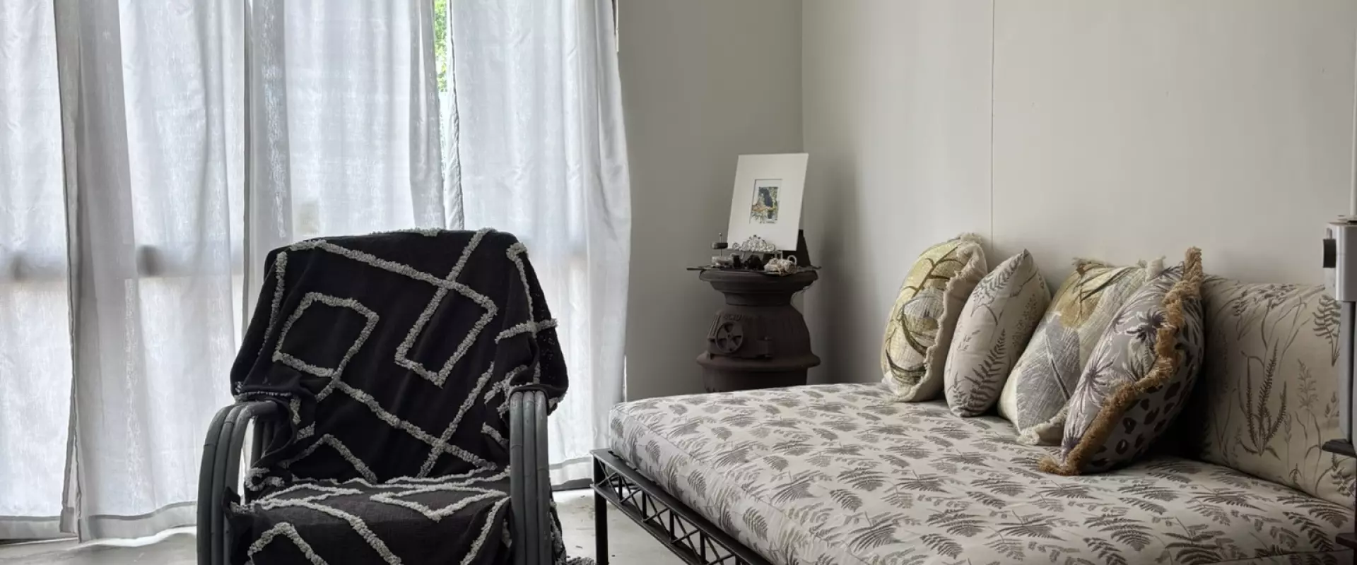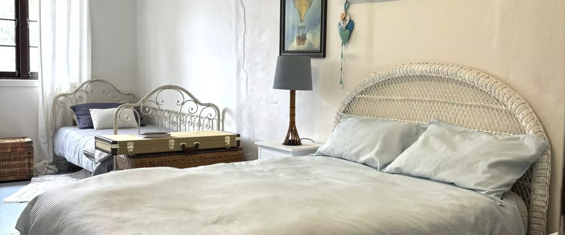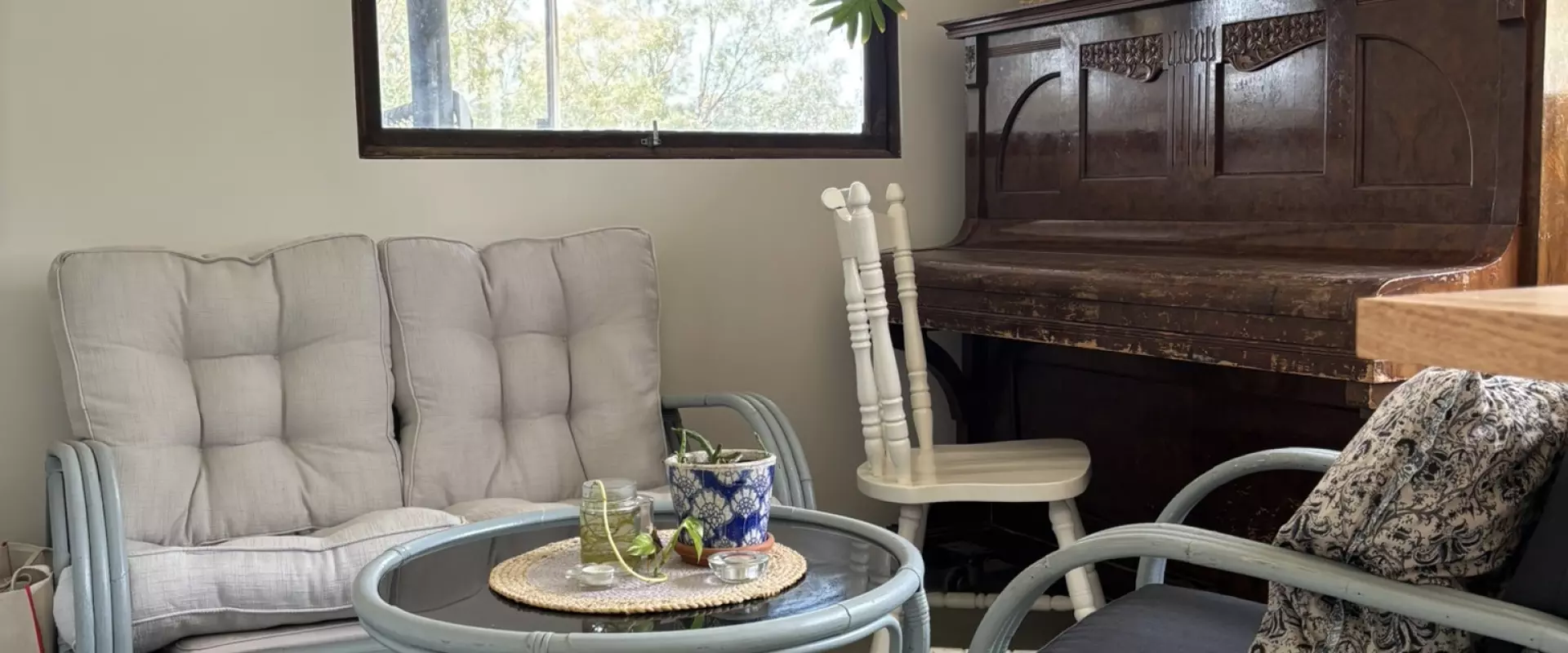 Out the back, you’ll find the original workshop, now thoughtfully converted into extra accommodation. Complete with its own kitchen, dining area, and bedroom, it exudes rustic warmth — from the original windows to the charming rustic concrete floors.