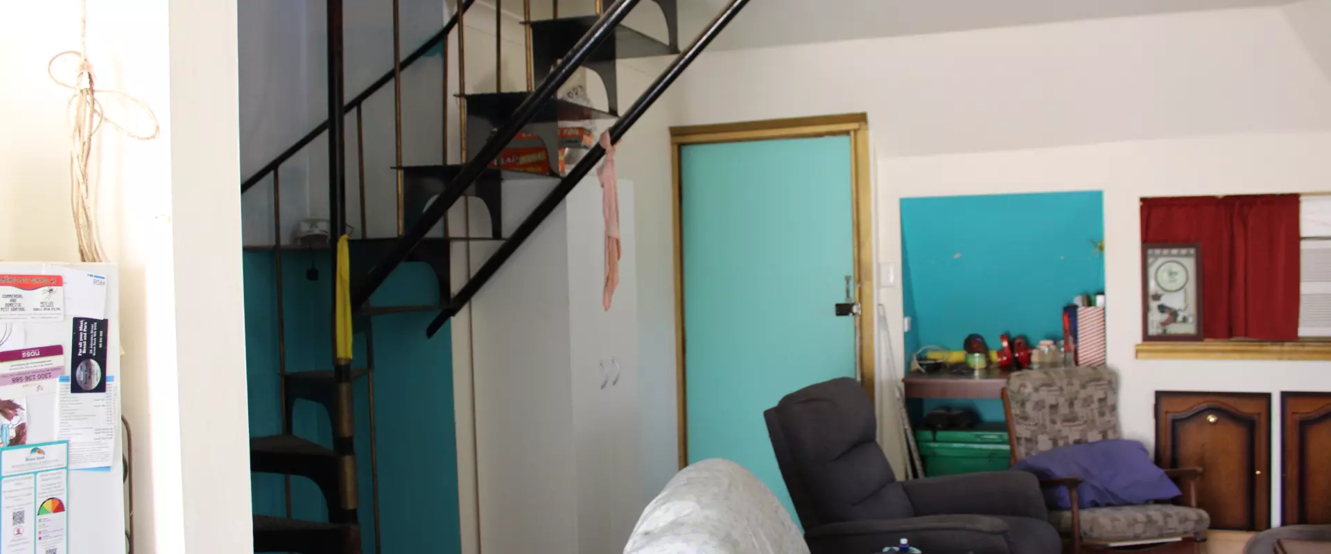 The house itself is laden with character and has built in cupboards and recesses all over.  There are 2 bedrooms, and the home has been updated to include a spacious tiled bathroom/laundry with cupboards galore.  The kitchen/lounge/bathroom and bedroom one are on the bottom floor and up the spiral staircase you discover the second bedroom which gazes out over the property in all directions.