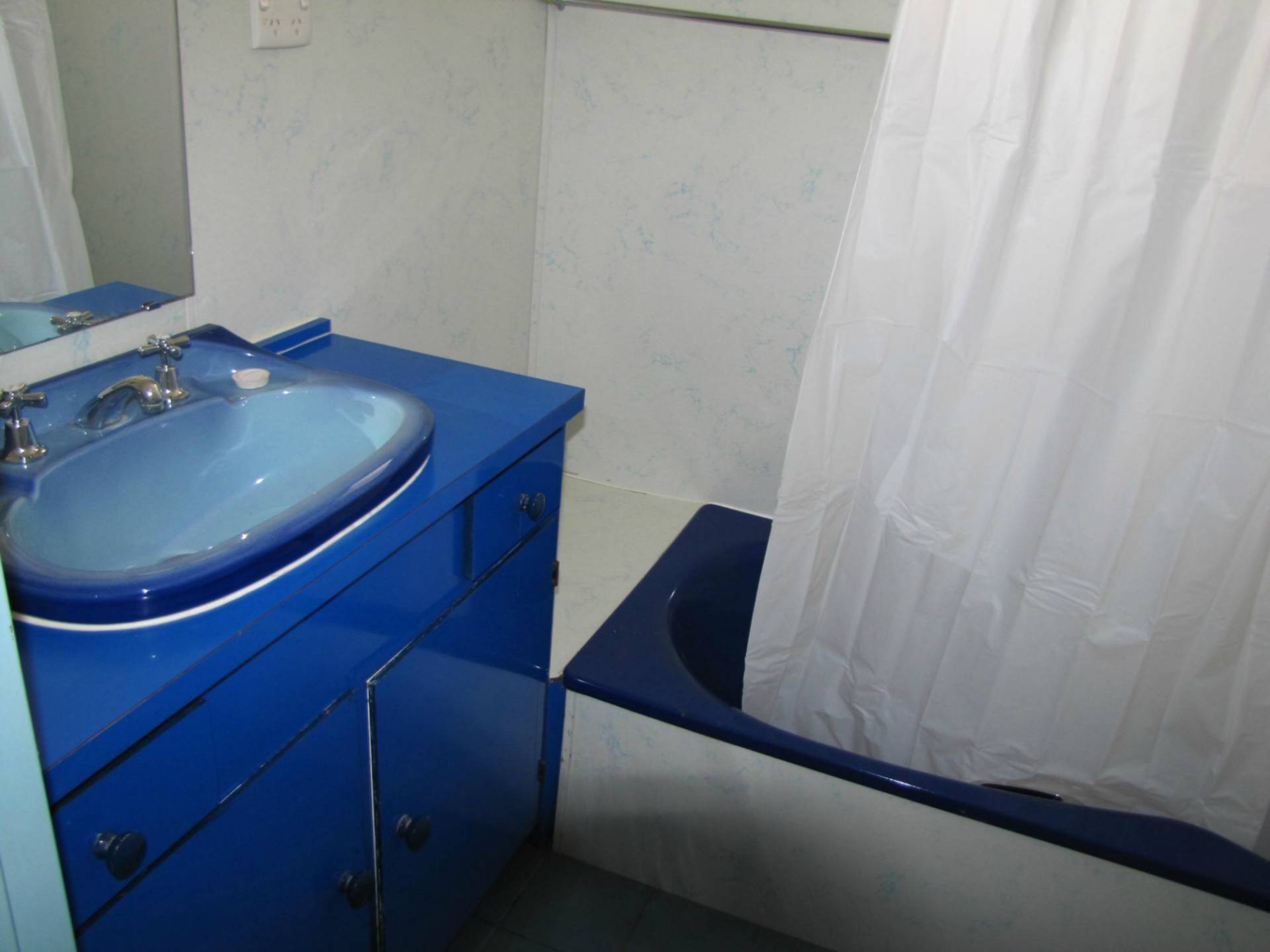 The second bathroom at the other end of the house has a shower over the bath tub and the toilet is included in the bathroom.