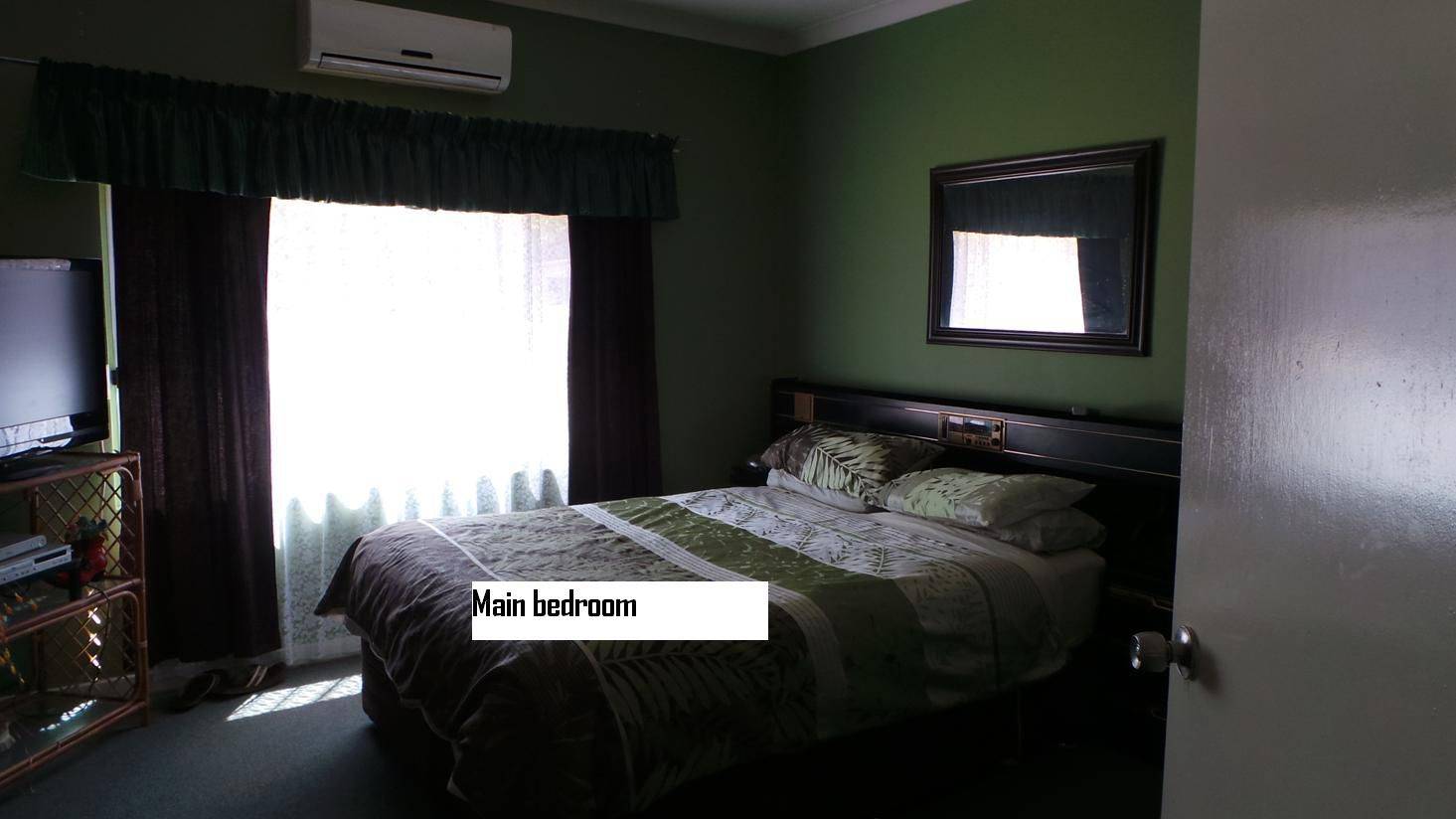 The main bedroom has an aircon, a ceiling fan , massive walk in robe room and is carpeted