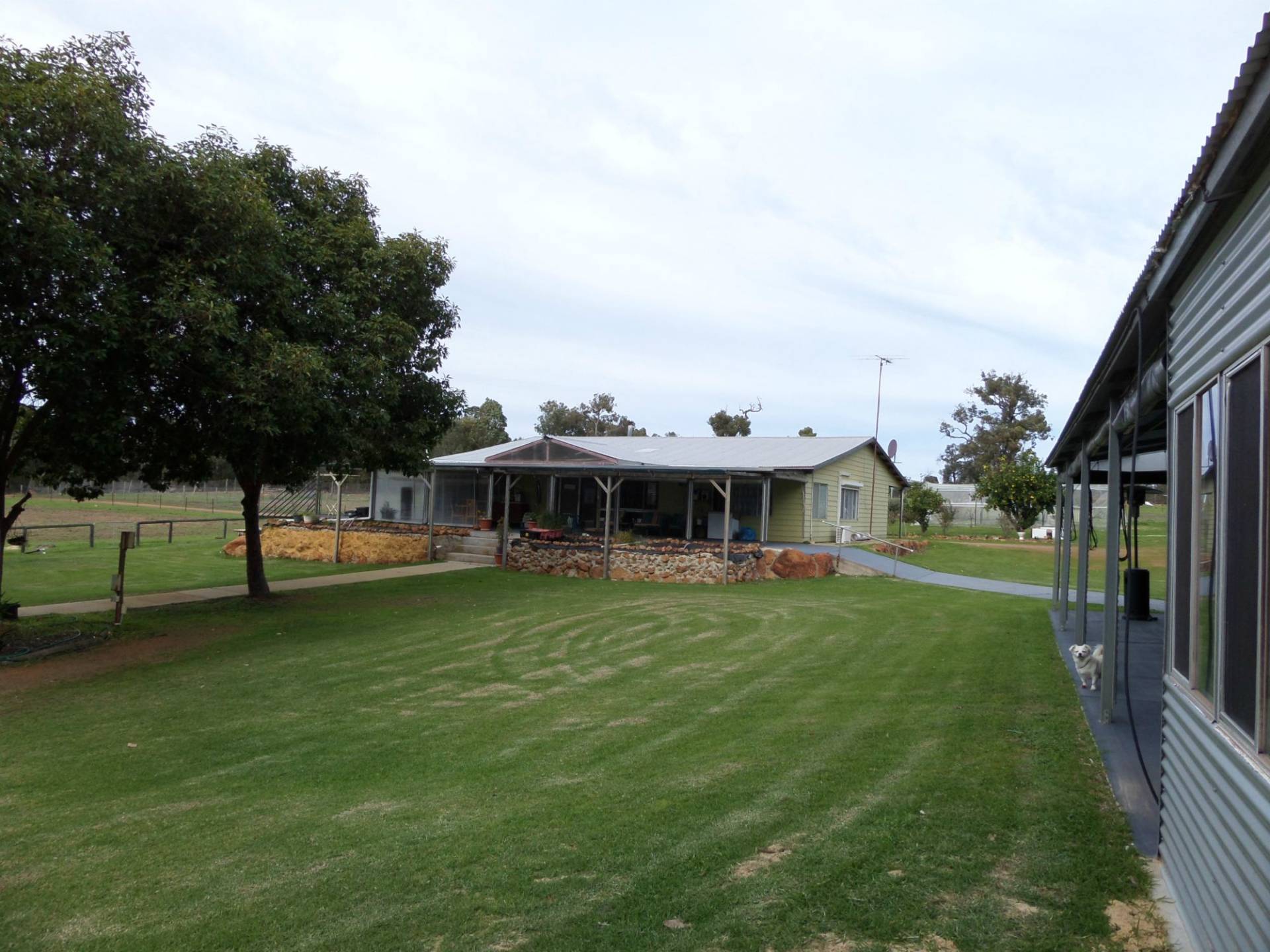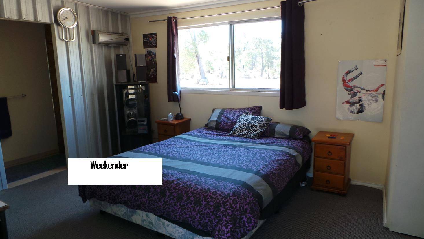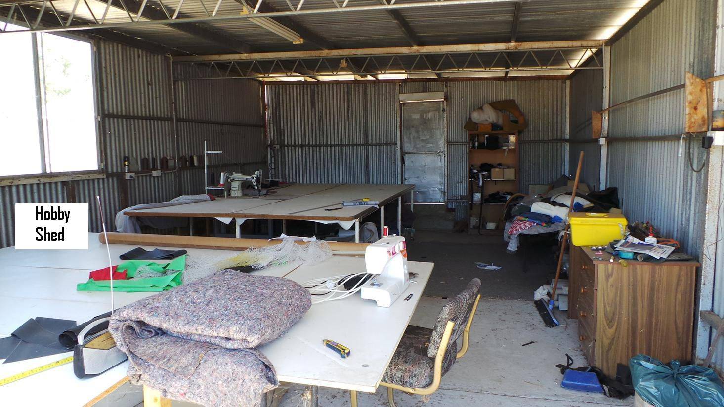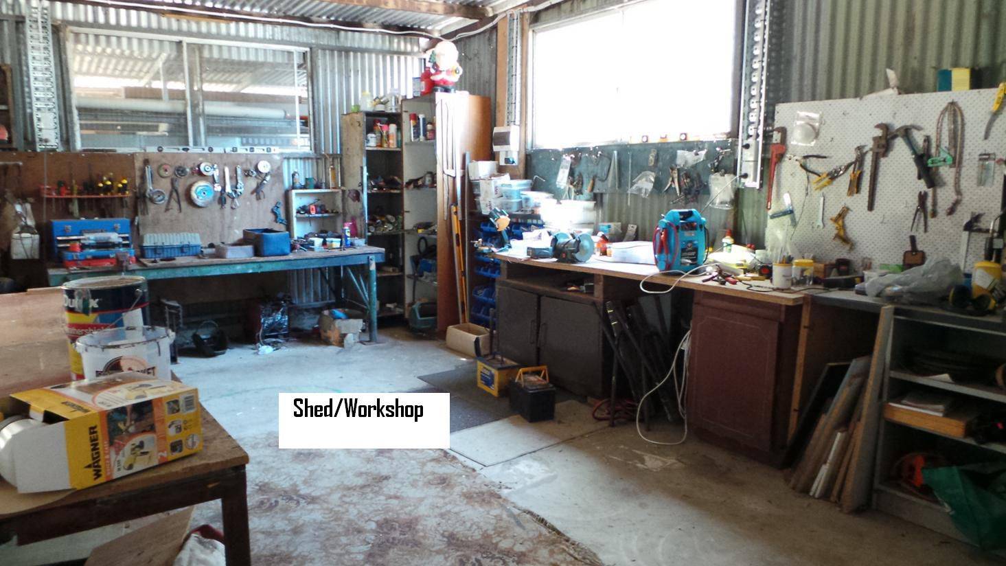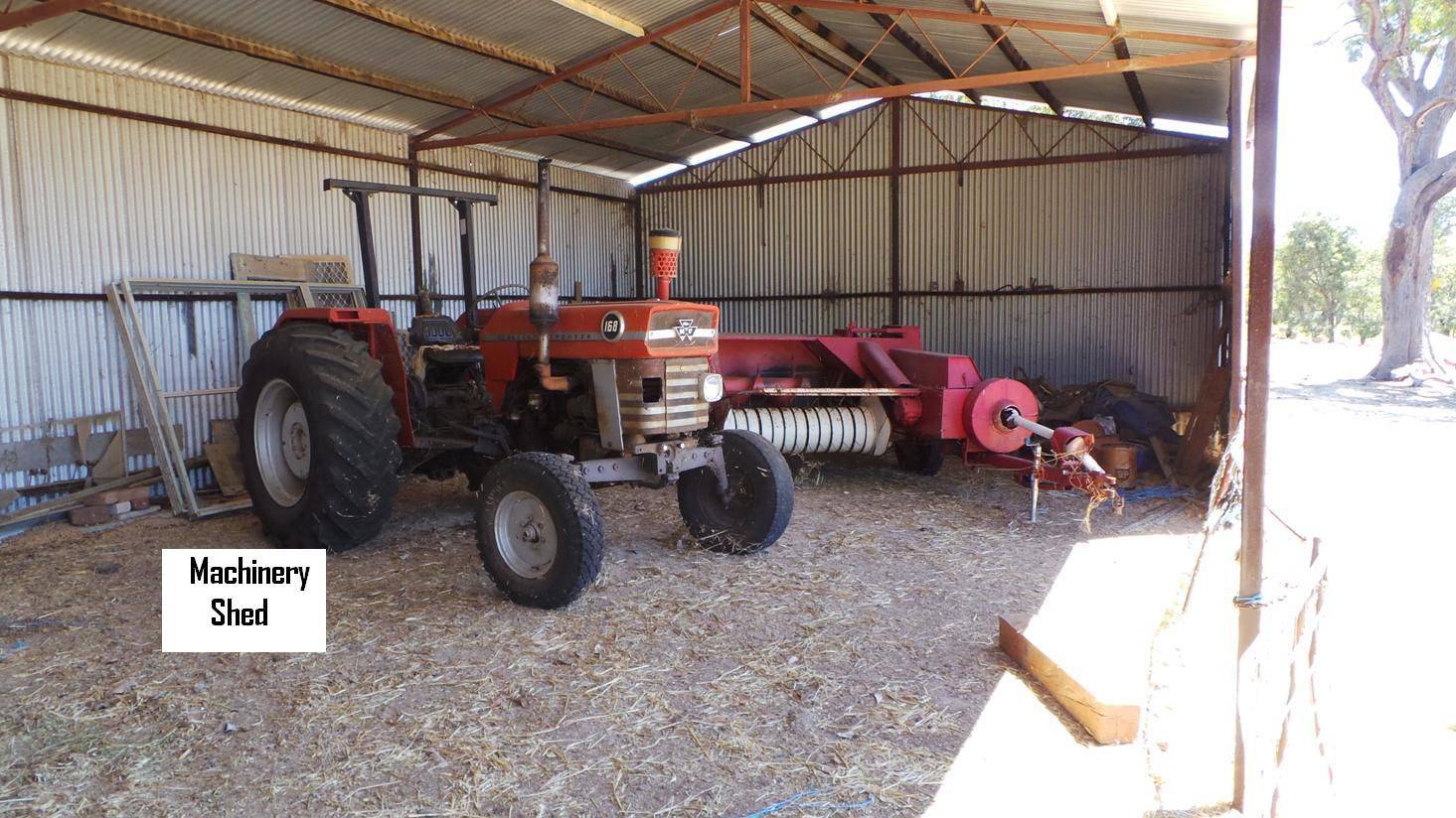 This is a 4 bay open 8m x 20m steel frame with timber purlin shed with 2 closed ends and has 2 water tanks, one 5000gal and one 3000gal, connected to catch rain water and bore water.