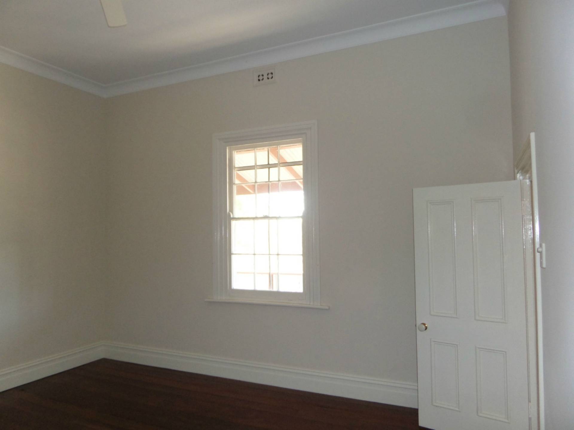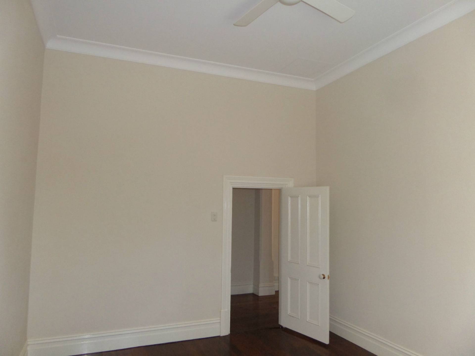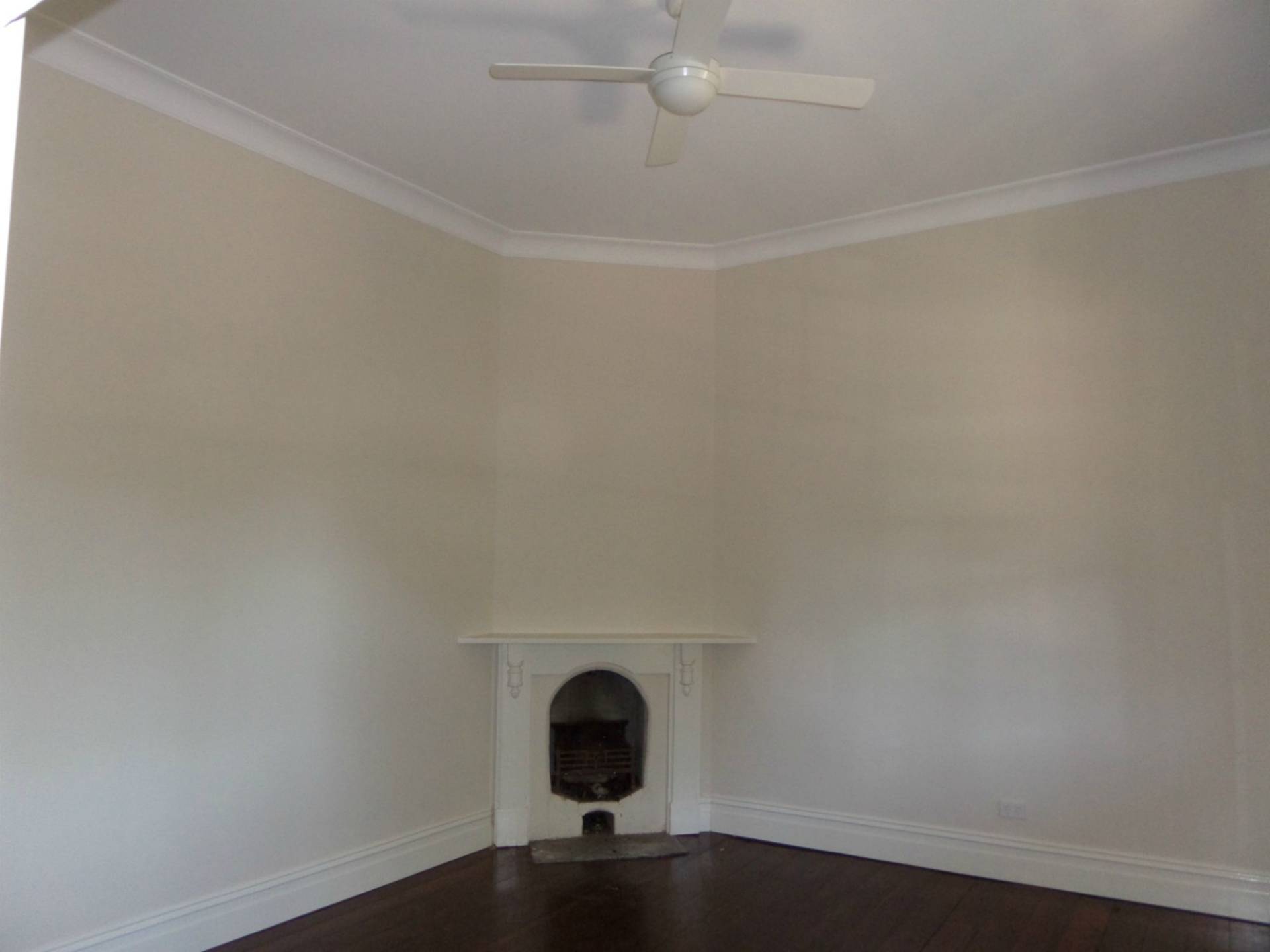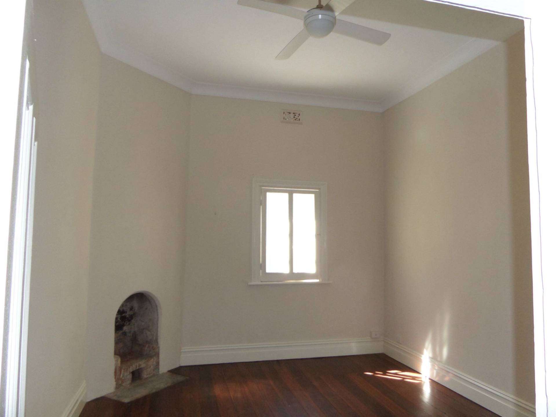 The third bedroom is at the middle of the house with the same high ceilings, polished floors, ceiling fan and small fireplace.