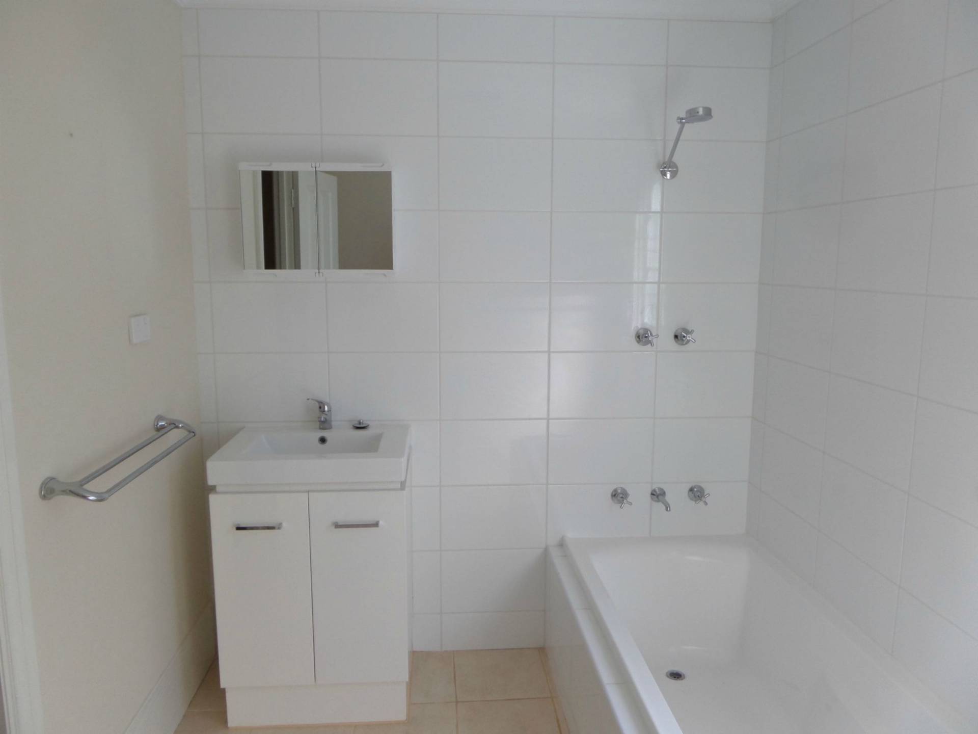 The bathroom has a shower over the bath tub and private toilet and is spotlessly clean white and all brand new.