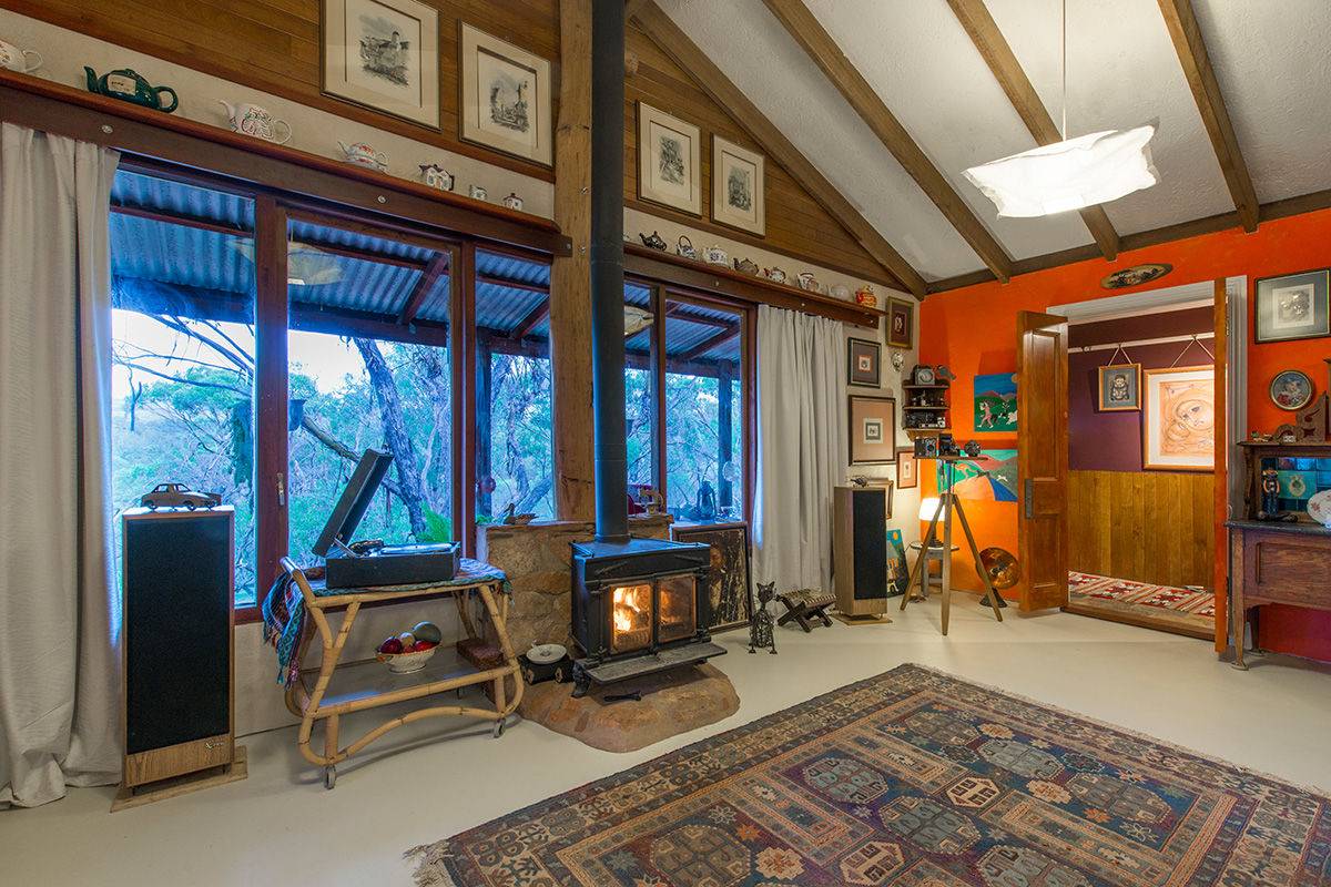 The use of recycled and natural timbers, bricks and panelling give character and warmth. The open plan living area has a cathedral-type roof with bush poles and exposed ceiling beams. An older-styled pot-belly fireplace provides comfort and ambience on chilly evenings.