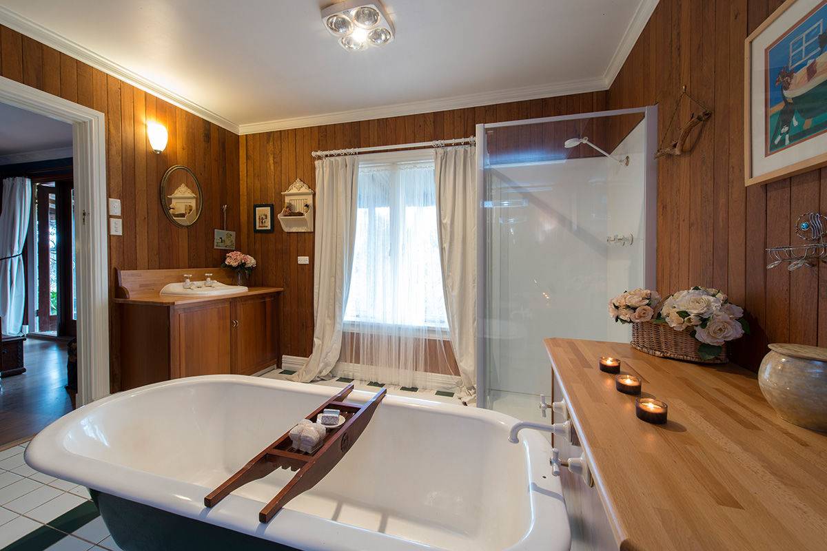 The large semi-ensuite bathroom (almost as large as the main bedroom) with its solid recycled Blackbutt panelling has an old-style claw-foot bath (in addition to a modern shower), and is a place where you disappear for hours with a good book, or soak in a bubble-bath with a loved one by candlelight.