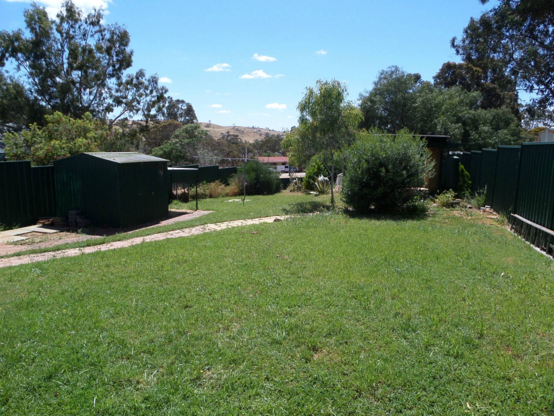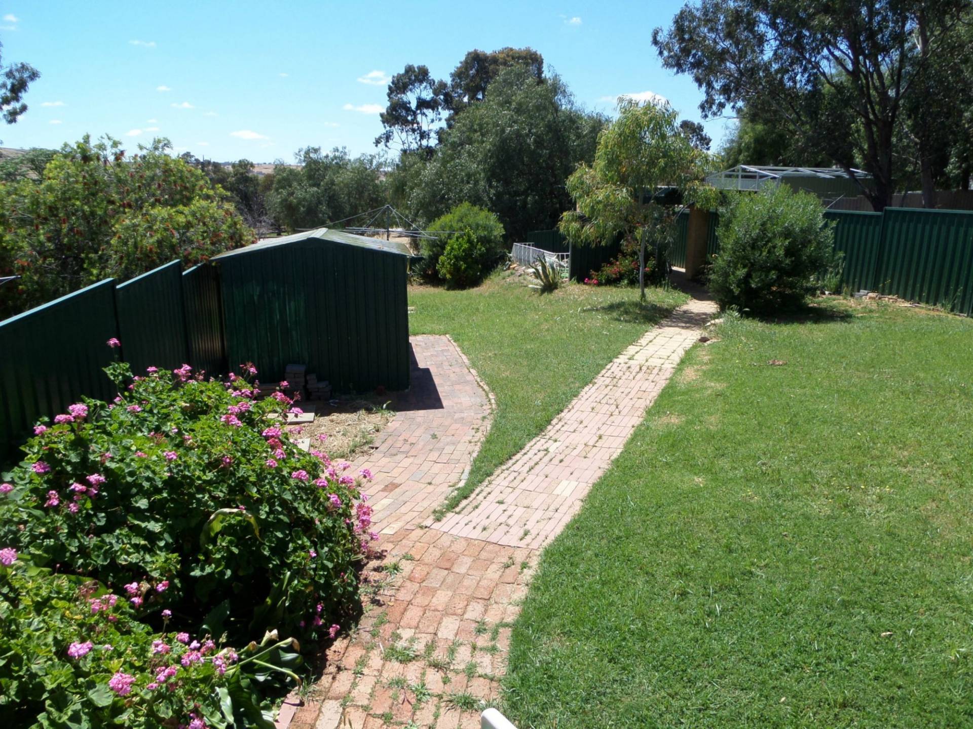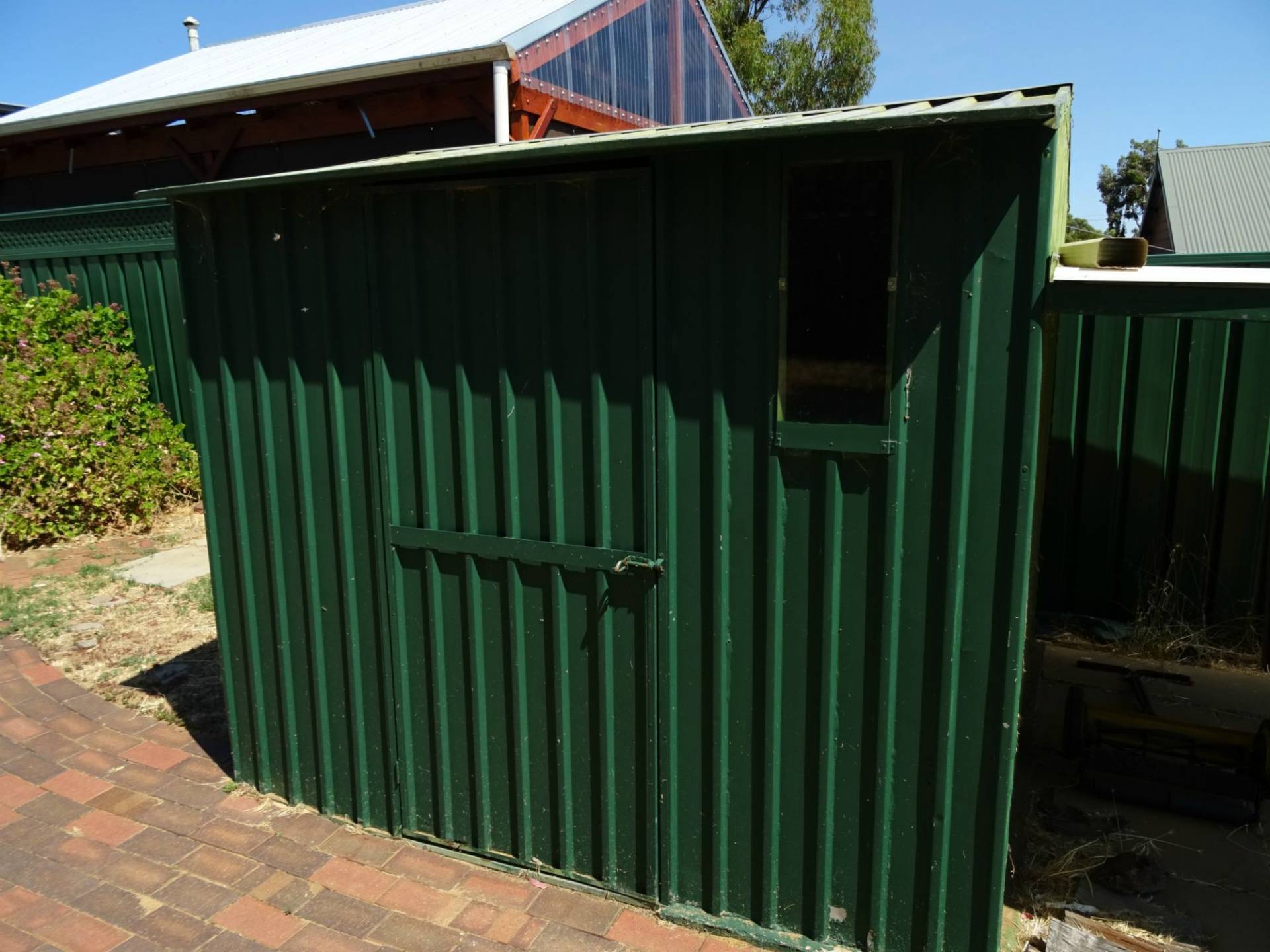 Fully fenced in rear yard with garden shed and large lawn areas.