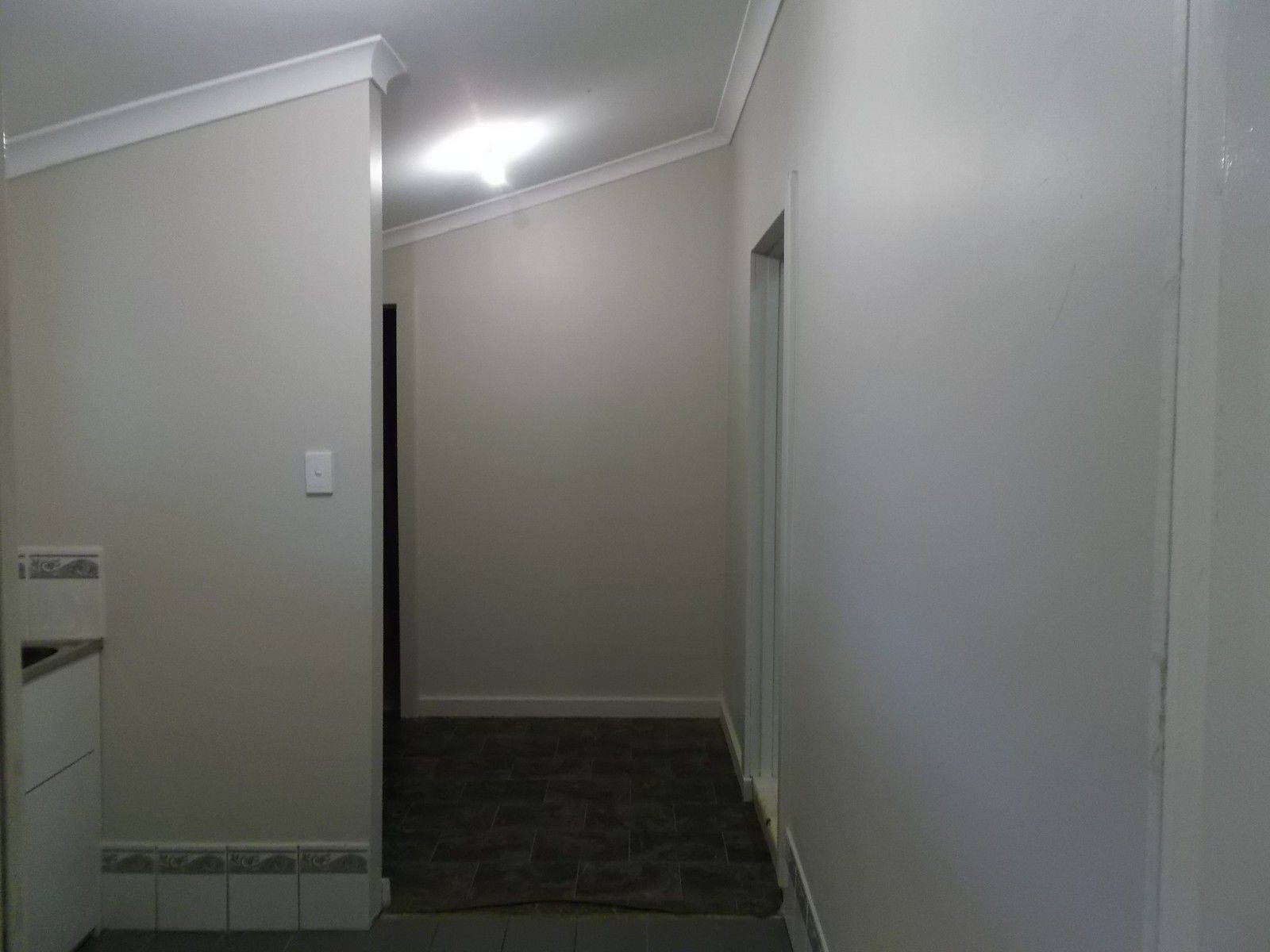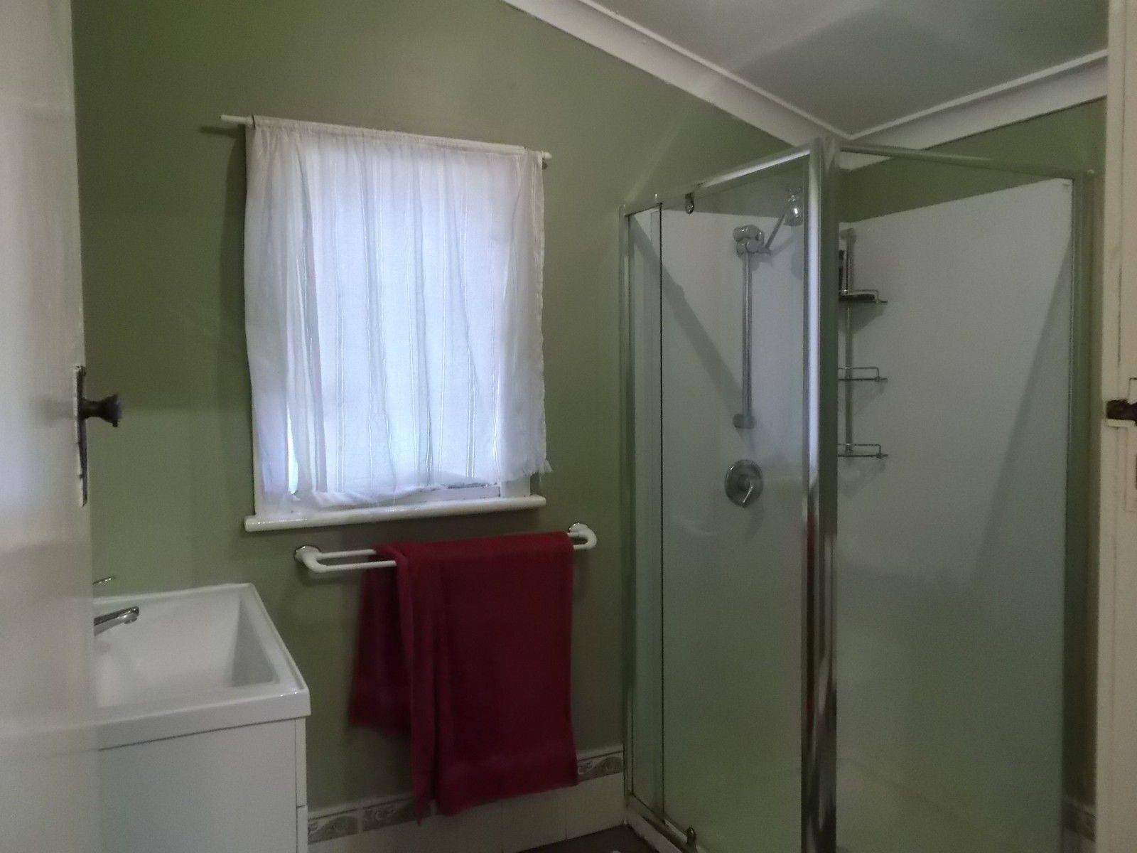 Rear tiled bathroom with corner shower and toilet and small laundry room leads to the rear patio area.
