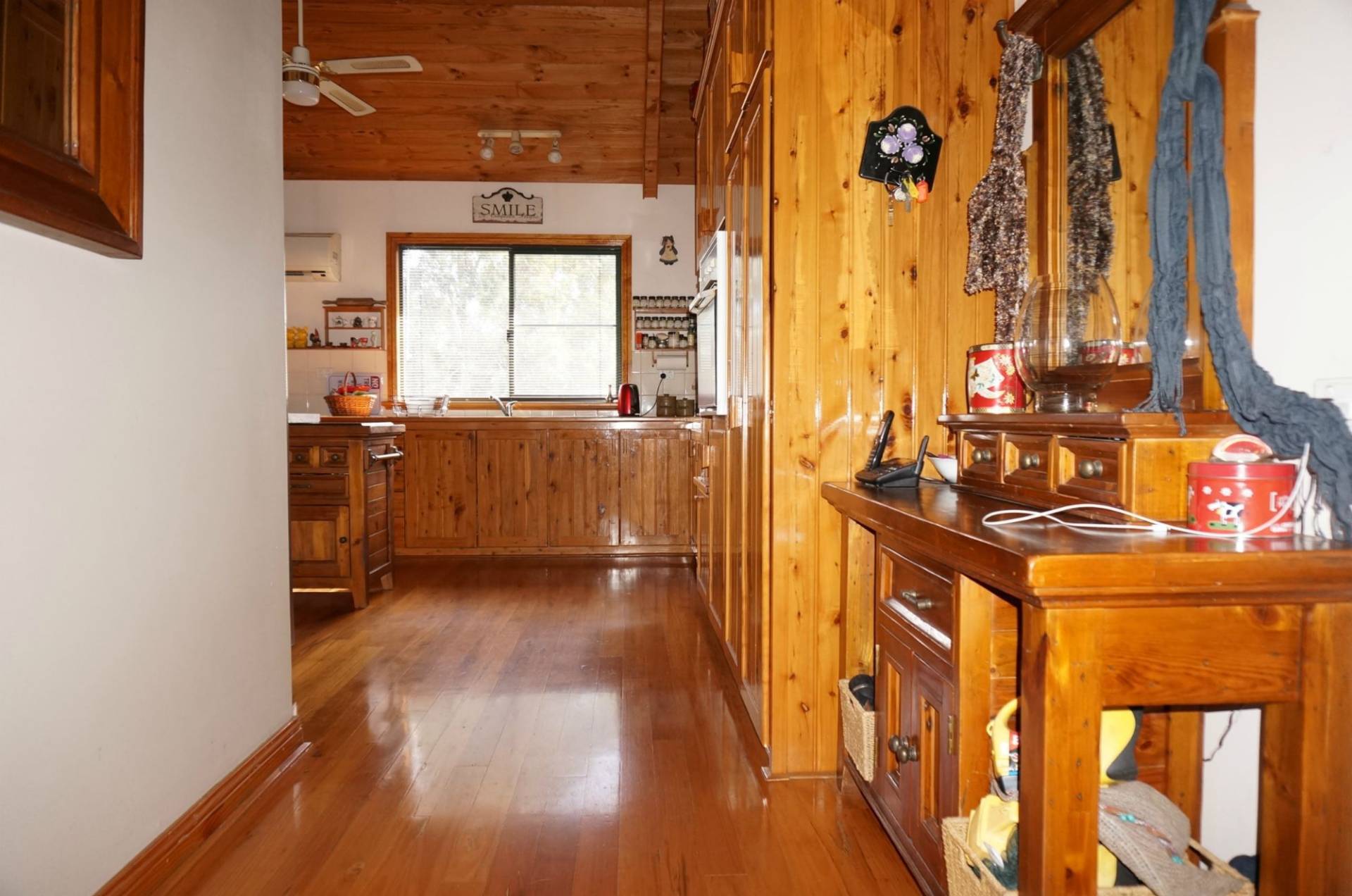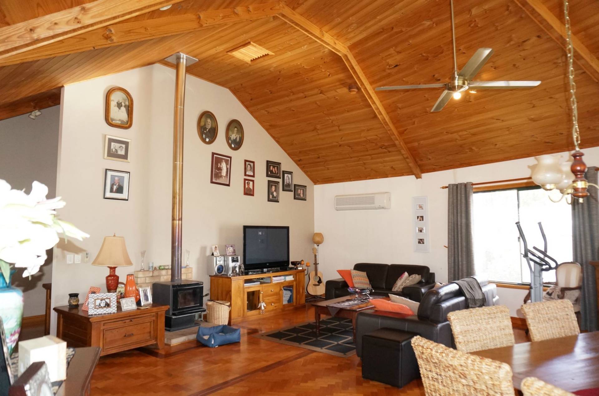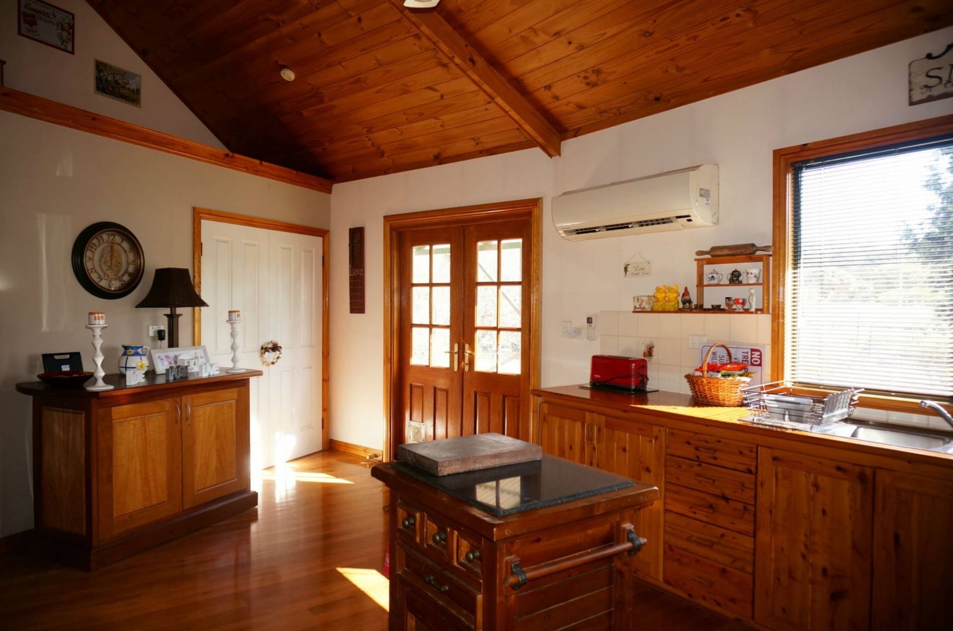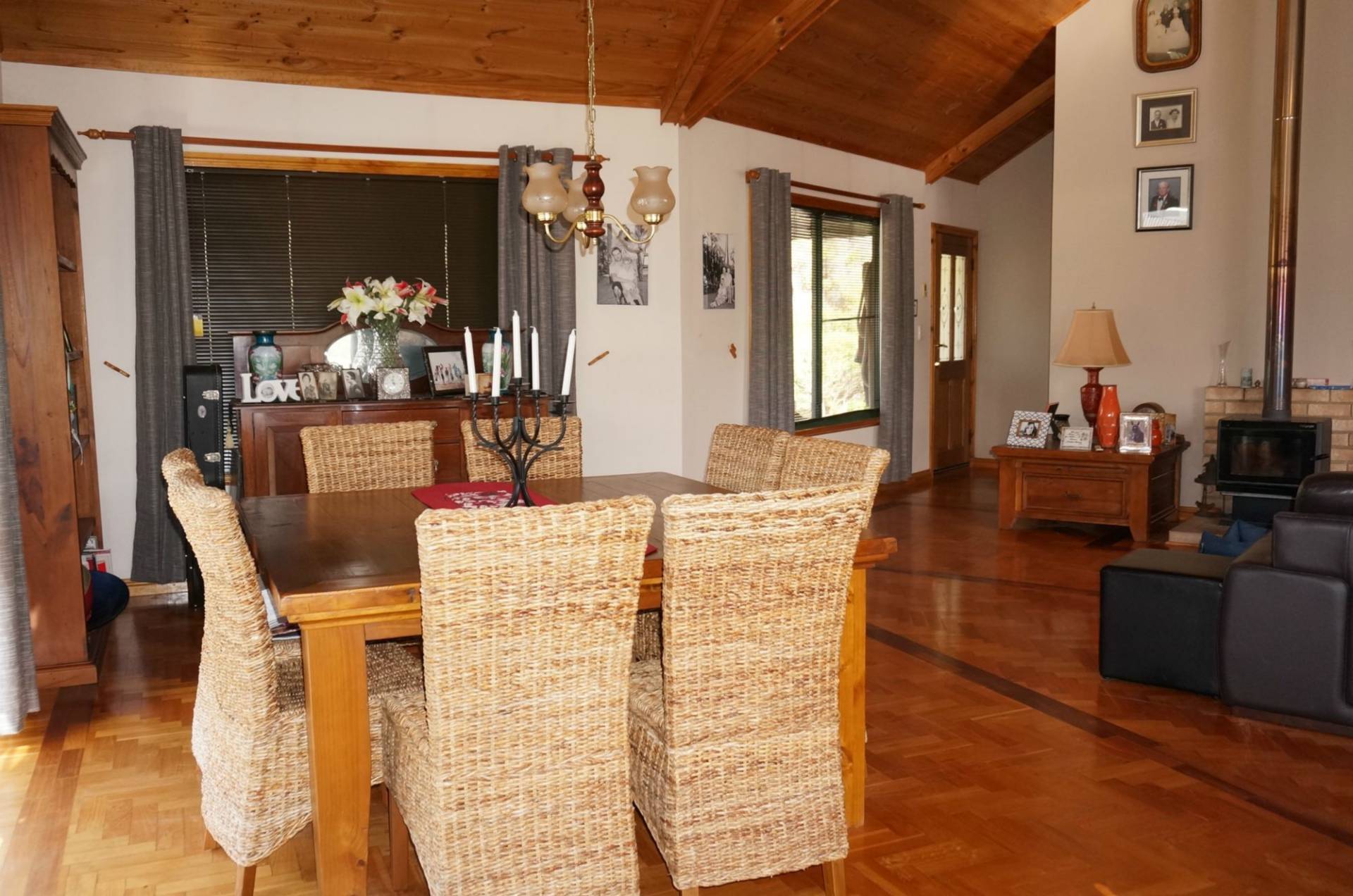 The homestead welcomes visitors via a timber-lined entrance hall. It features beautiful polished hardwood and parquet floors, high vaulted timber ceilings in the living areas with matching pine cupboards in the kitchen and exposed timber trimmings on door and window frames. This magnificent use of timber that accentuates the country ambience is balanced by light-coloured gyprock walls and plenty of natural light.