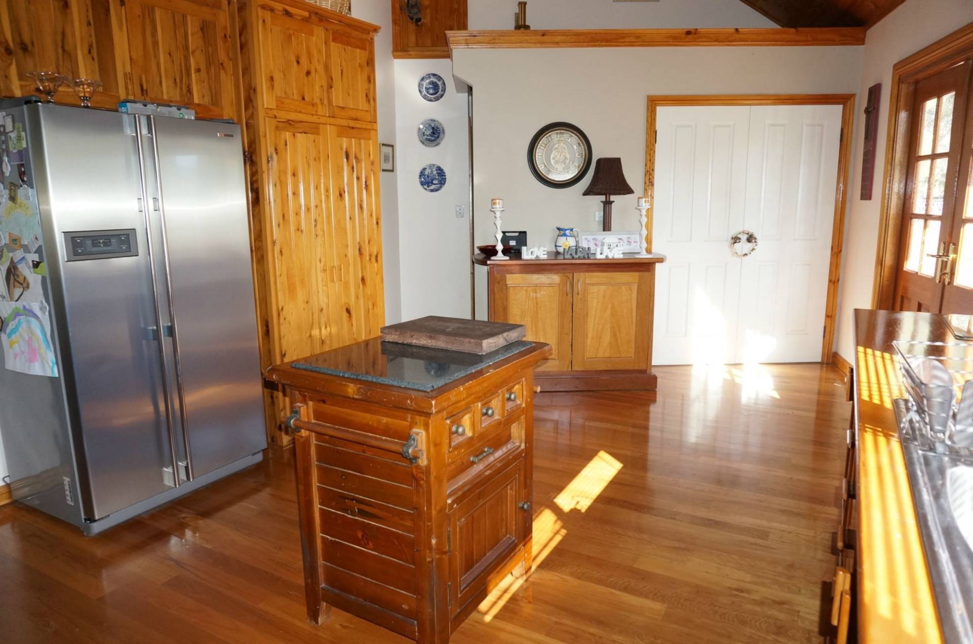 The kitchen is a delight to work in with its double-sided s/s sink and draining boards, feature island workbench and plenty of other bench top work space. The timber cupboards provide an abundance of storage capacity and a large recess is designed to accommodate a double door fridge/freezer. An English laundry is hidden away behind exposed pine doors.