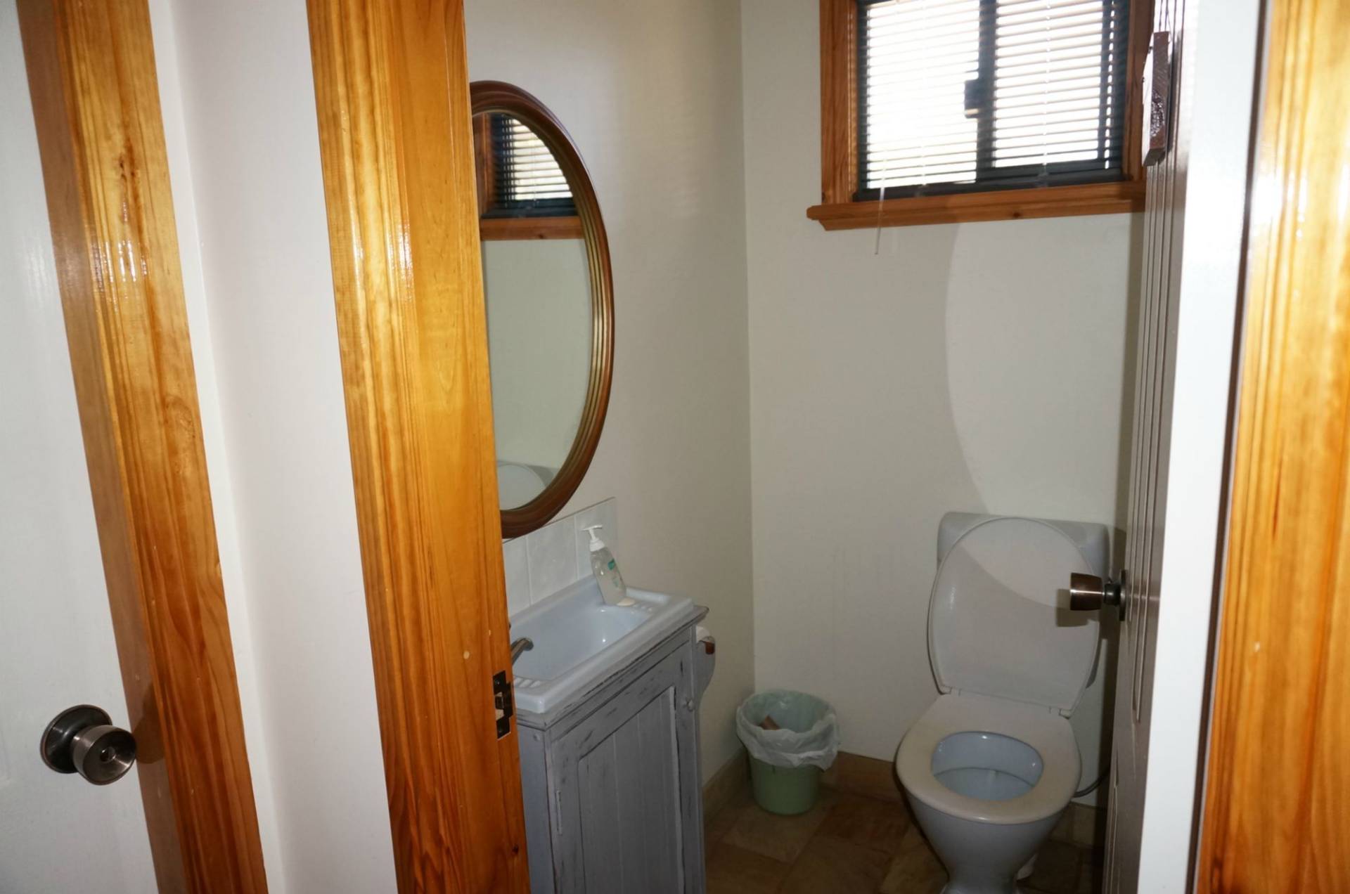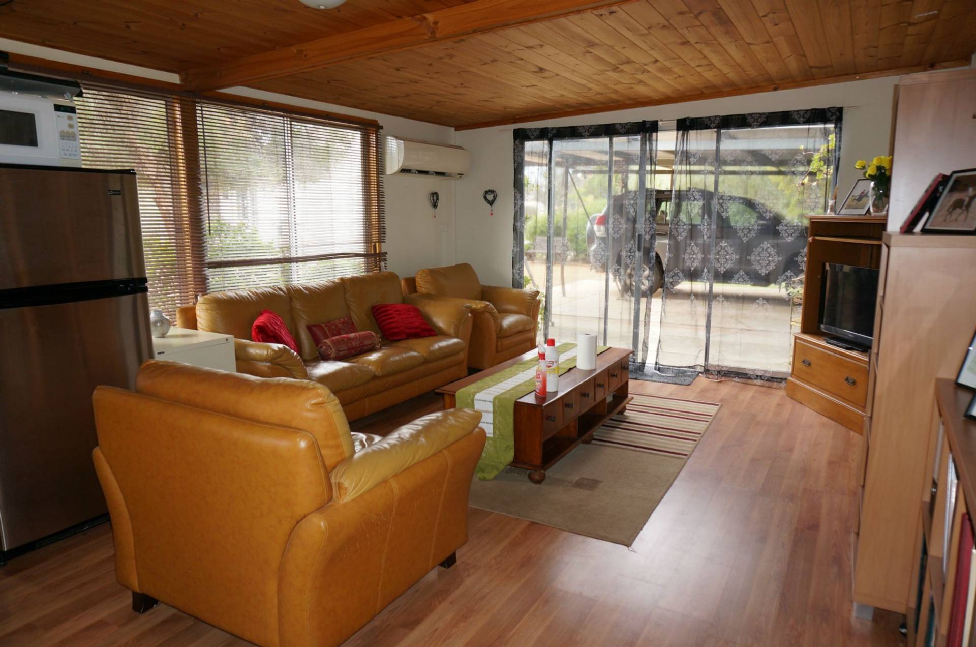 The large living area easily combines lounge and dining. This area is heated by a slow combustion stove above which an electric fan ducts hot air to the bedrooms. Like the kitchen, the living area is cooled by a split AC unit and landscape windows provide ample natural light.