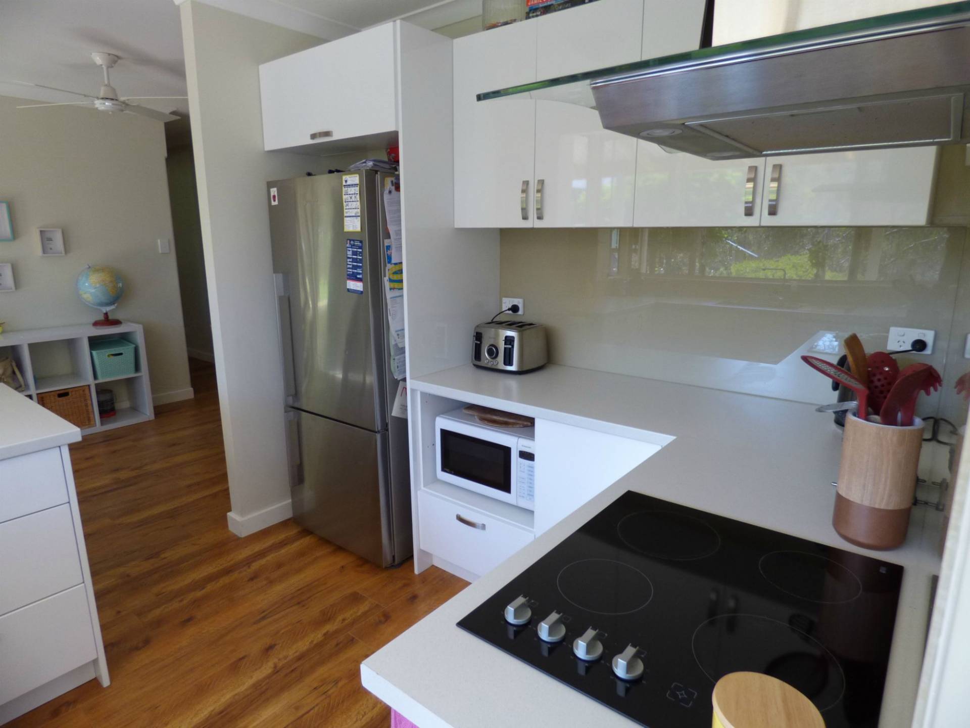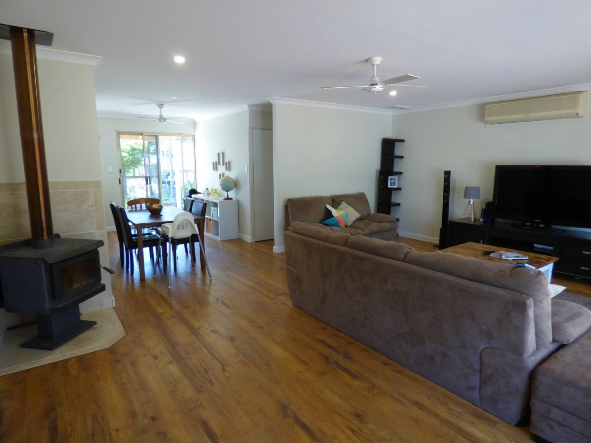 The home features a large lounge room with timber floors plus a log fire and split system airconditioner. The kitchen is neat and modern with dishwasher, hot plates and wall oven and glass splash back and glossy white cupboards.