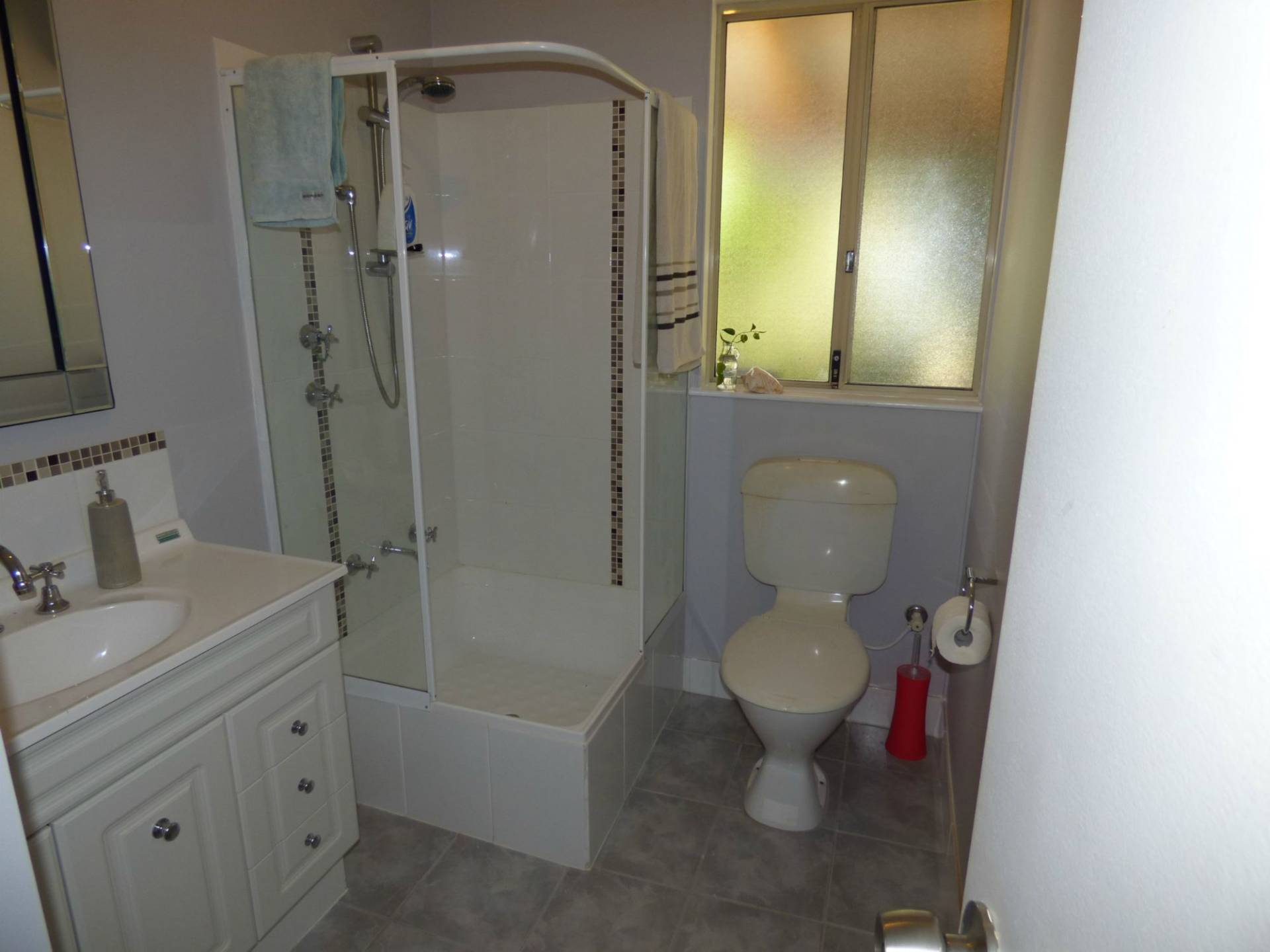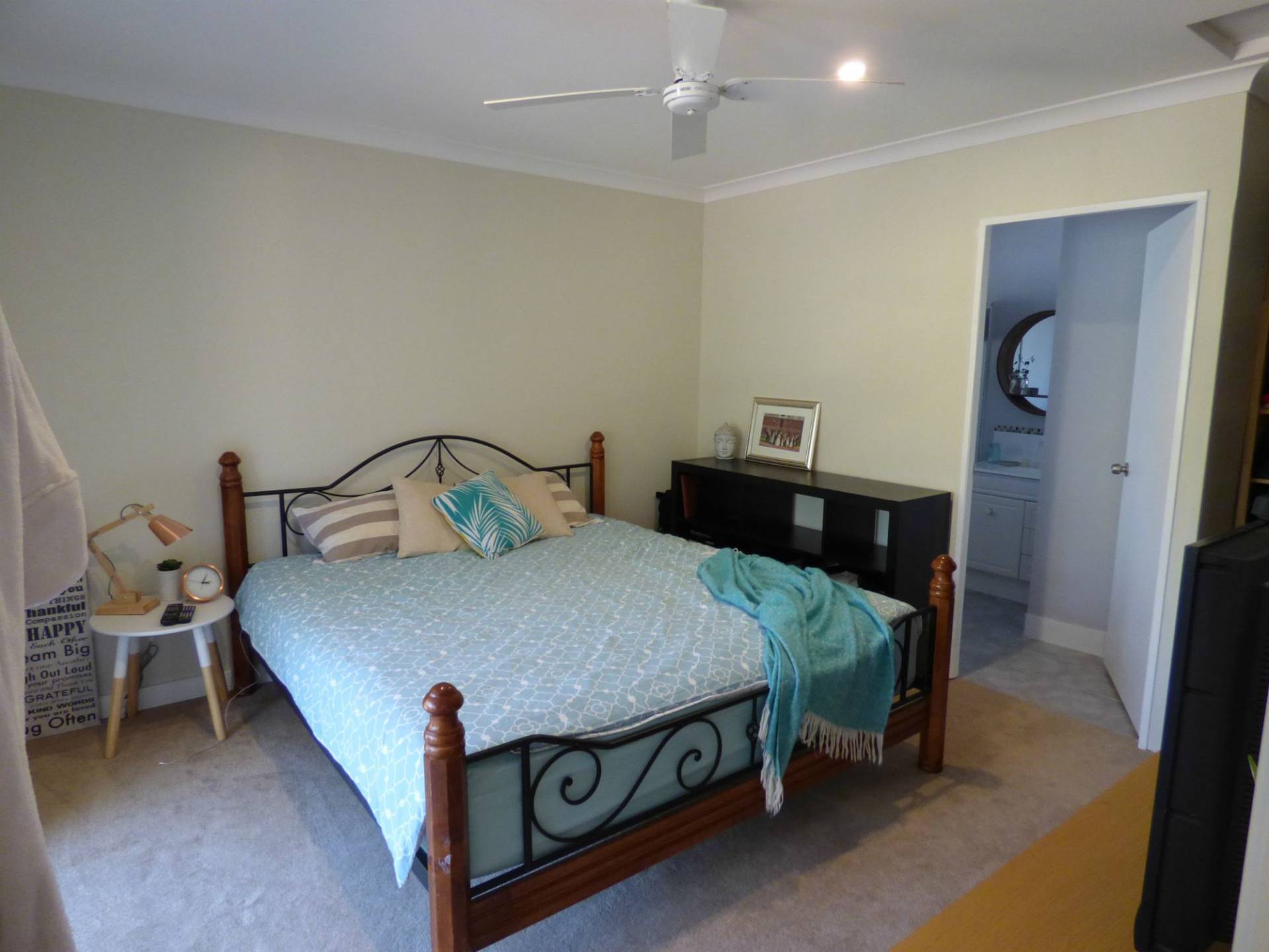 corner robe plus an ensuite with vanity, shower & toilet.