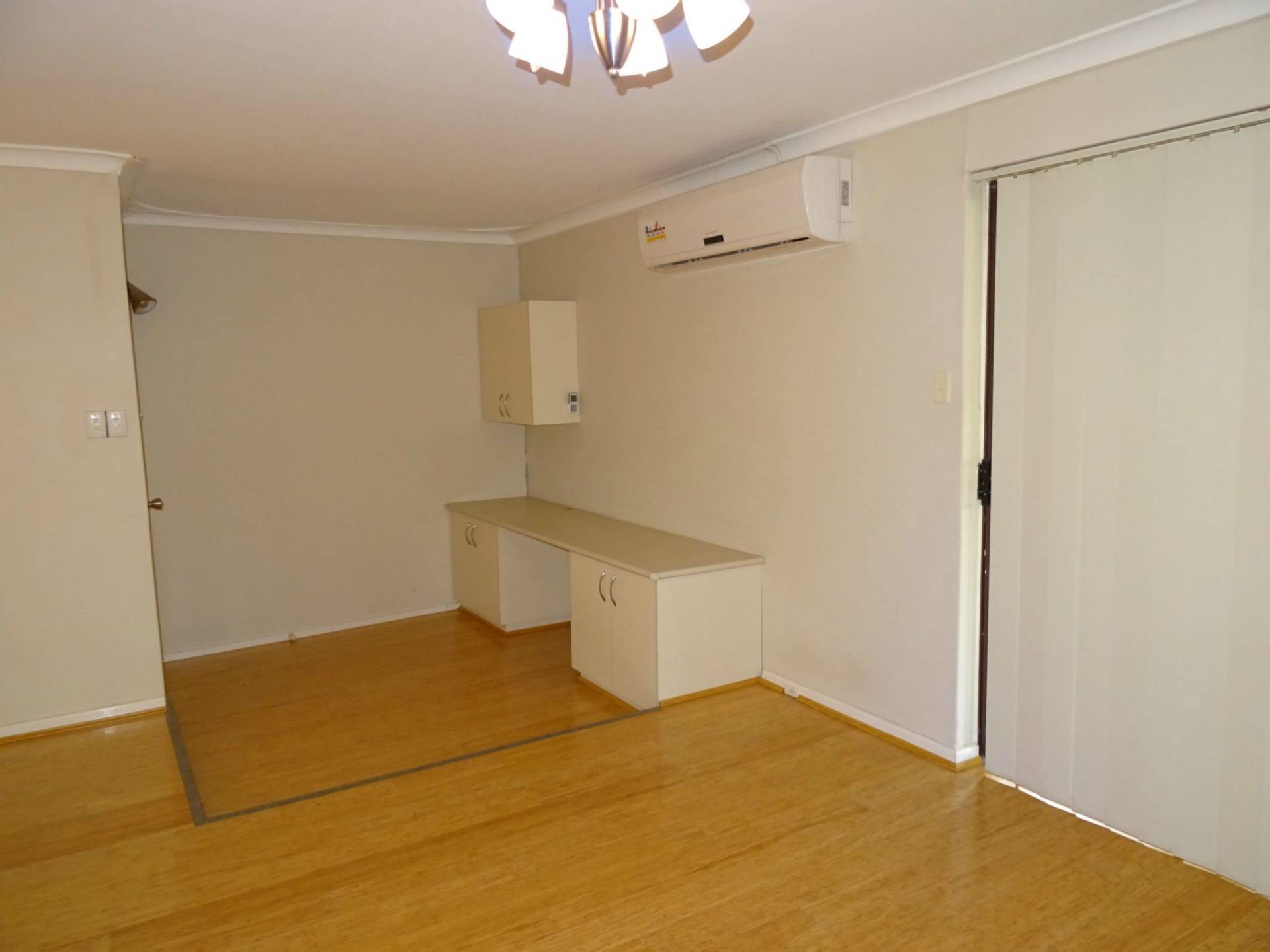 Huge front lounge room with corner study / office nook all with timber laminate flooring and split system air conditioner.