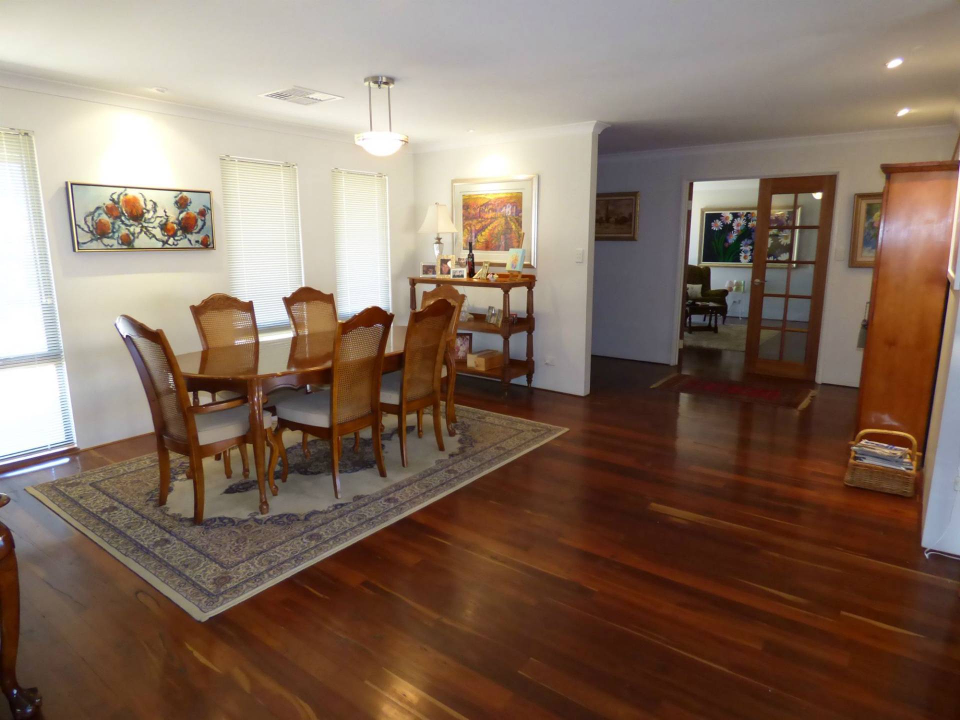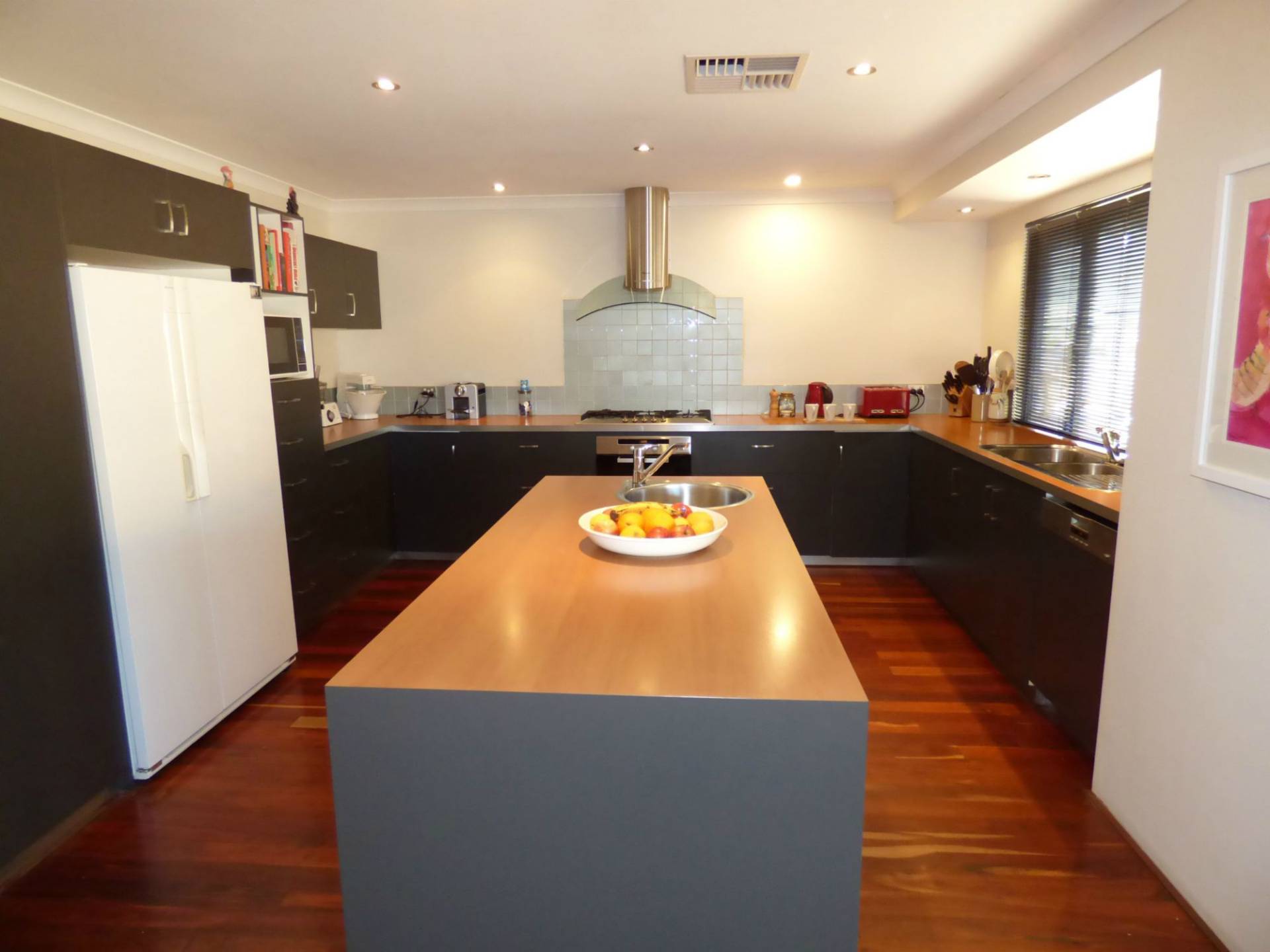 The modern kitchen follows onto this area and features an island bench with sink and cupboards under. There is a large built in area for the fridge freezer recess, gas 5 burners hotplates, wall oven and built in dishwasher. a large,easy to use, kitchen area very well designed.