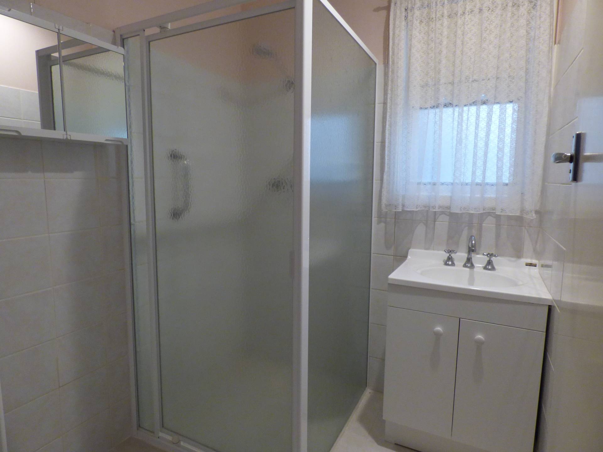 Tiled bathroom with corner shower and vanity unit, seperate toilet and laundry to rear.