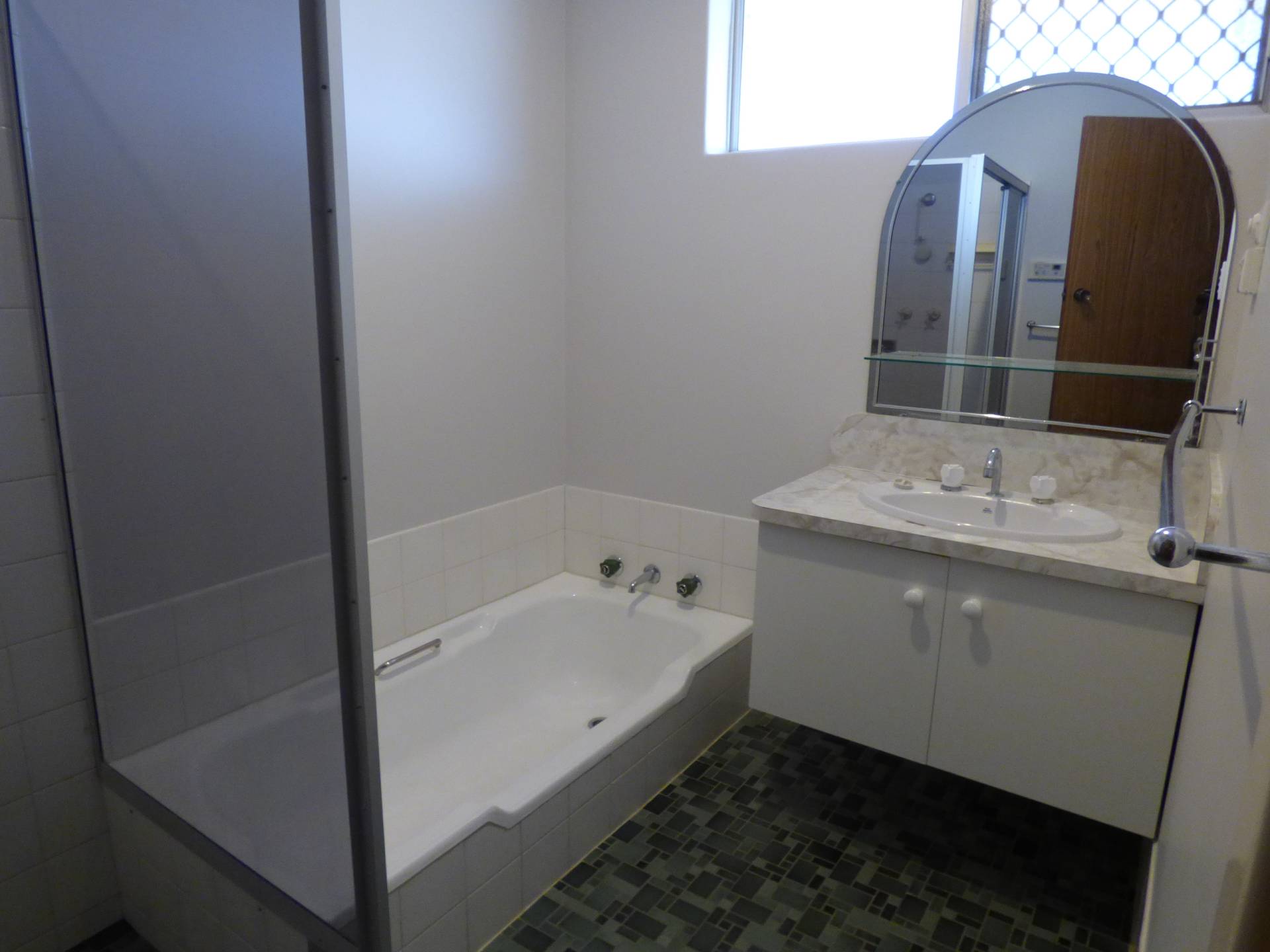 Main bathroom is tiled with a seperate bath tub and shower and seperate toilet.