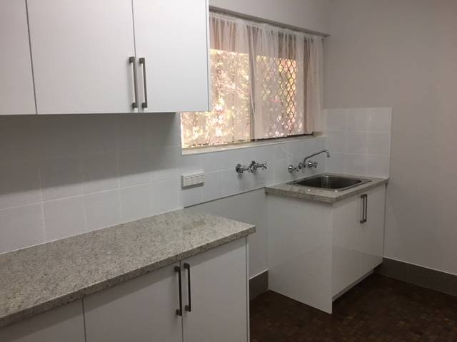 Large laundry with new cupboards installed.