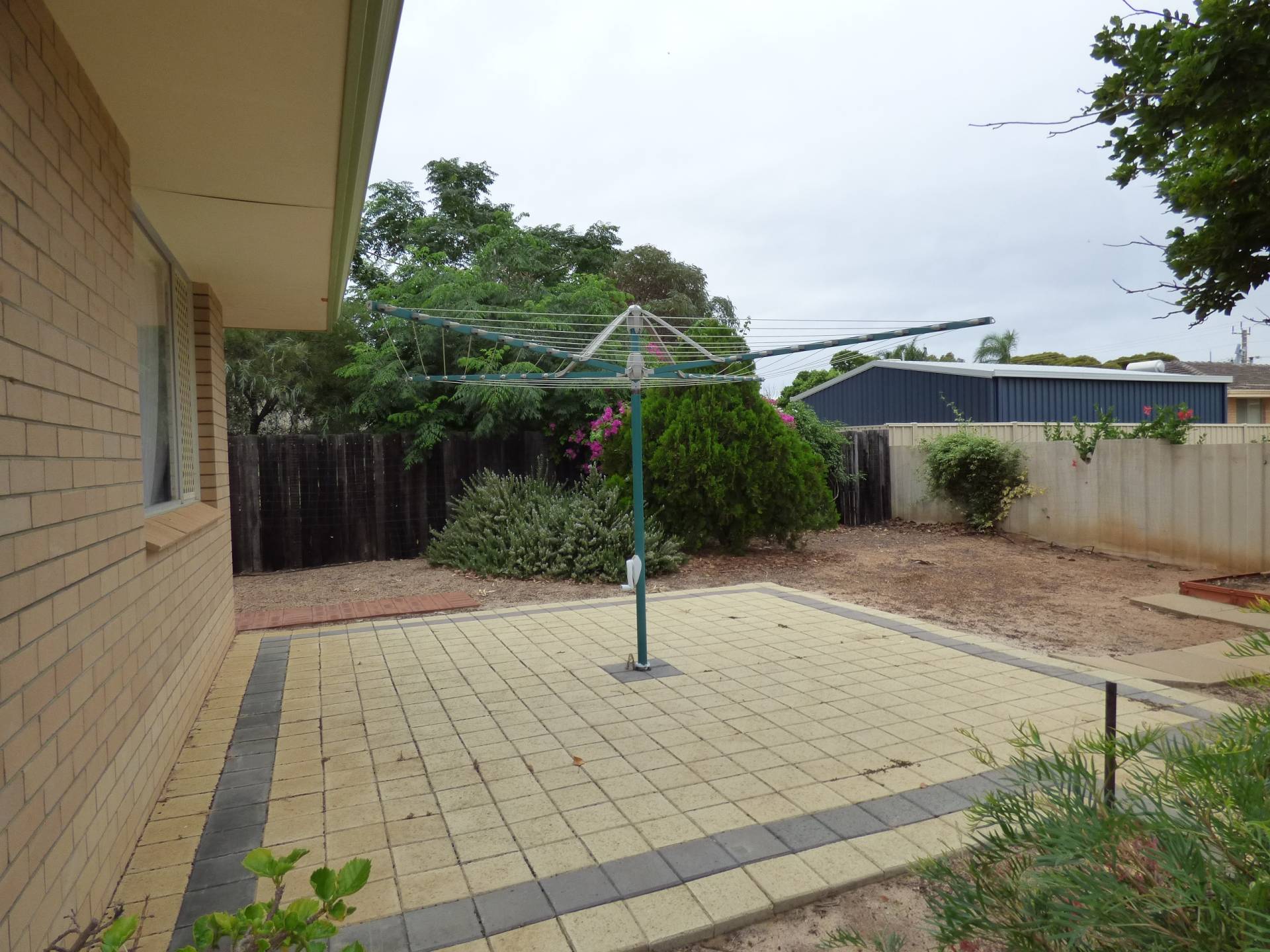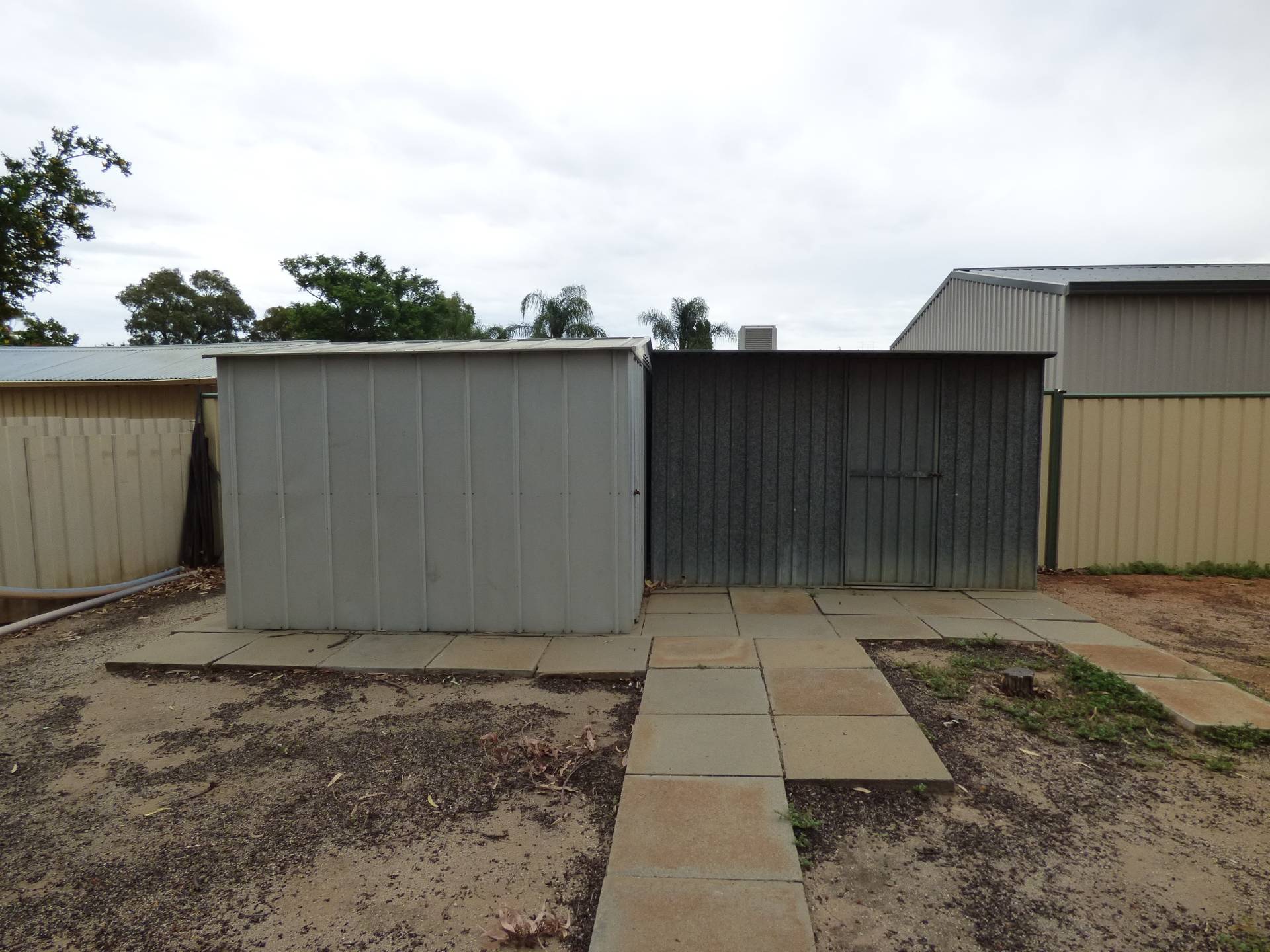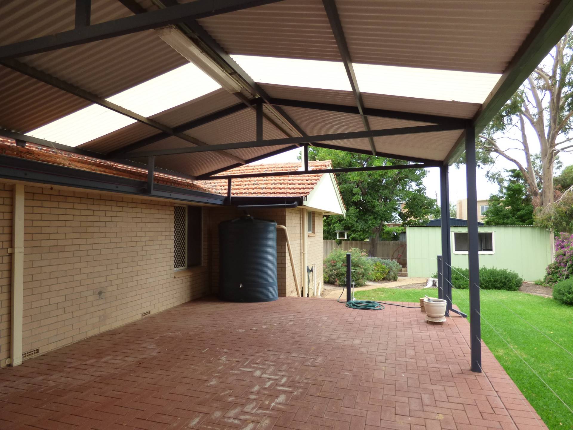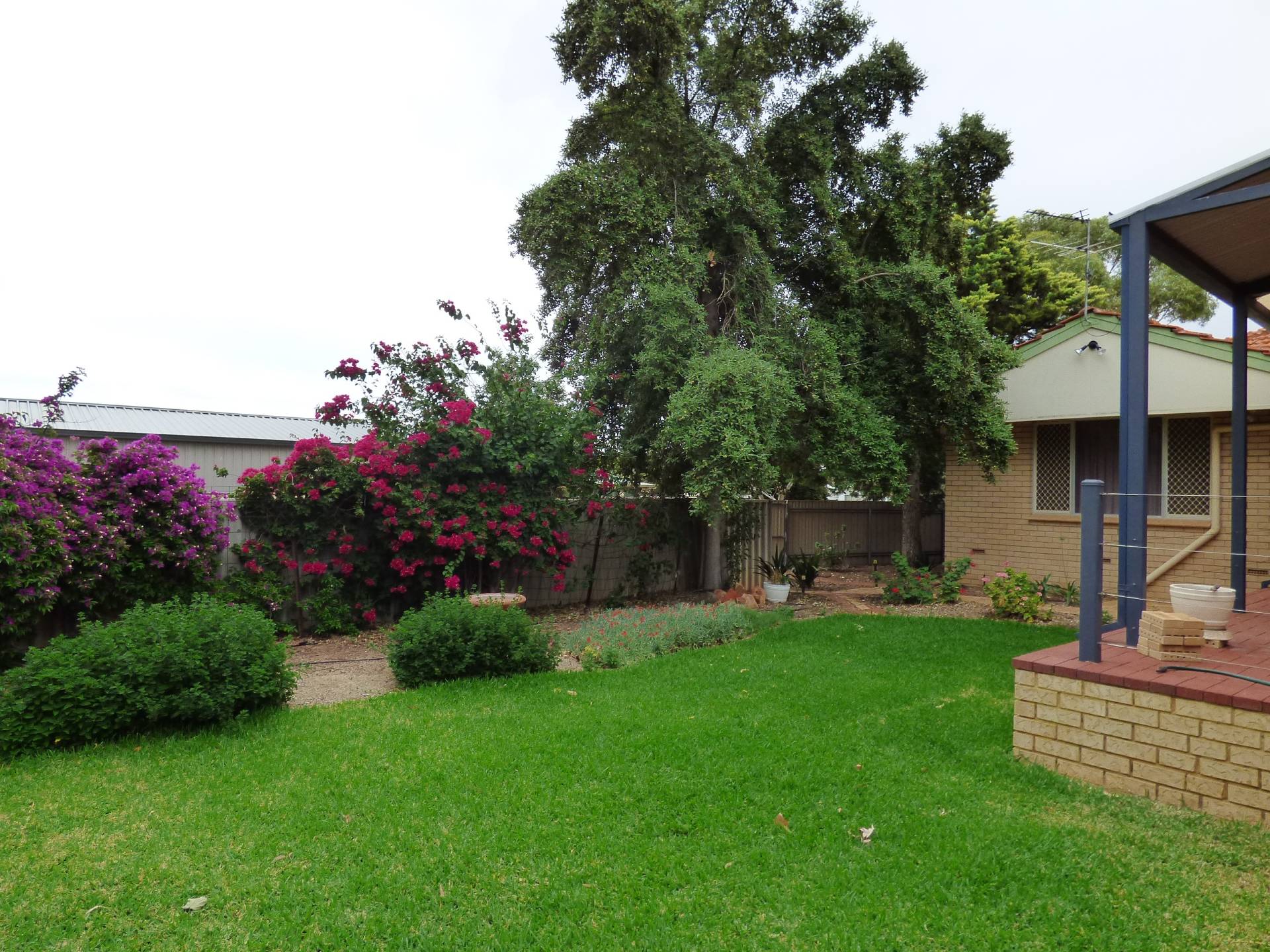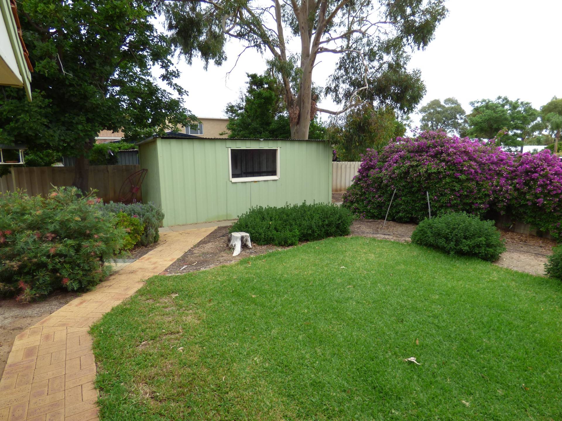 Lush green lawns off the patio, neat and tidy but low maintenance garden in the rear yard with reticulation.  Large paved area under the clothesline, 2 x small garden sheds plus old single garage sized shed as well and concrete slab pathways to the sheds.   Small rain water tank as well.
