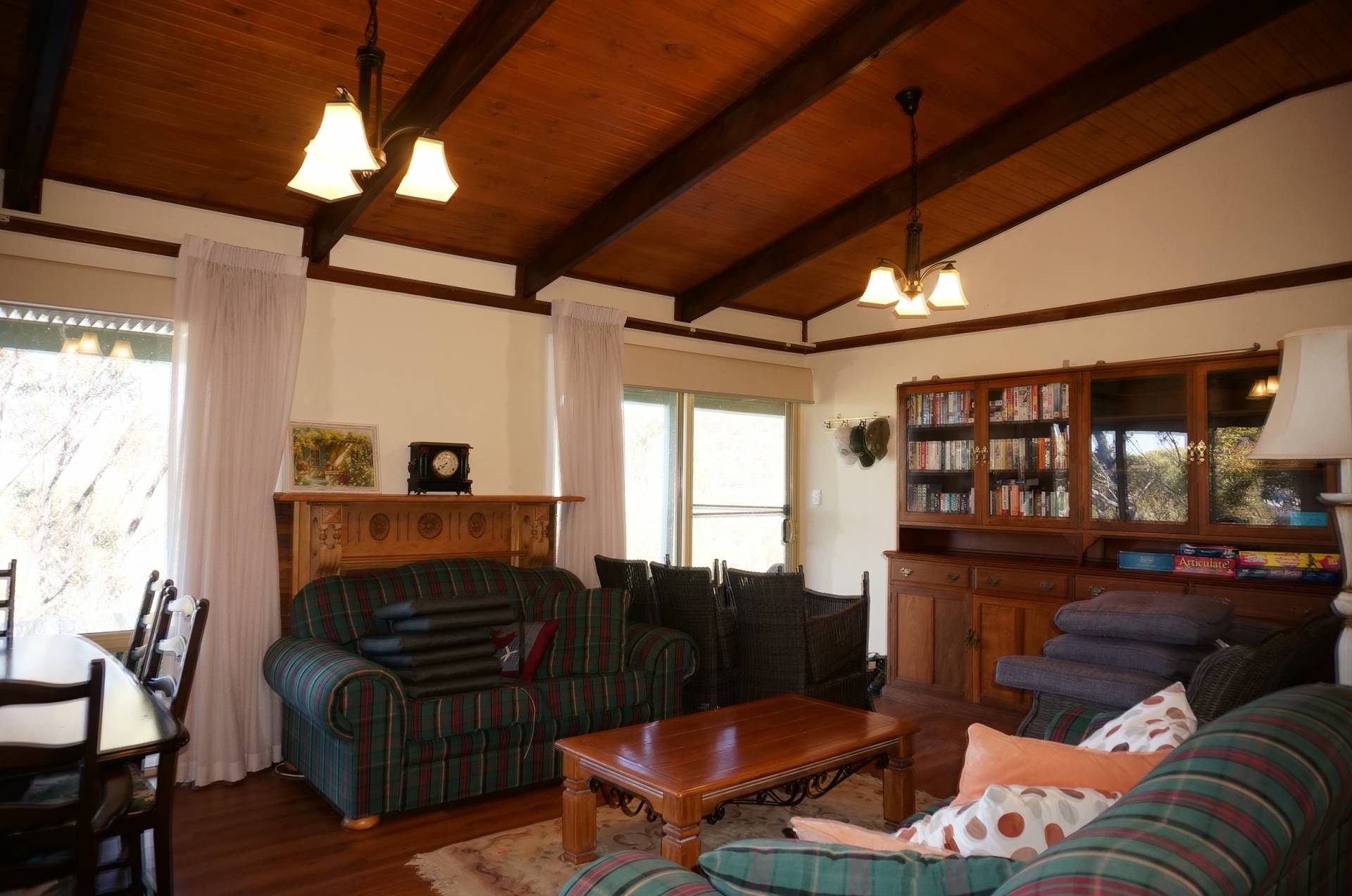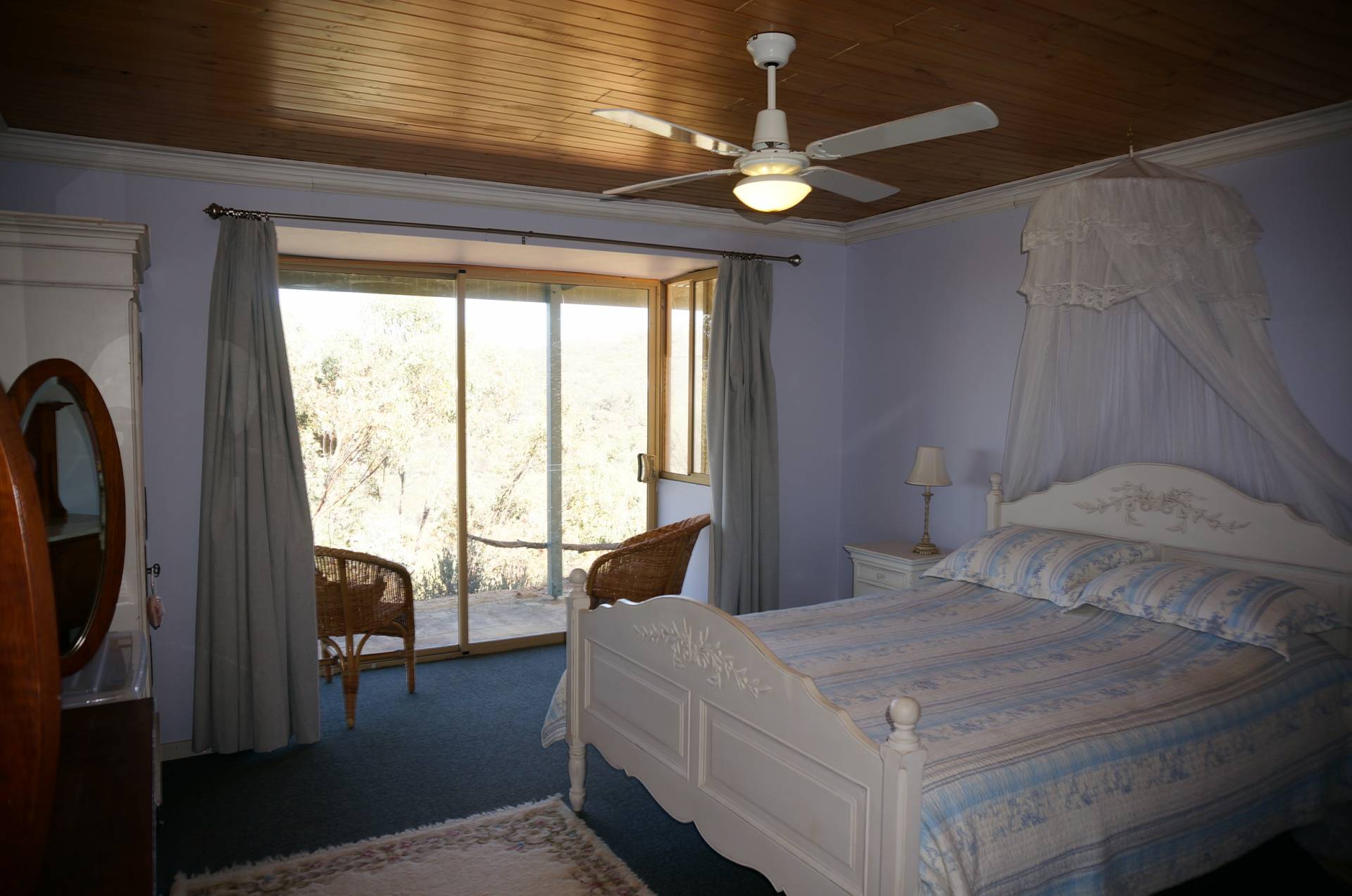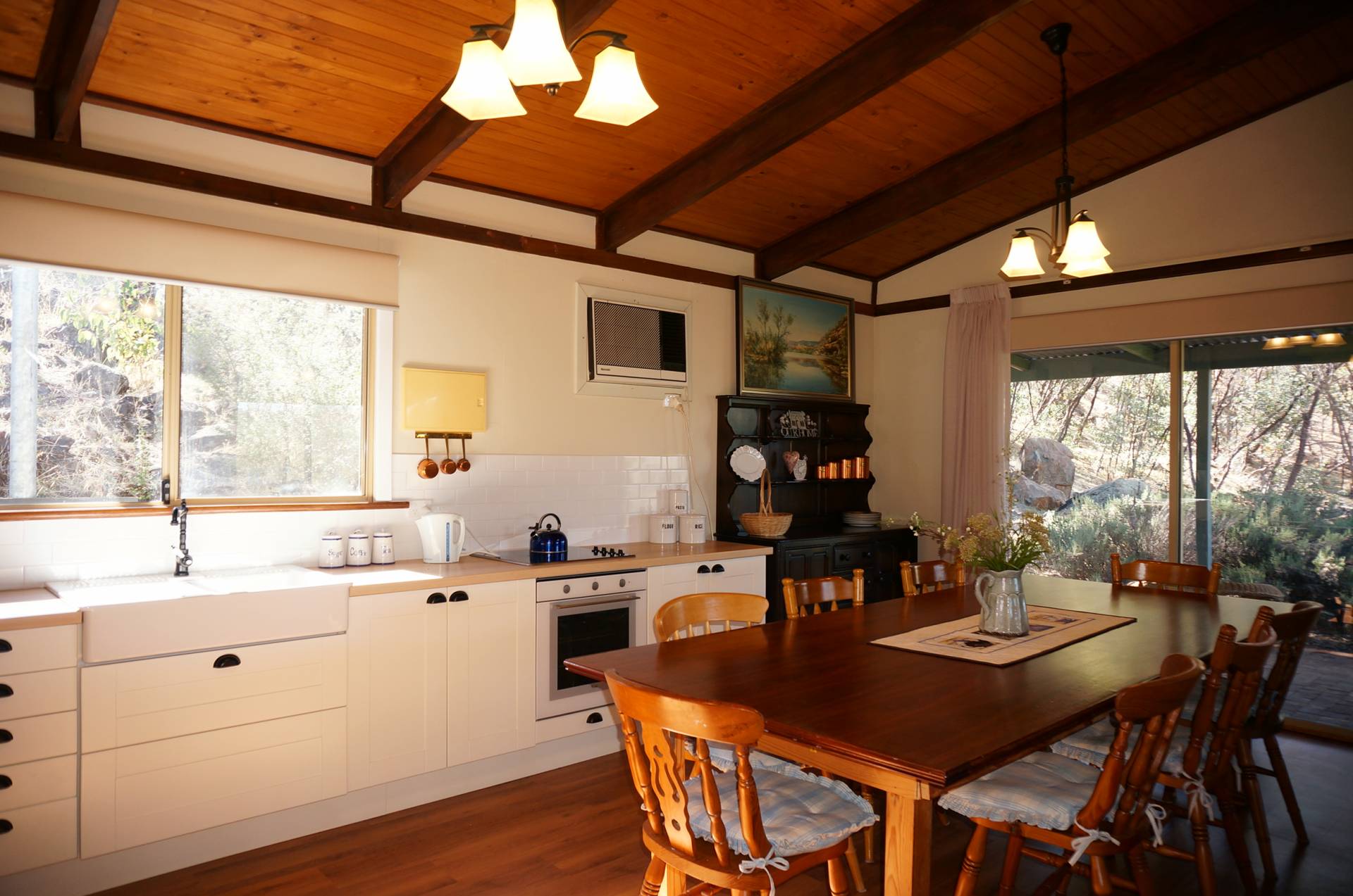If you like a cottage style you will love the open plan country kitchen / dining / lounge area which is configured in a ‘U’ shape so that each function has its own space. Exposed beams, vaulted pine-planked timber ceilings and a wood heater are a feature of this attractive and homely place. The orientation of these rooms plus the floor-to-ceiling windows maximizes the beautiful views and private, bush landscape.
