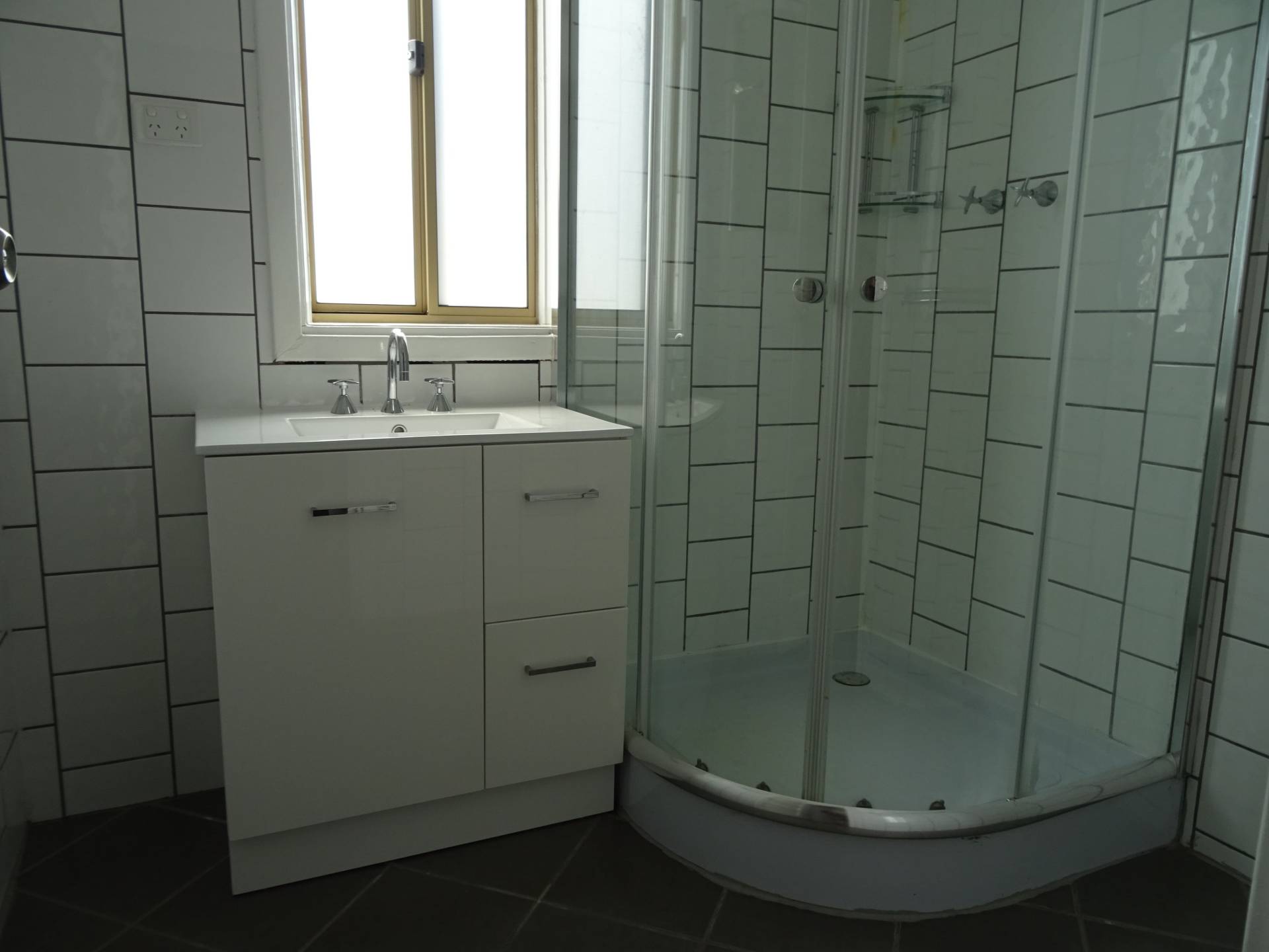 Tiled bathroom with corner shower unit and tiled laundry area as well with separate toilet.