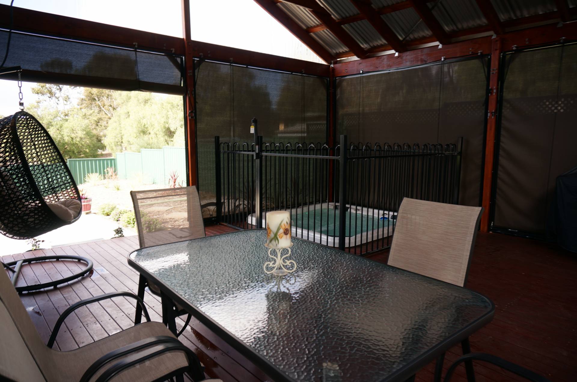 This property is ideally situated on a quiet cul-de-sac with a shire parks and recreation reserve over the back fence. It features a side access and shire approval for a 6m x 5m (approx) garage/shed at the back. This area has been landscaped recently. The outdoor areas represent a simple but attractive and very low maintence space.