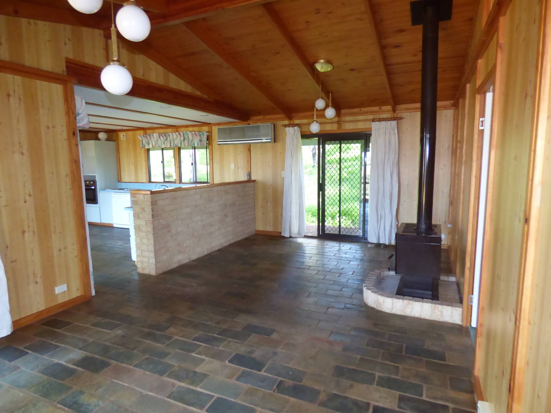 The main living area has slate floors and a Large Log Fire place leading onto the kithen.