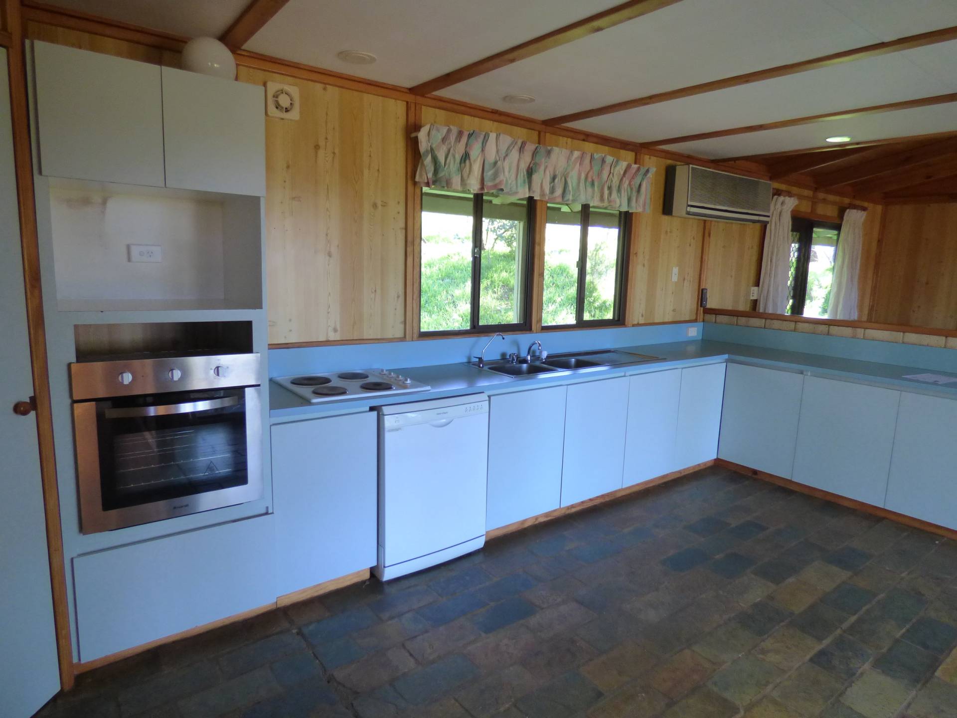 The kitchen has a long bench area with heaps of cupboards, w/in pantry, dishwasher, wall oven and hotplates.