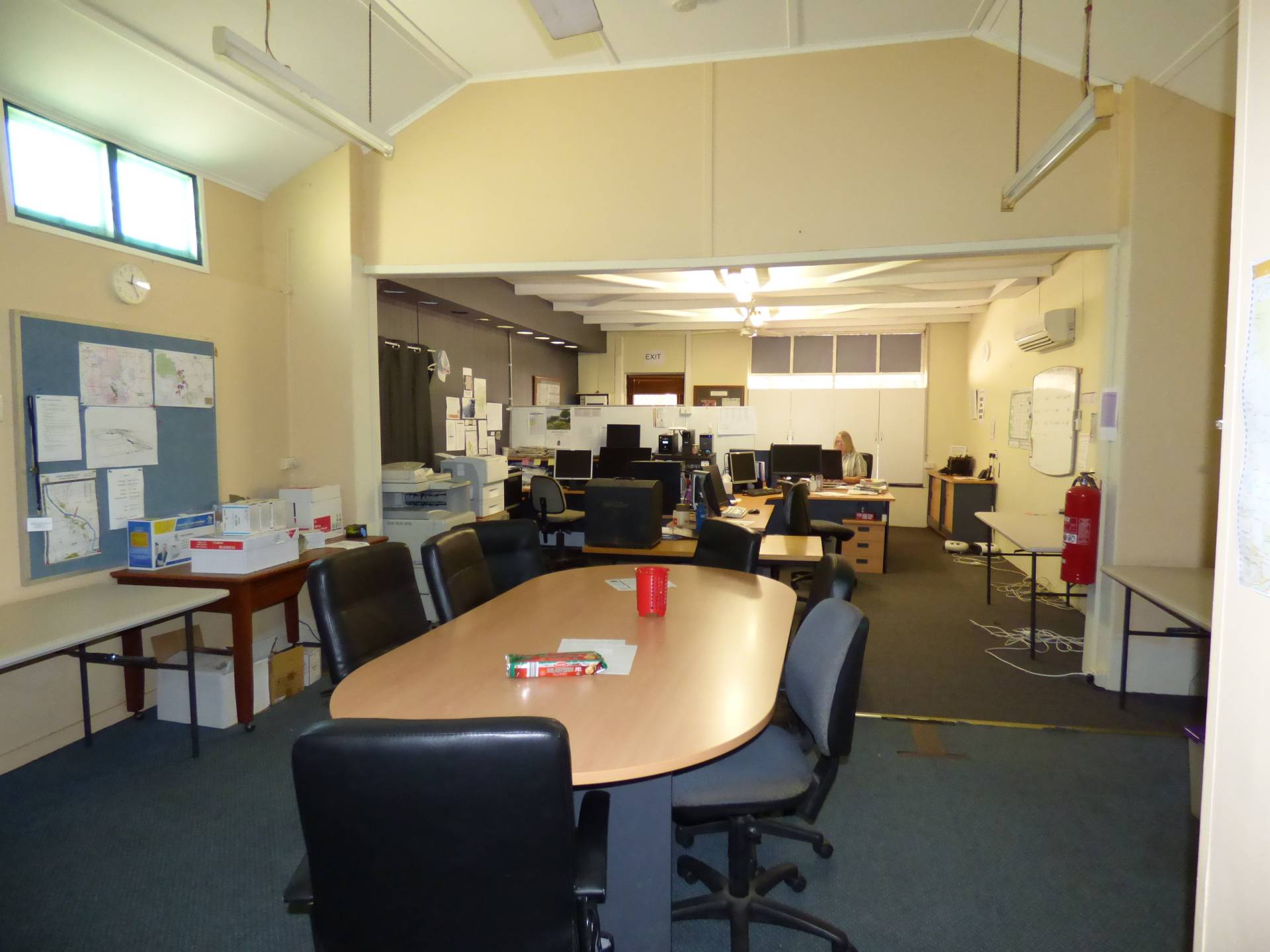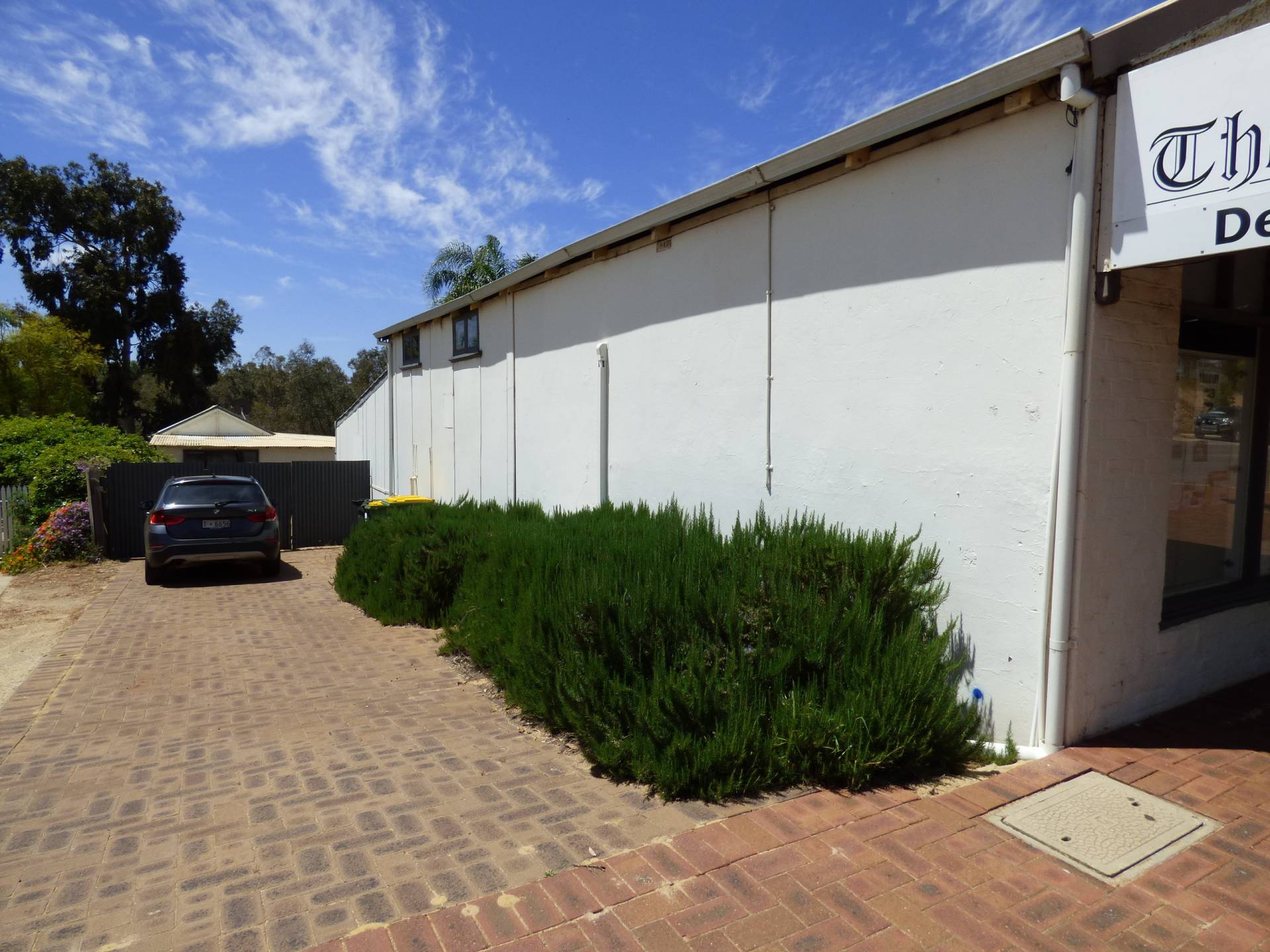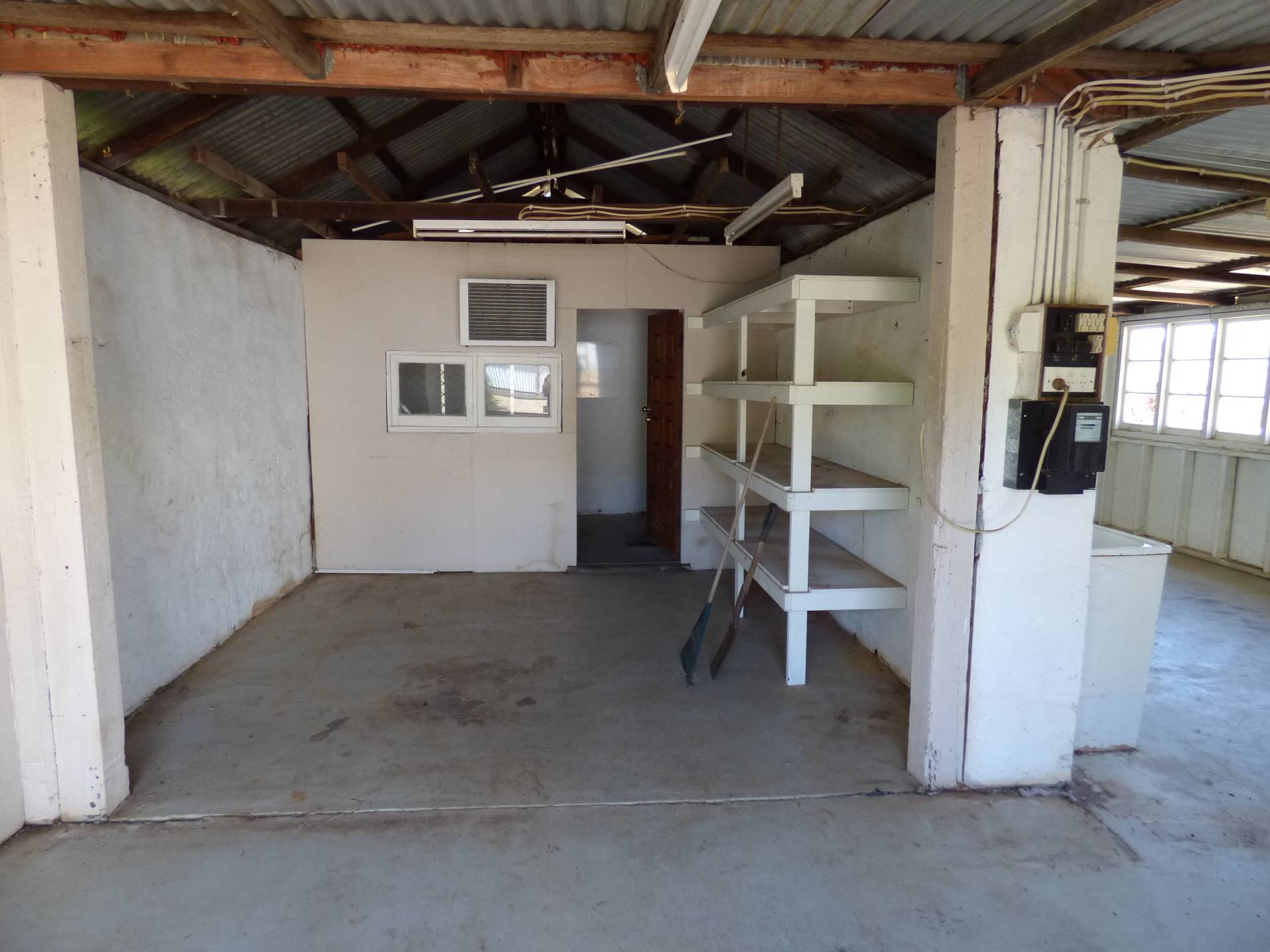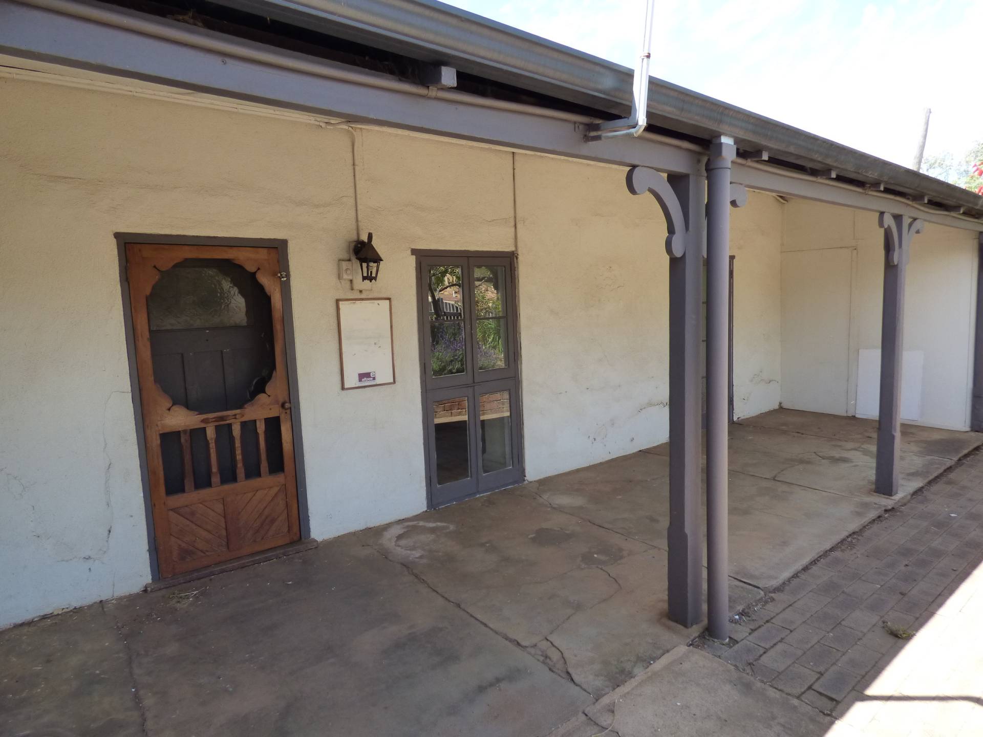 The shop side has a main street frontage window with the front verandah, then a central main office area with storage rooms at the rear.
