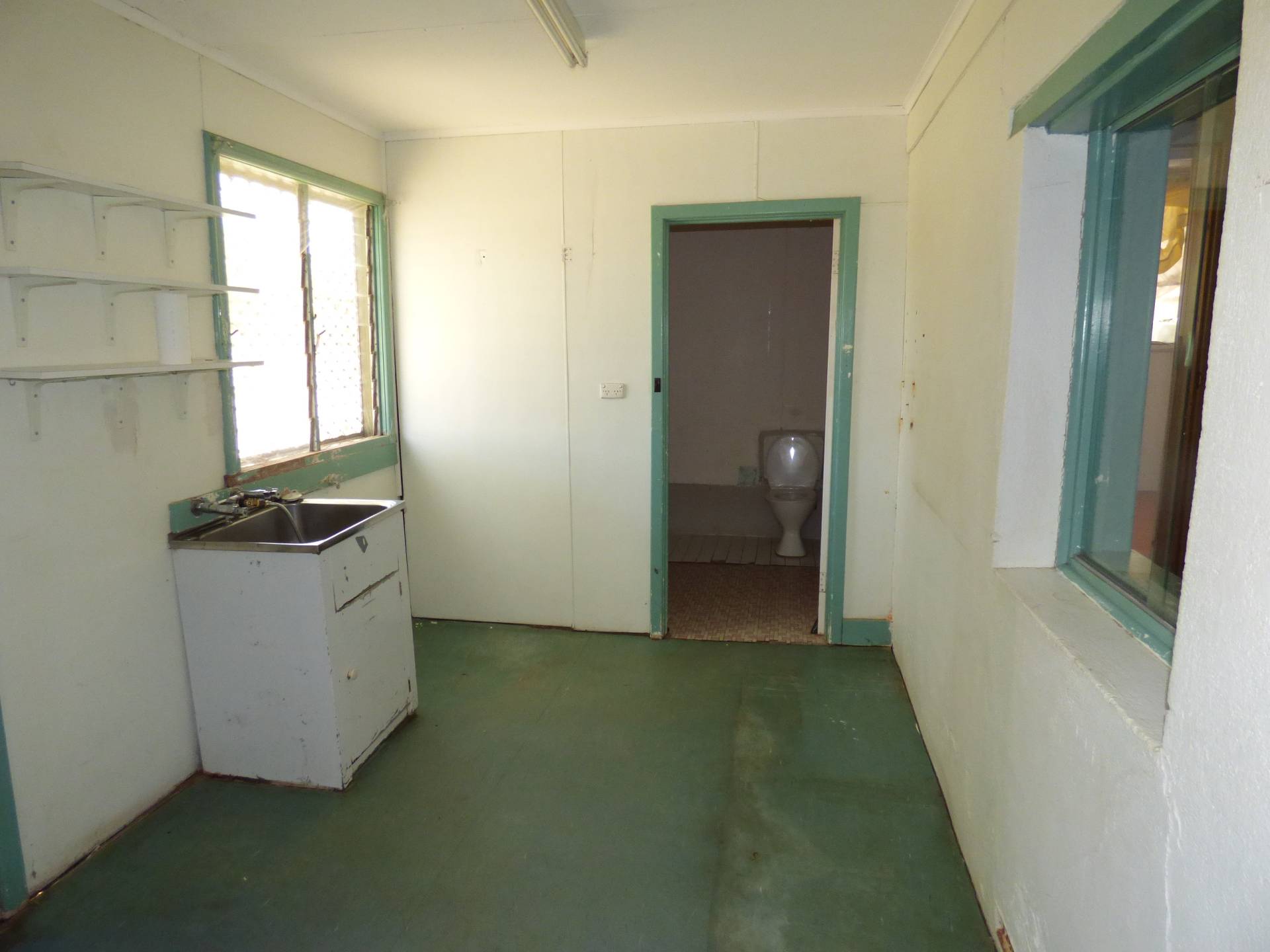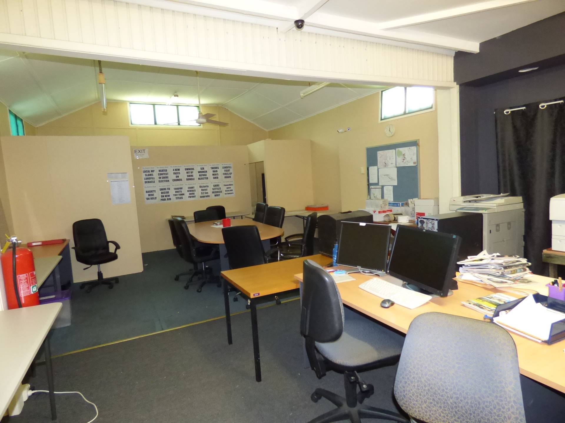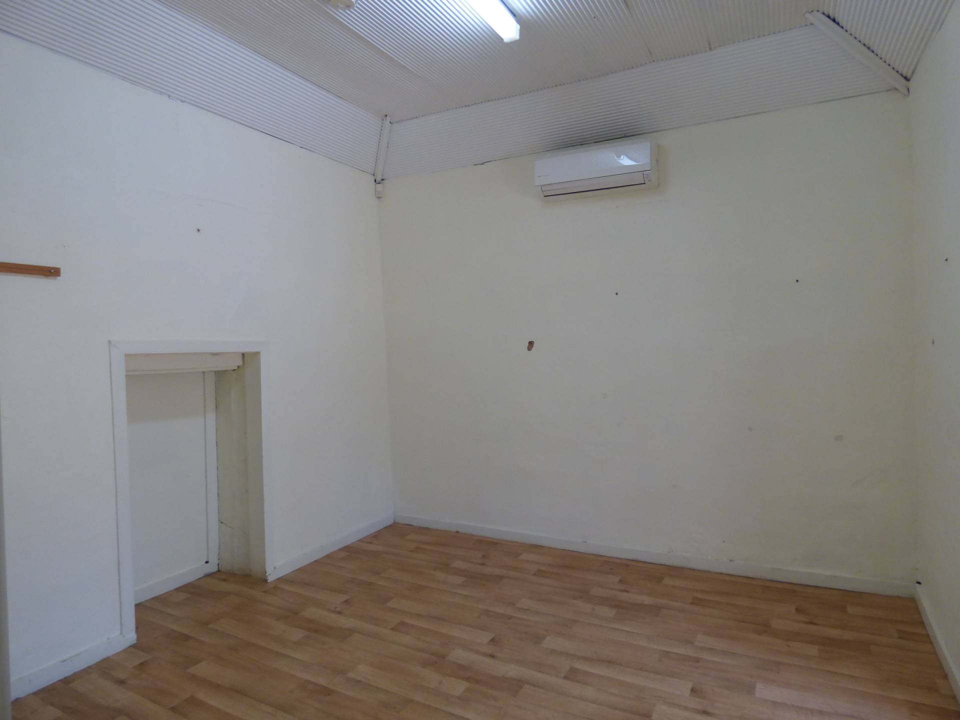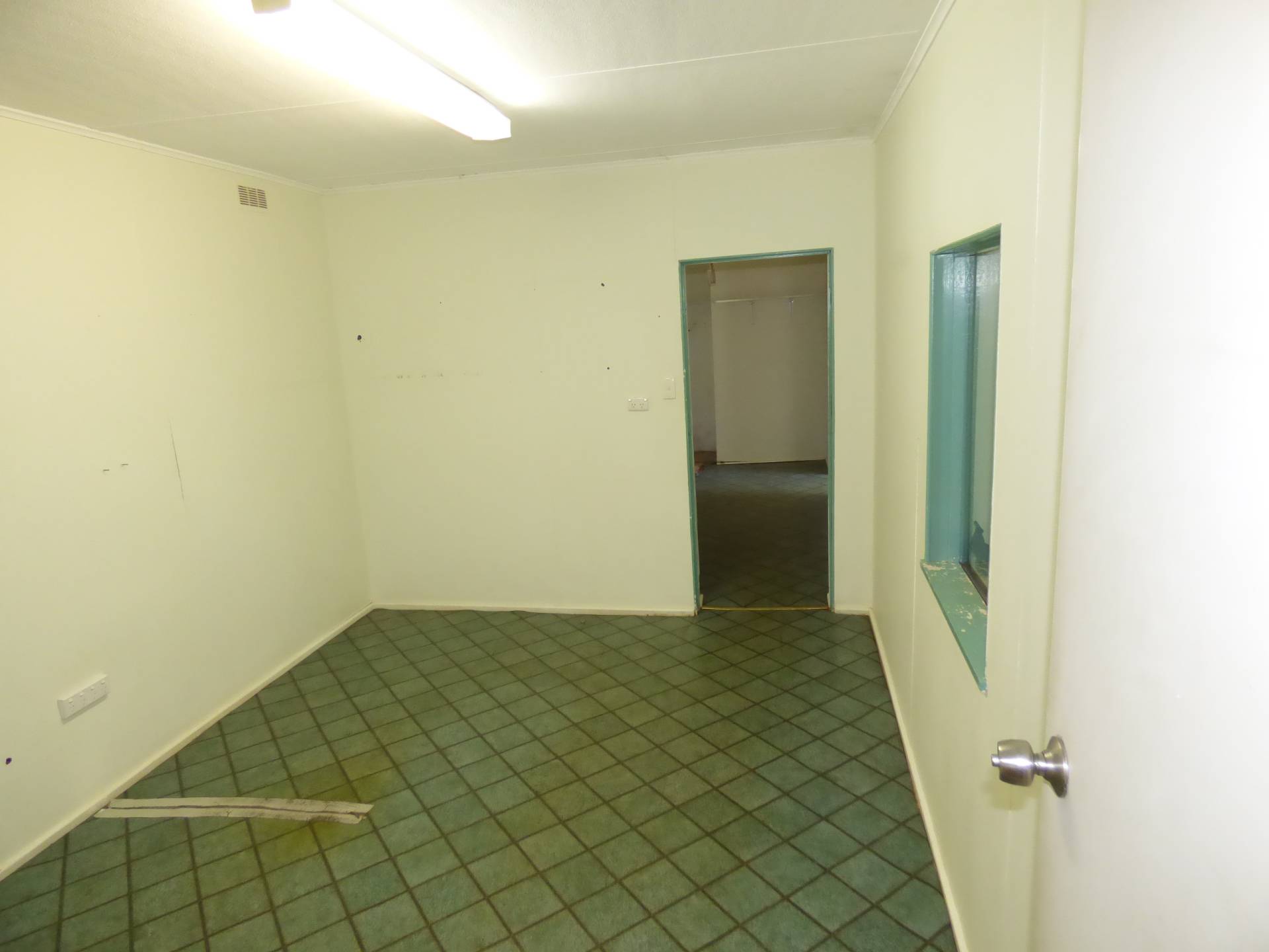 The shop side has a main street frontage window with the front verandah, then a central main office area with storage rooms at the rear.