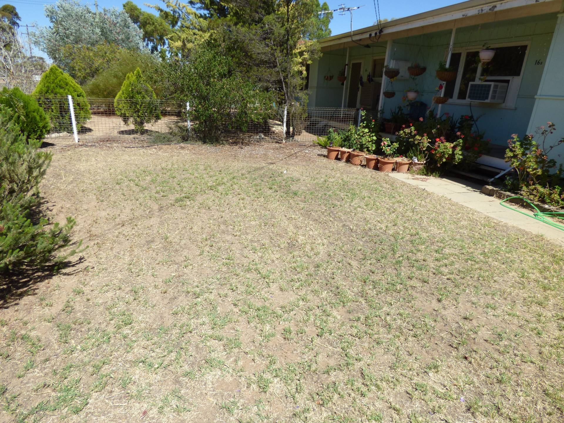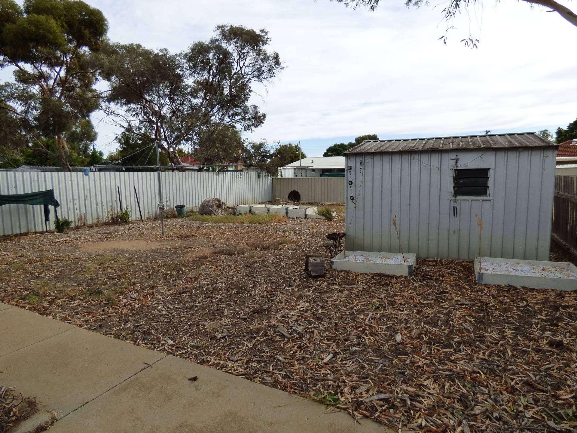 Large enclosed back yard with a small garden shed and a single carport