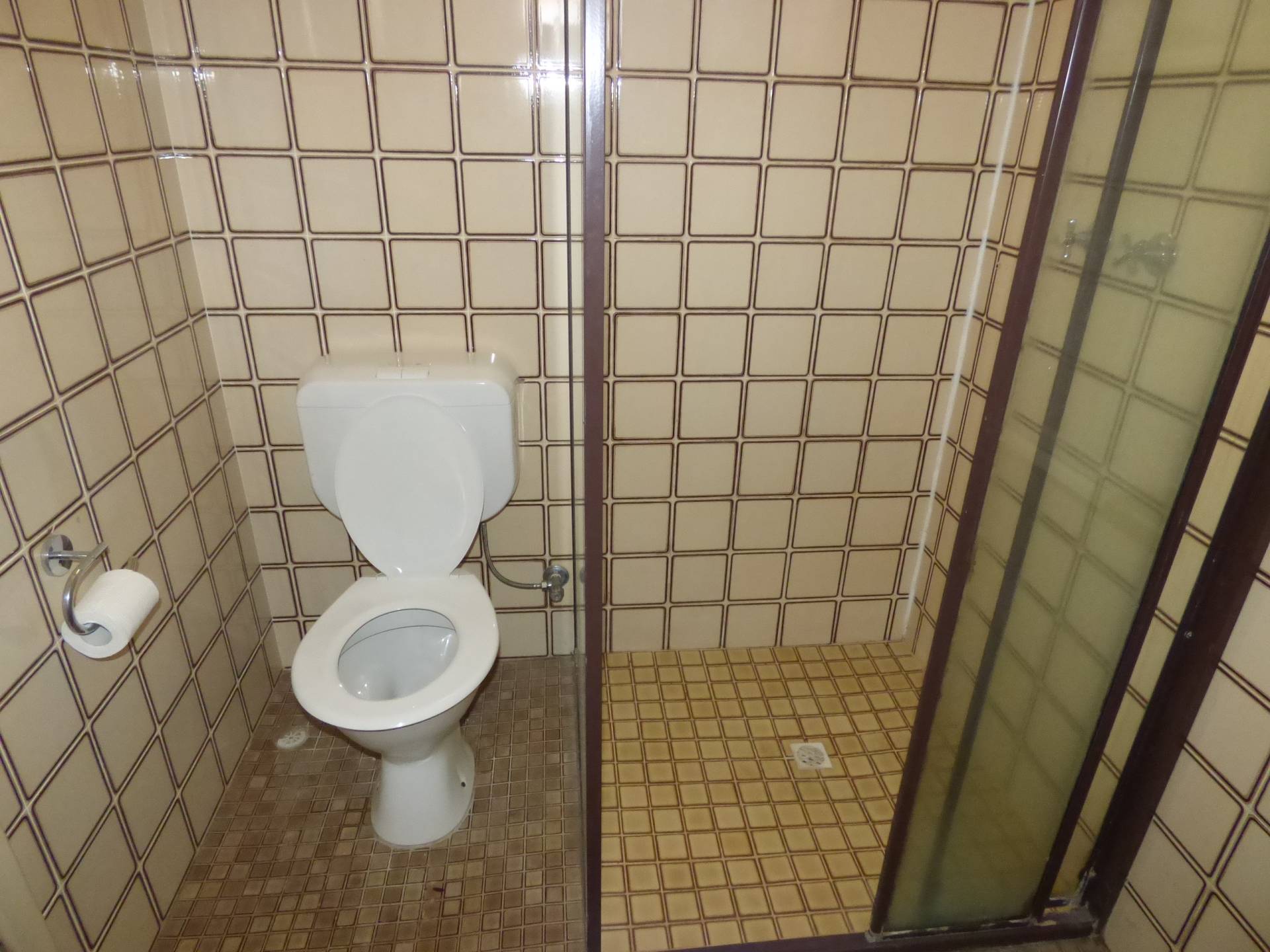 Large main bathroom with separate vanity unit and a shower tucked away in the corner.