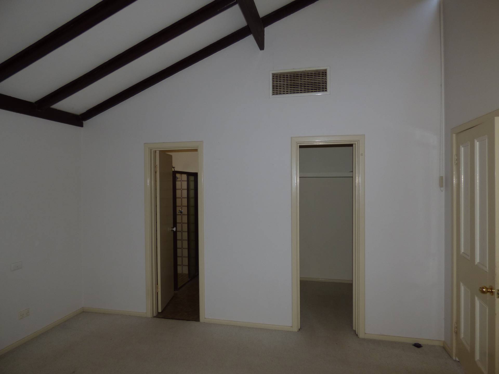 The master bedroom is at the front of the house with high exposed beams and a well appointed ensuite bathroom.