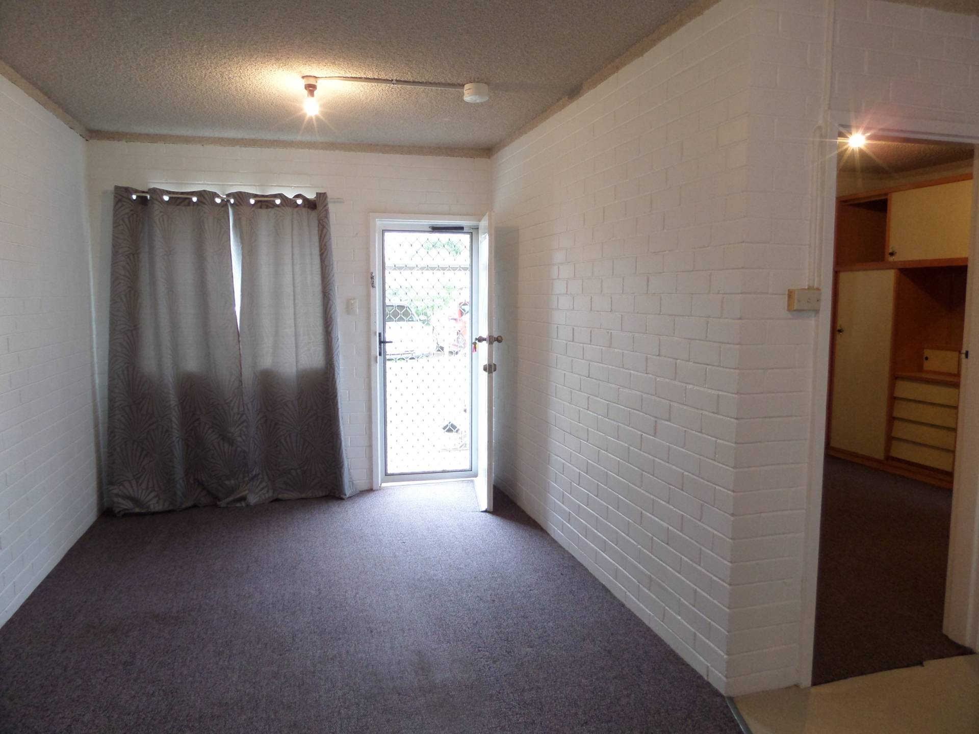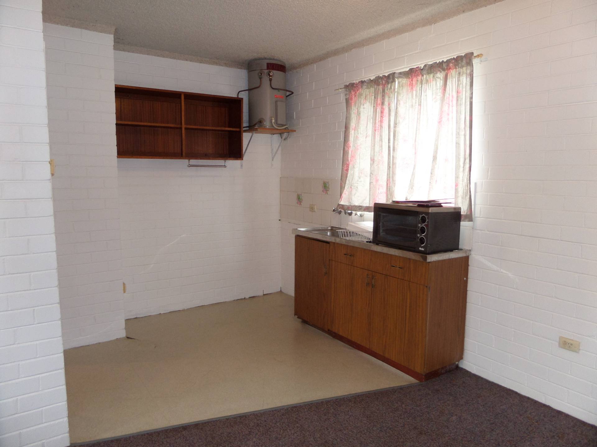 Tidy carpeted front lounge area that stretches into a small kitchen area.