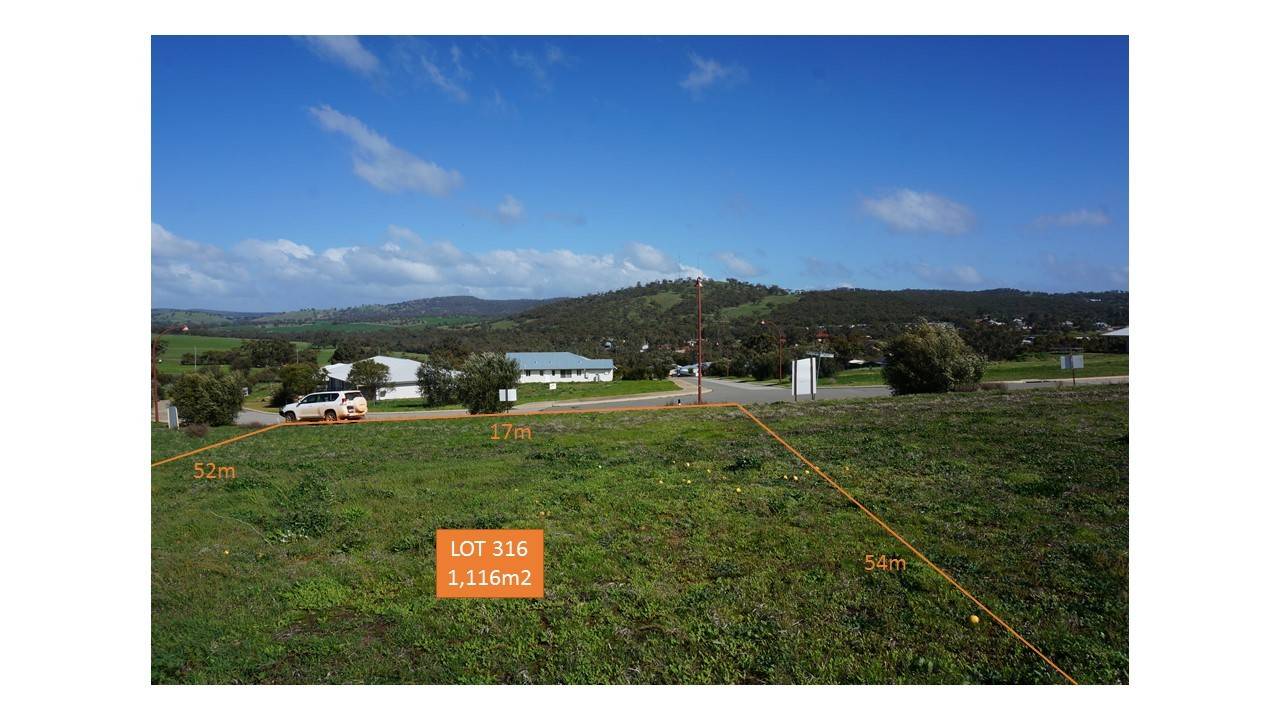 LOT 316 is a fully serviced block in the River Hills Estate, Toodyay. The block is on high ground with gentle - moderate slopes and excellent views, just a few minutes walk to the school or across the river to all the wonderful facilities and opportunities that Toodyay offers - restaurants, cafes, pub, supermarket, hardware, arts and craft, etc.