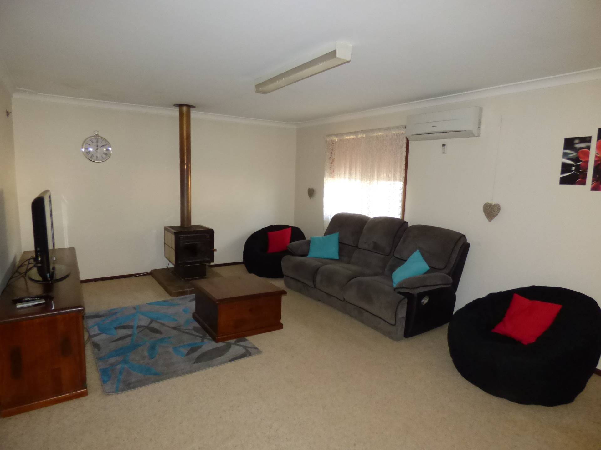 There is a large carpeted lounge room to the front of the house and a fully equipped space to the rear of the house including a split system, wood fire and television system.