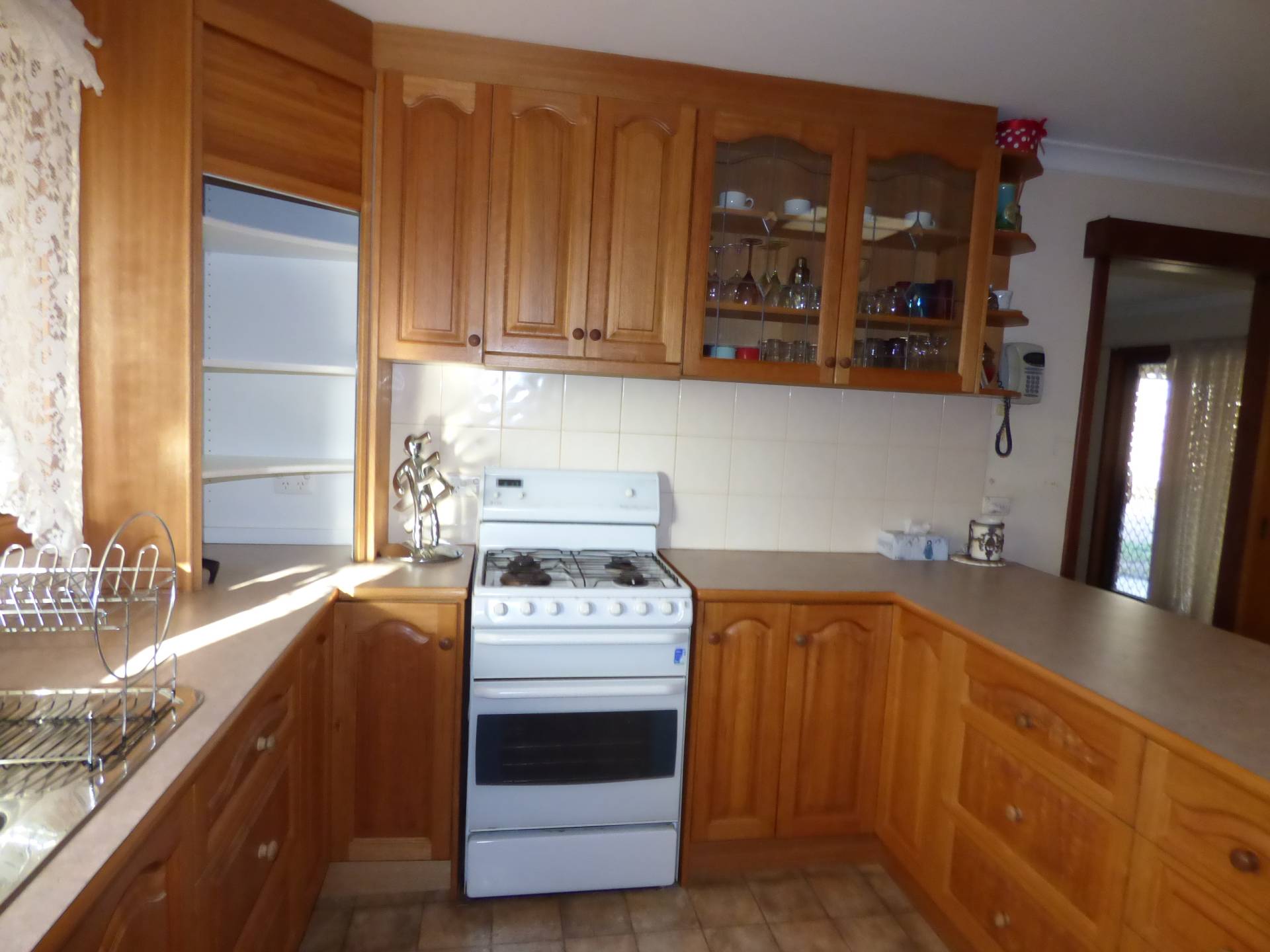 The open plan kitchen and dining has plenty of storage and bench space and a stand-alone gas oven and stovetop.