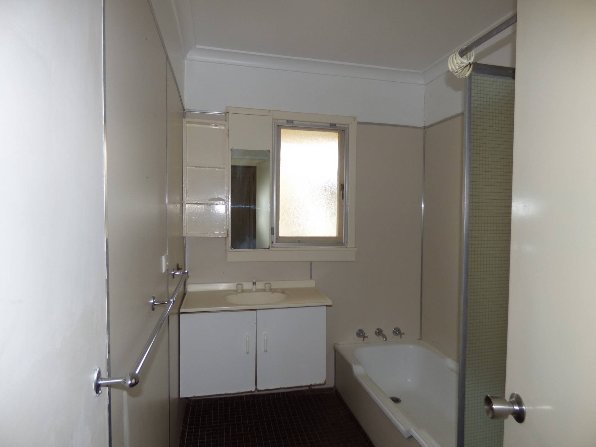 An older styled bathroom is to the rear of the house with a separate shower and bath tub, a vanity unit and overhead storage.
