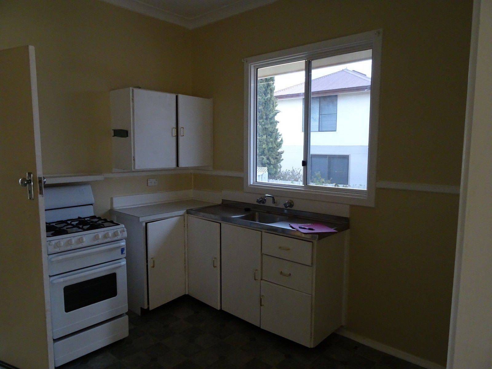 The kitchen has a gas oven and stove – corner cupboard units and above bench shelving.