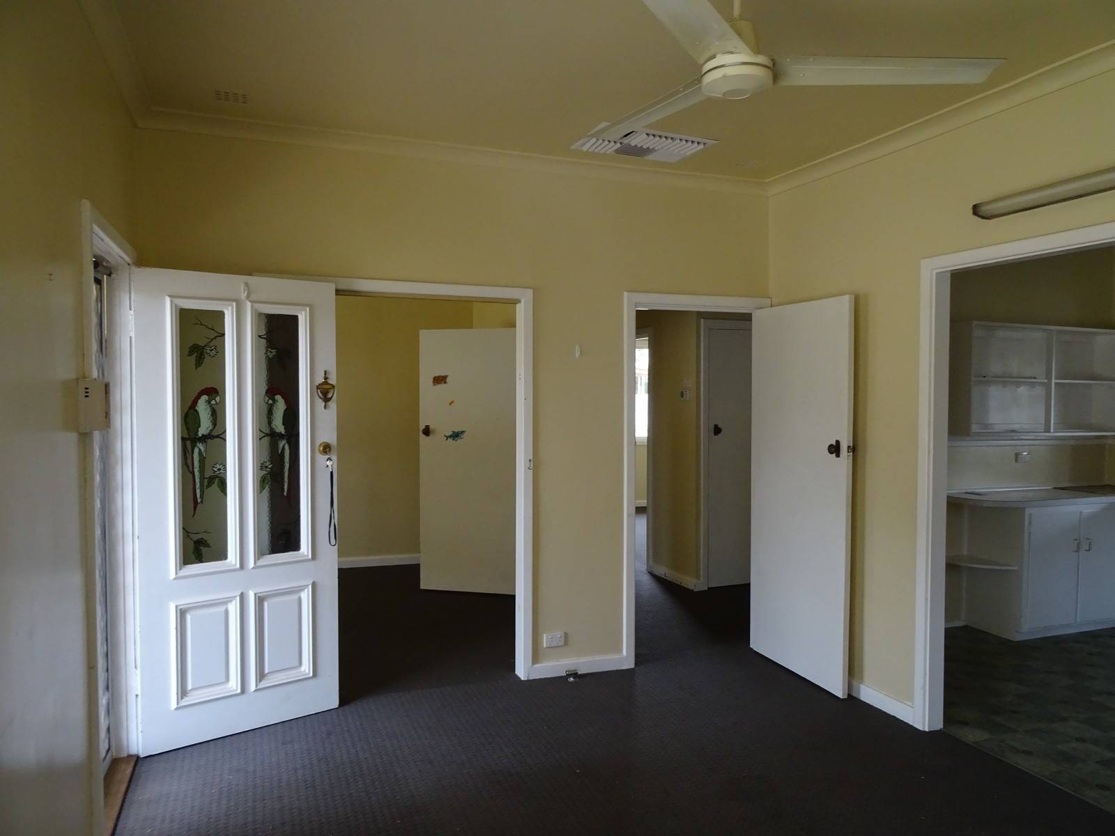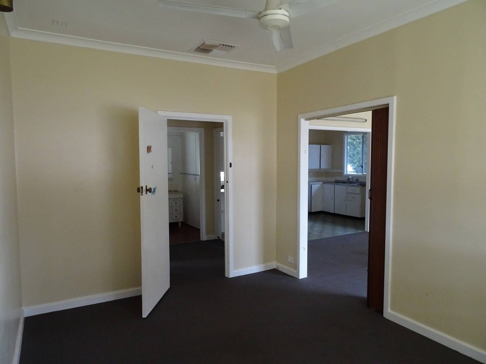 The master bedroom has a ceiling fan and two door ways, one to the lounge and one to the hallway.