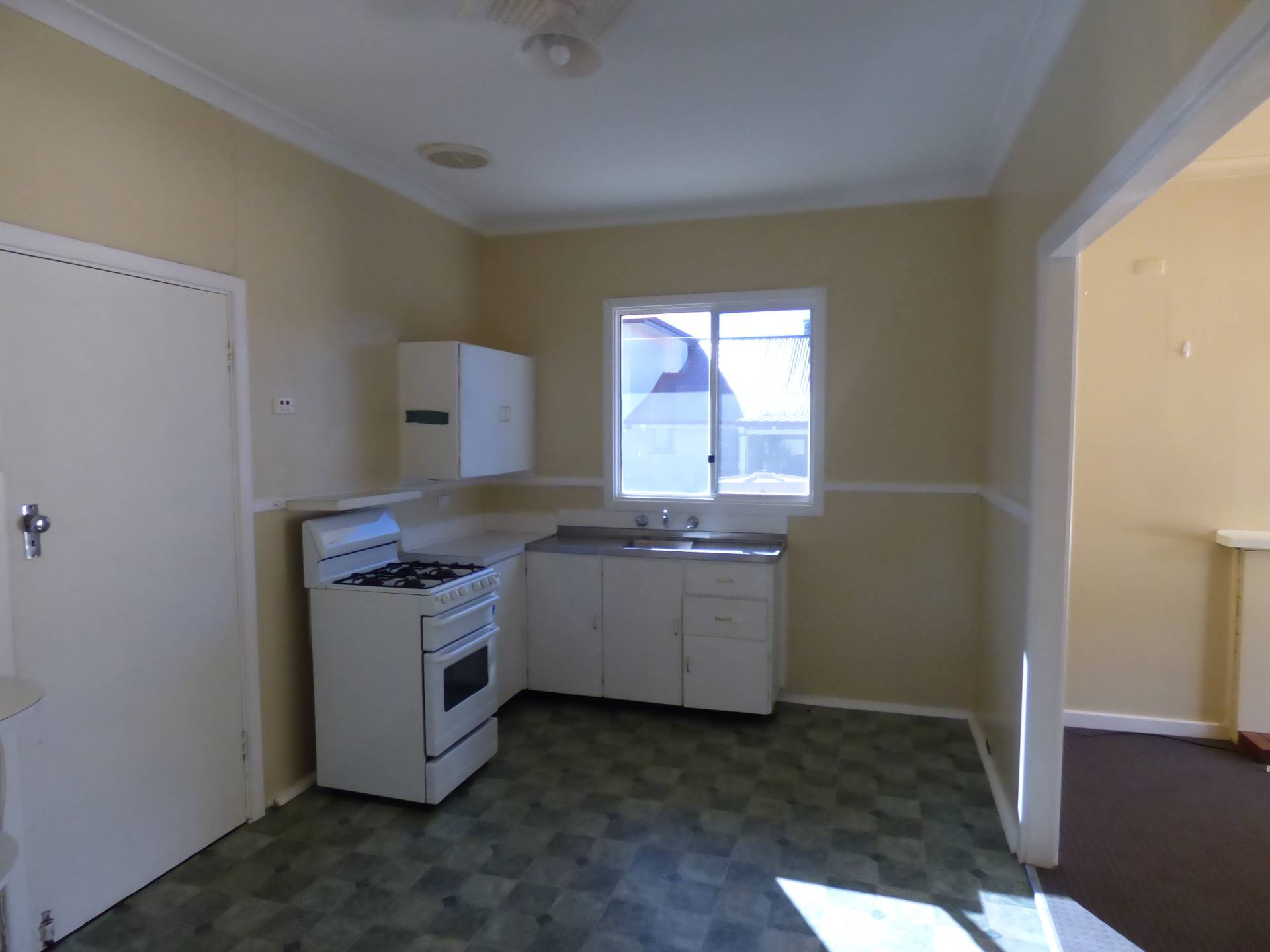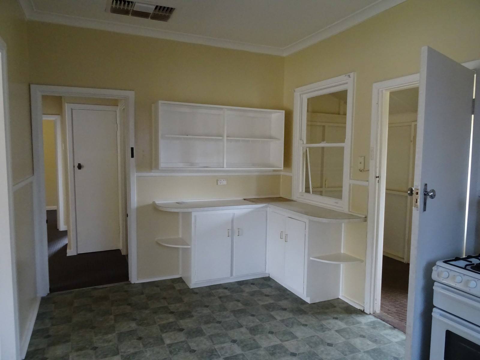 The kitchen has a gas stove and corner cupboards leaving plenty of room for a dining table.